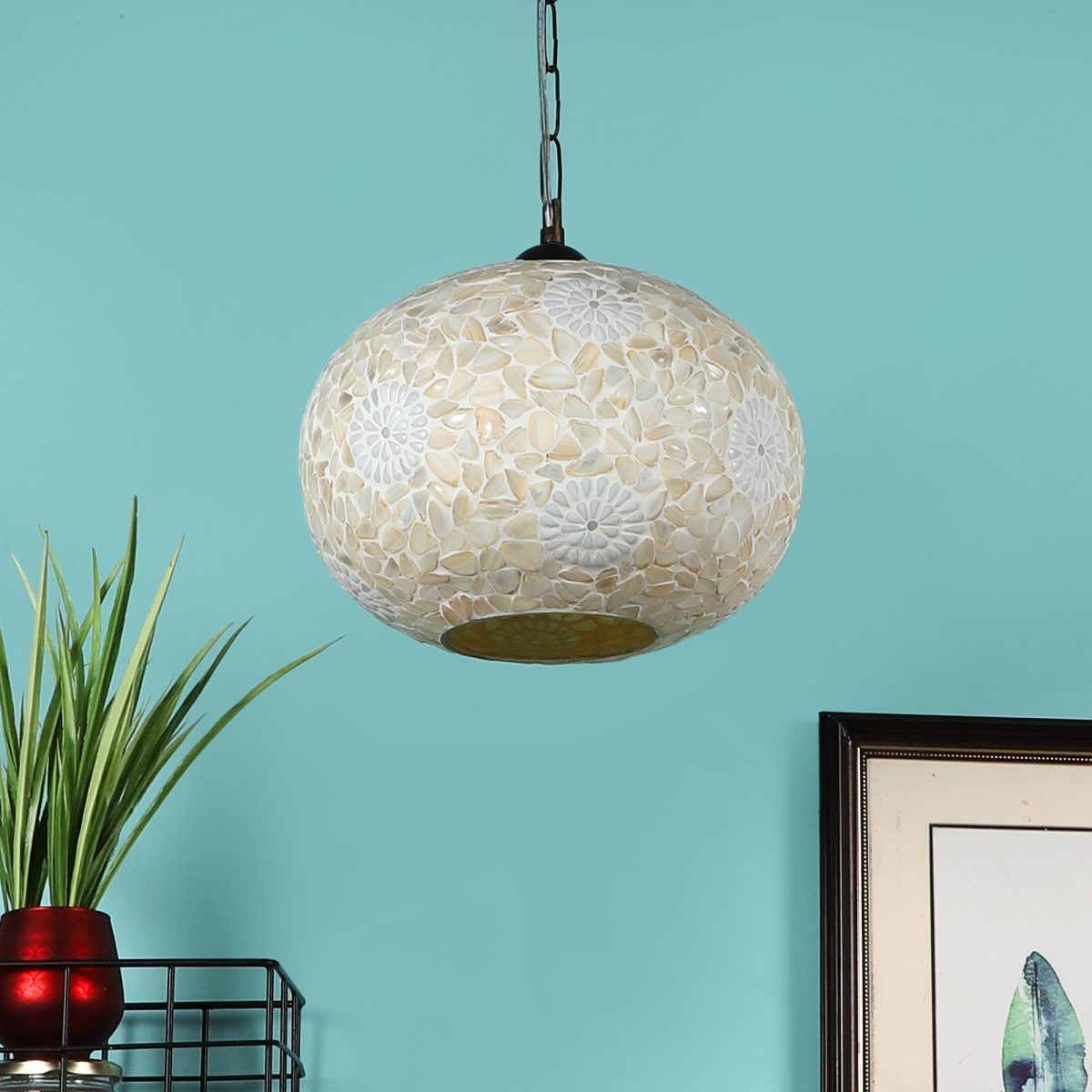 Dark brown (wood) finish, multi colored big doom shaped glass, single hanging light made of mild steel and glass. When lit it highlights a colorful geometric / floral design. The suspension can be adjusted at time of installation to the desired height. It is maintenance free, easy to remove glass and wash them, comes with an E27 holder, only the change of lamp is required, which is available locally everywhere. Application includes both residential and commercial premises wherever it matches with your interiors. Can be customized as per requirement in case of bulk quantities. Lamp not included.
