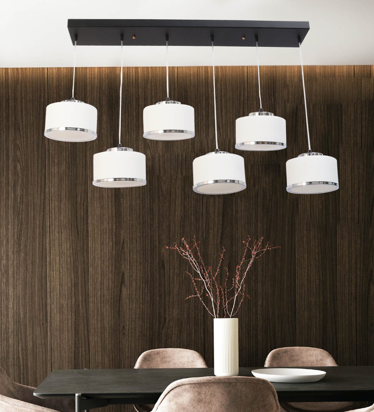 Rectangular hanging light having six lamps. Can be customised as per requirement in terms height, number of lamps. LAMPS NOT INCLUDED.