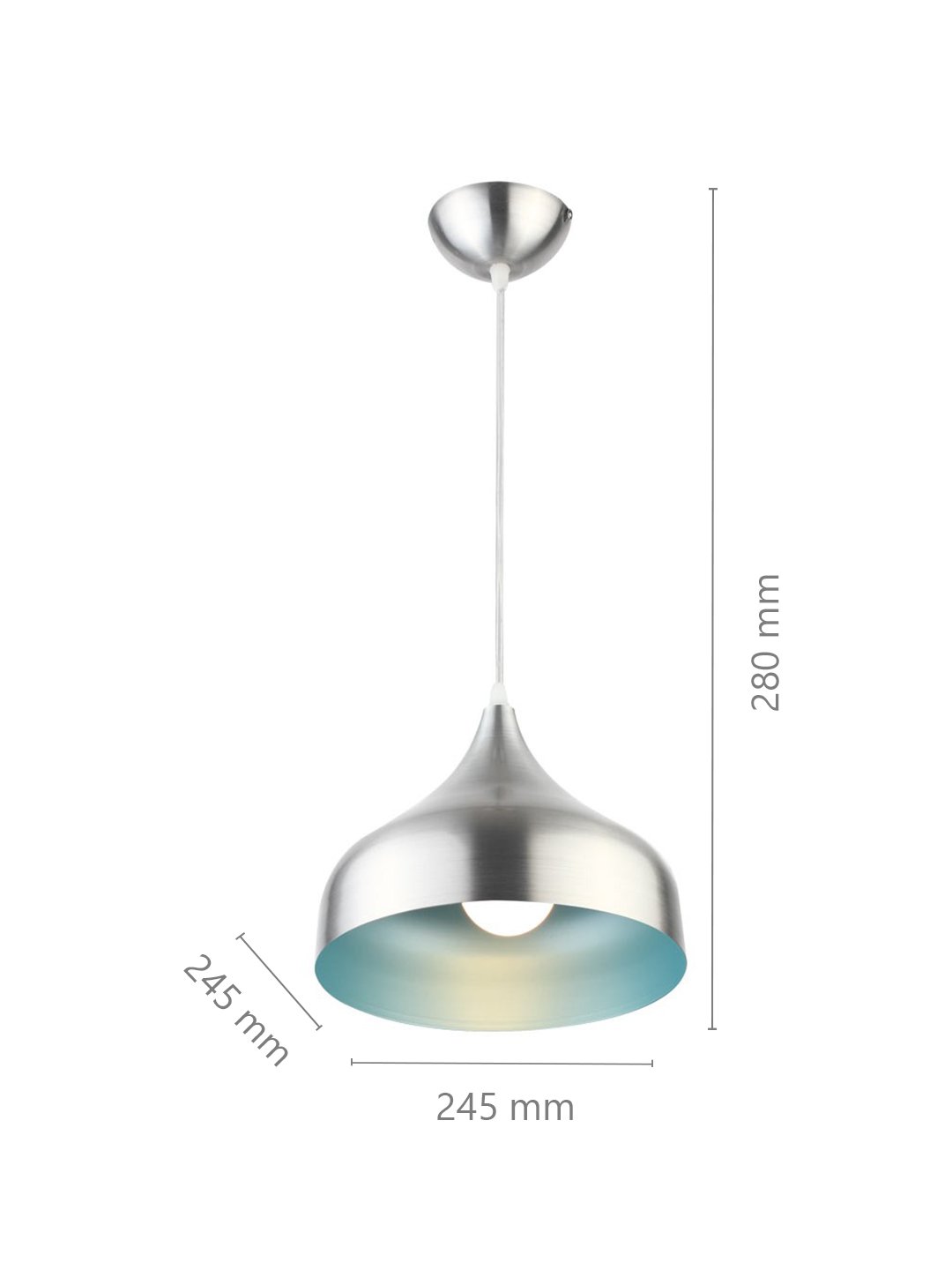 Silver (satin nickel)-blue finish, modern aluminum single hanging light. The suspension can be adjusted at time of installation to the desired height. It is maintenance free, comes with an E27 holder, only the change of lamp is required, which is available locally everywhere. LED filament lamp is recommended for a graceful appearance. Application includes both residential and commercial premises wherever it matches with your interiors. Codes of other hanging variation in same design – HL3886-3, HL3886-1, HL3887-3, HL3887-1, HL3888-1, HL3888-3, HL3889-1, HL3889-3, HL3890-1, HL3890-3, HL3891-1, HL3891-3, HL3892-1, HL3892-3, HL3899, HL3917-G, HL3917-P, HL3917-Y, HL3922, HL3933-1, HL3918-3. Can be customized as per requirement in case of bulk quantities. Lamp not included.