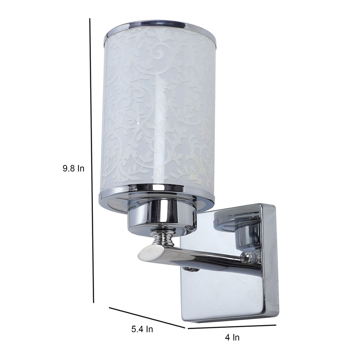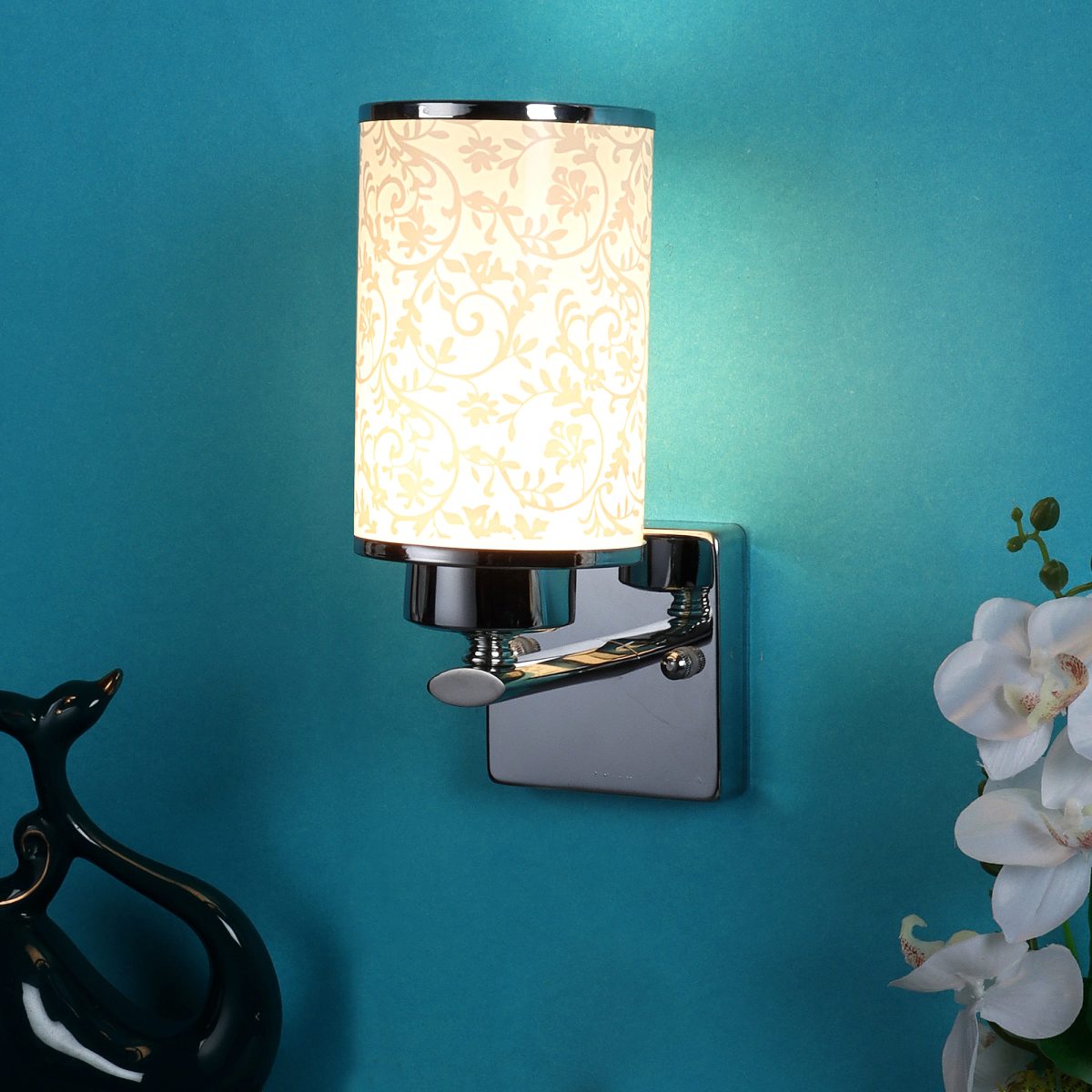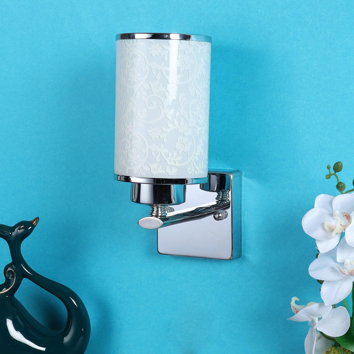 Modern silver (chrome) single wall light made of mild steel, with a big round cylindrical white glass with a nice floral design having chrome ring at both its edges. Design looks amazing when lit. It is maintenance free, easy to remove glass and wash it, comes with an E27 holder, only the change of lamp is required, which is available locally everywhere. You can of course swap out the bulb for one that is dimmable, has a higher light output or a different color temperature. Application includes both residential and commercial premises wherever it matches with your interiors. Double wall light code – WL2440. Can be customized as per requirement in case of bulk quantities. Lamp not included.