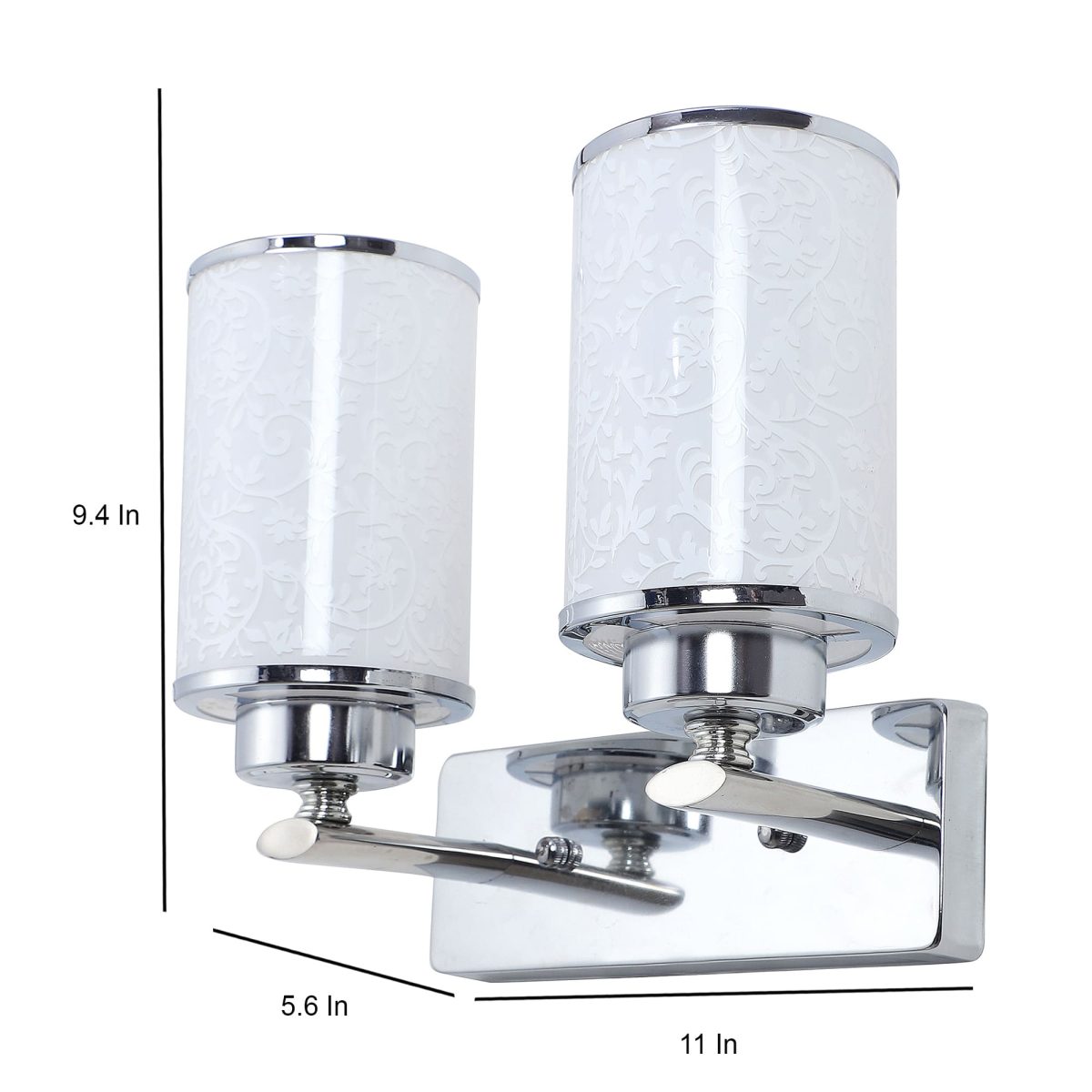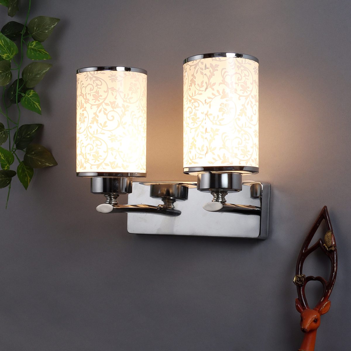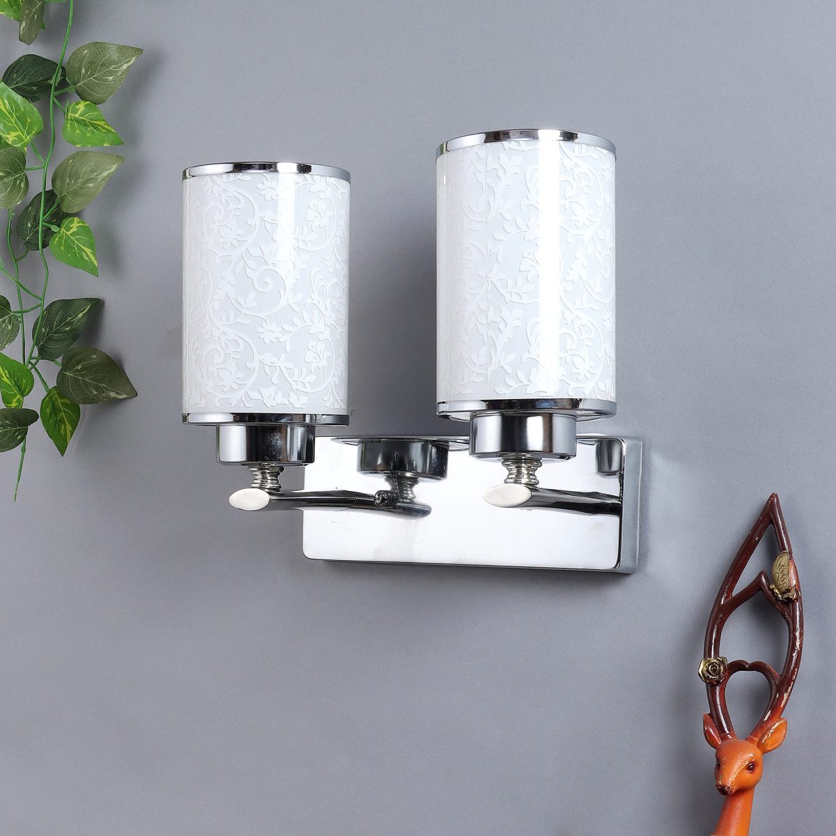 Modern silver (chrome) double wall light made of mild steel, with big round cylindrical white glasses with nice floral design having chrome ring at both its edges. Design looks amazing when lit. It is maintenance free, easy to remove glass and wash it, comes with an E27 holder, only the change of lamp is required, which is available locally everywhere. You can of course swap out the bulb for one that is dimmable, has a higher light output or a different color temperature. Application includes both residential and commercial premises wherever it matches with your interiors. single wall light code – WL2439. Can be customized as per requirement in case of bulk quantities. Lamp not included.