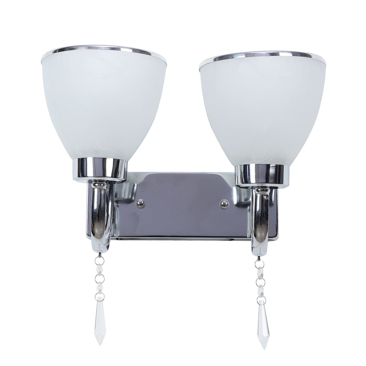 Modern silver (chrome) double wall light made of mild steel, with taper self texture designed glasses having chrome ring at its edges. Design looks amazing when lit. It is maintenance free, easy to remove glass and wash it, comes with an E27 holder, only the change of lamp is required, which is available locally everywhere. You can of course swap out the bulb for one that is dimmable, has a higher light output or a different color temperature. Application includes both residential and commercial premises wherever it matches with your interiors. Matching single wall light code – WL2451. Can be customized as per requirement in case of bulk quantities. Lamp not included.