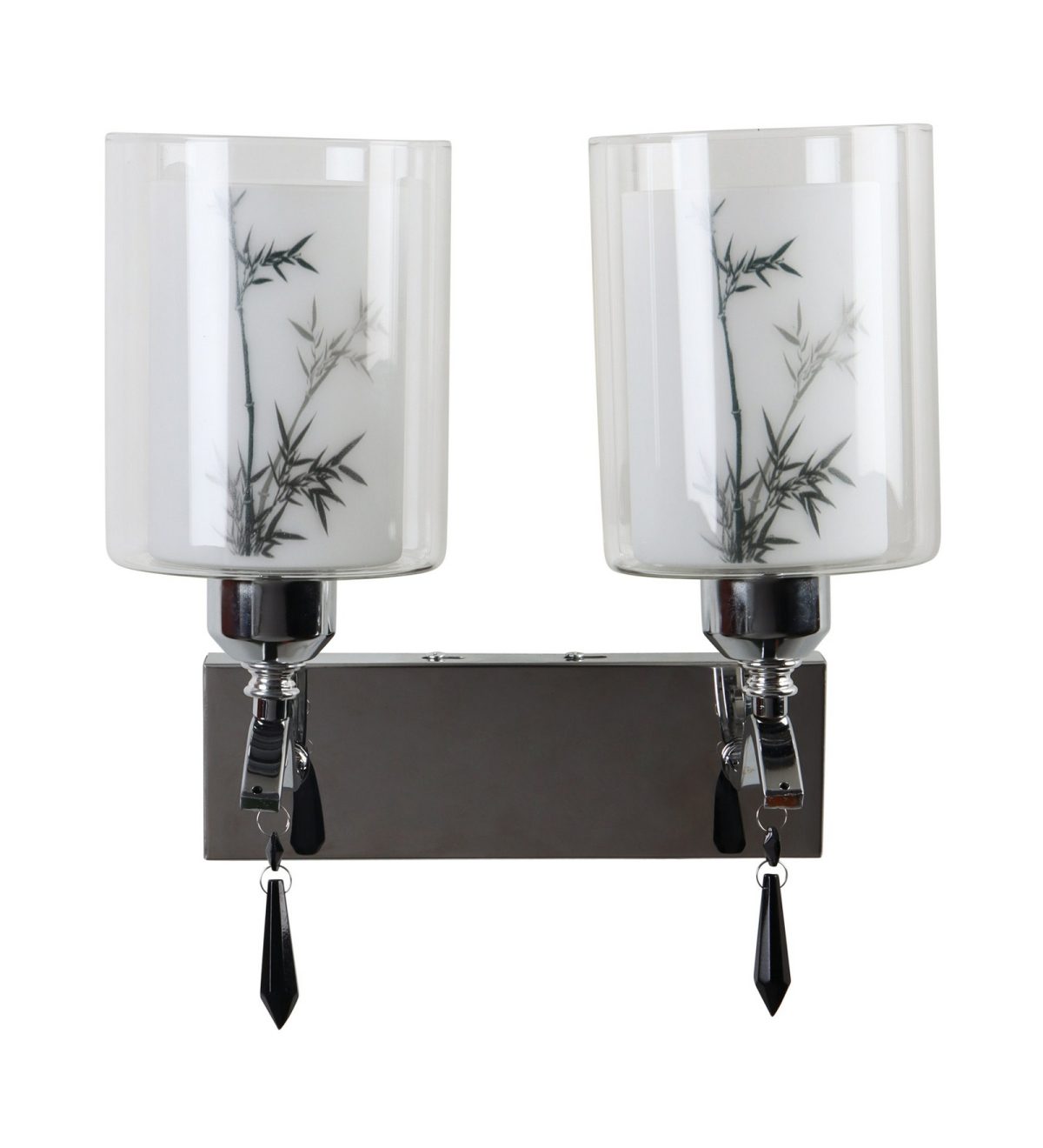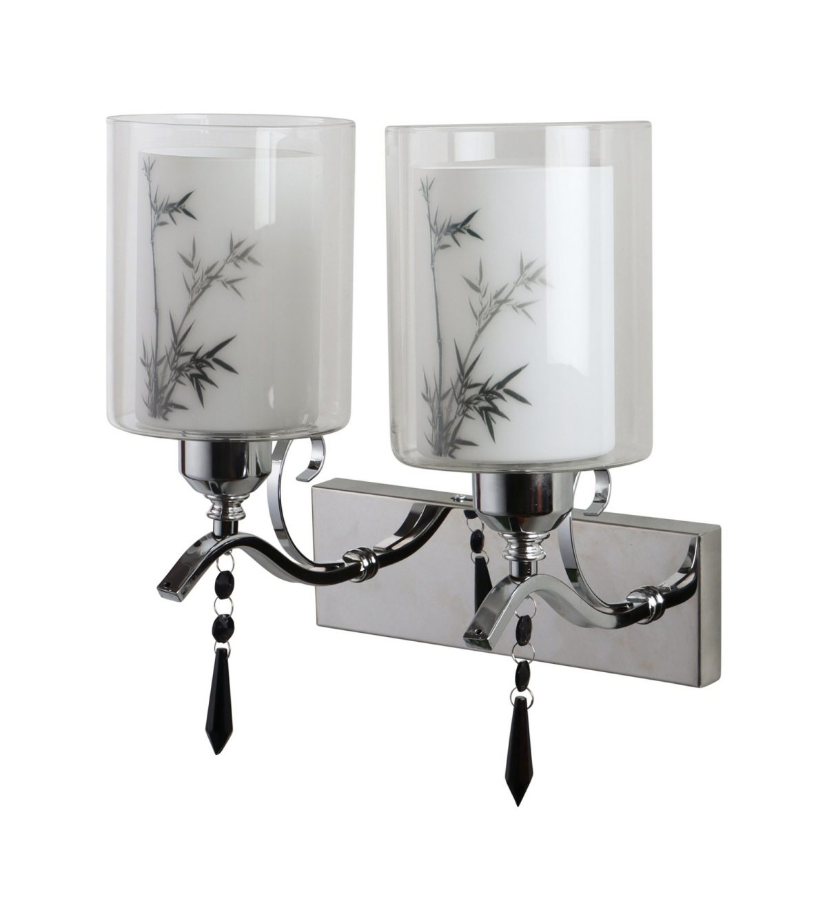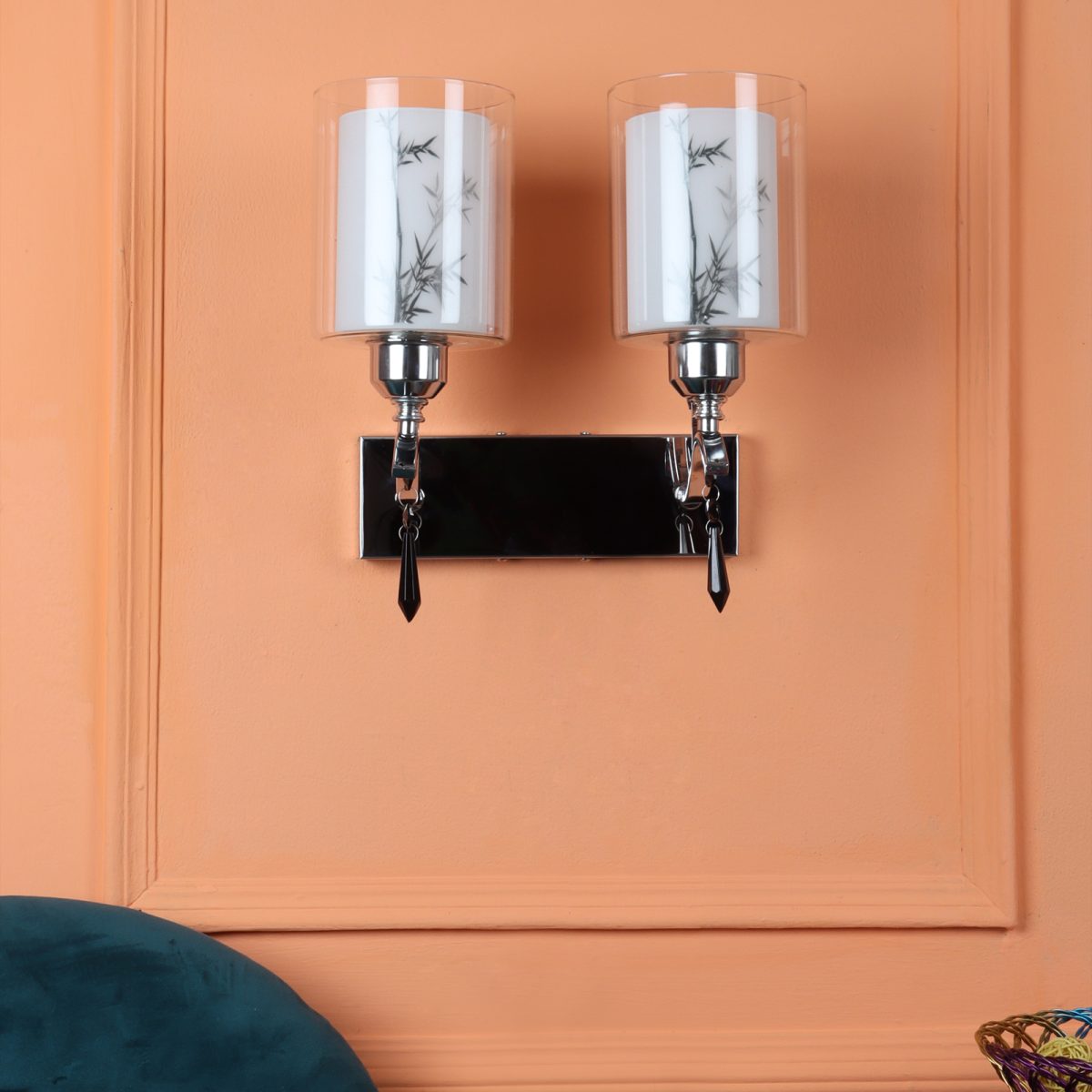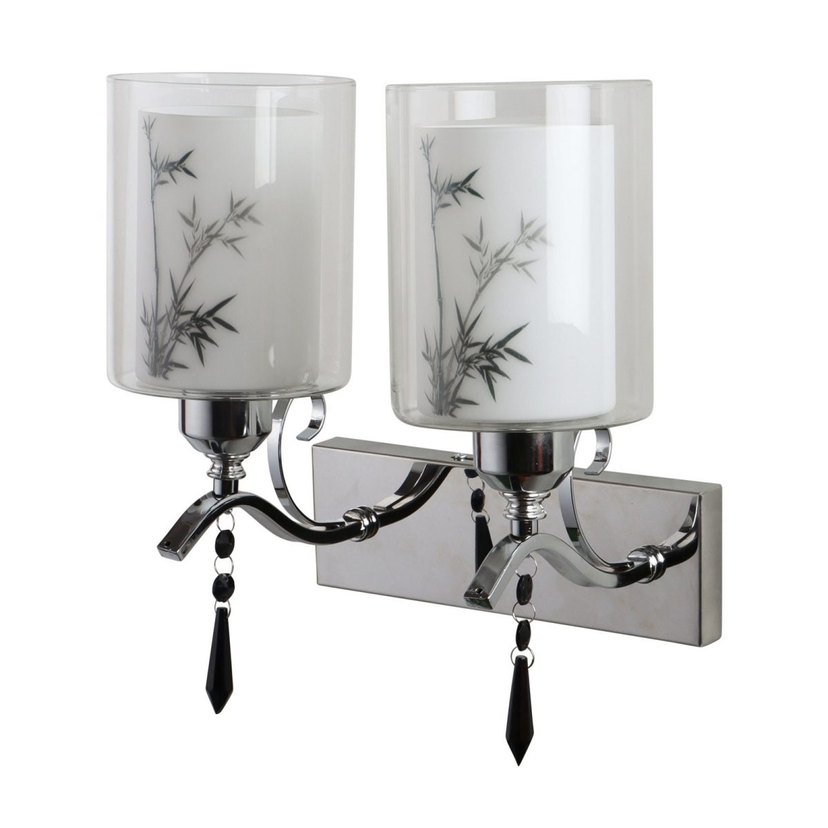 Silver (chrome) finish double wall light with double layered white glass with a printed design. It is maintenance free, comes with an E27 holder, only the change of lamp is required, which is available locally everywhere. Application includes both residential and commercial premises wherever it matches with your interiors. Matching single wall light code – WL2687. LAMP NOT INCLUDED.
