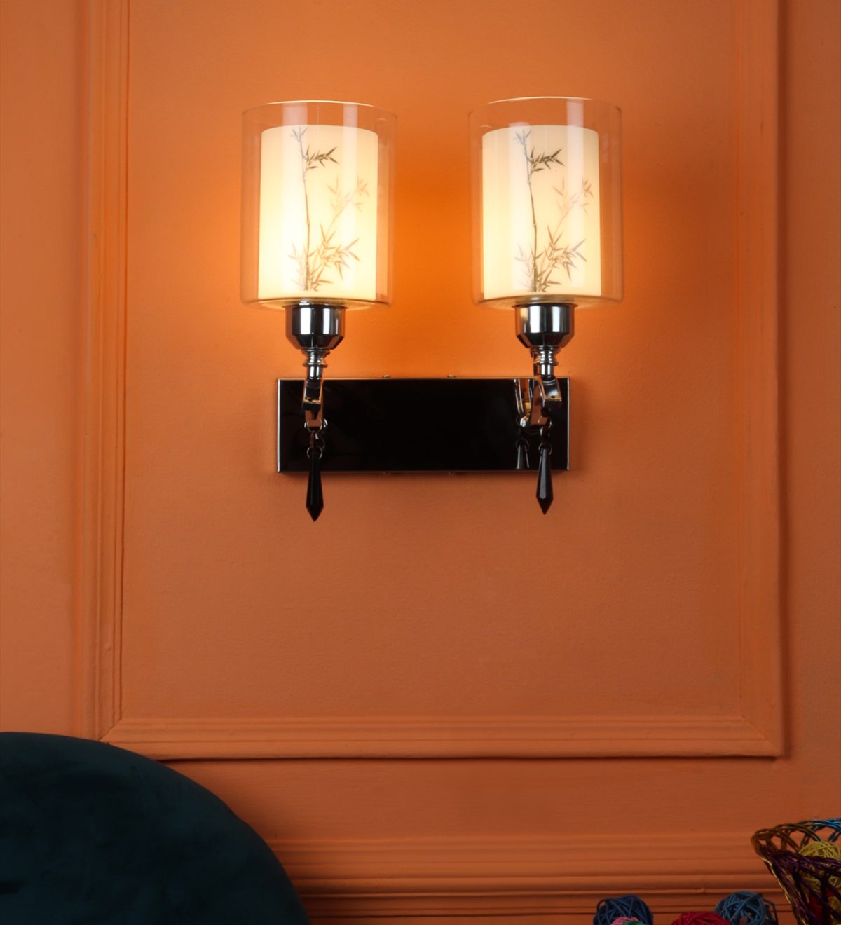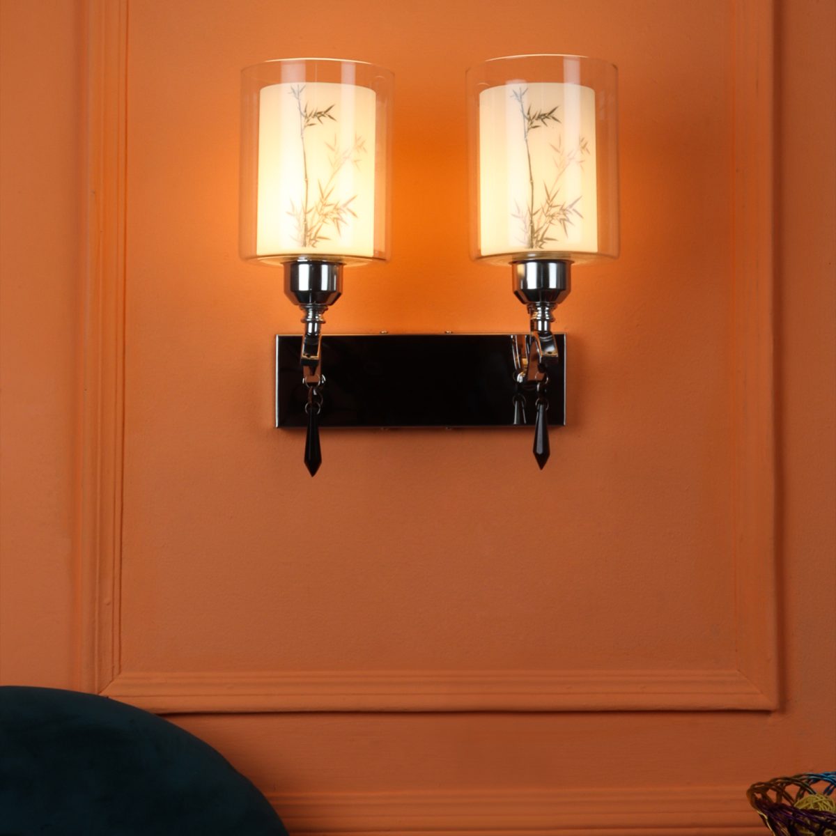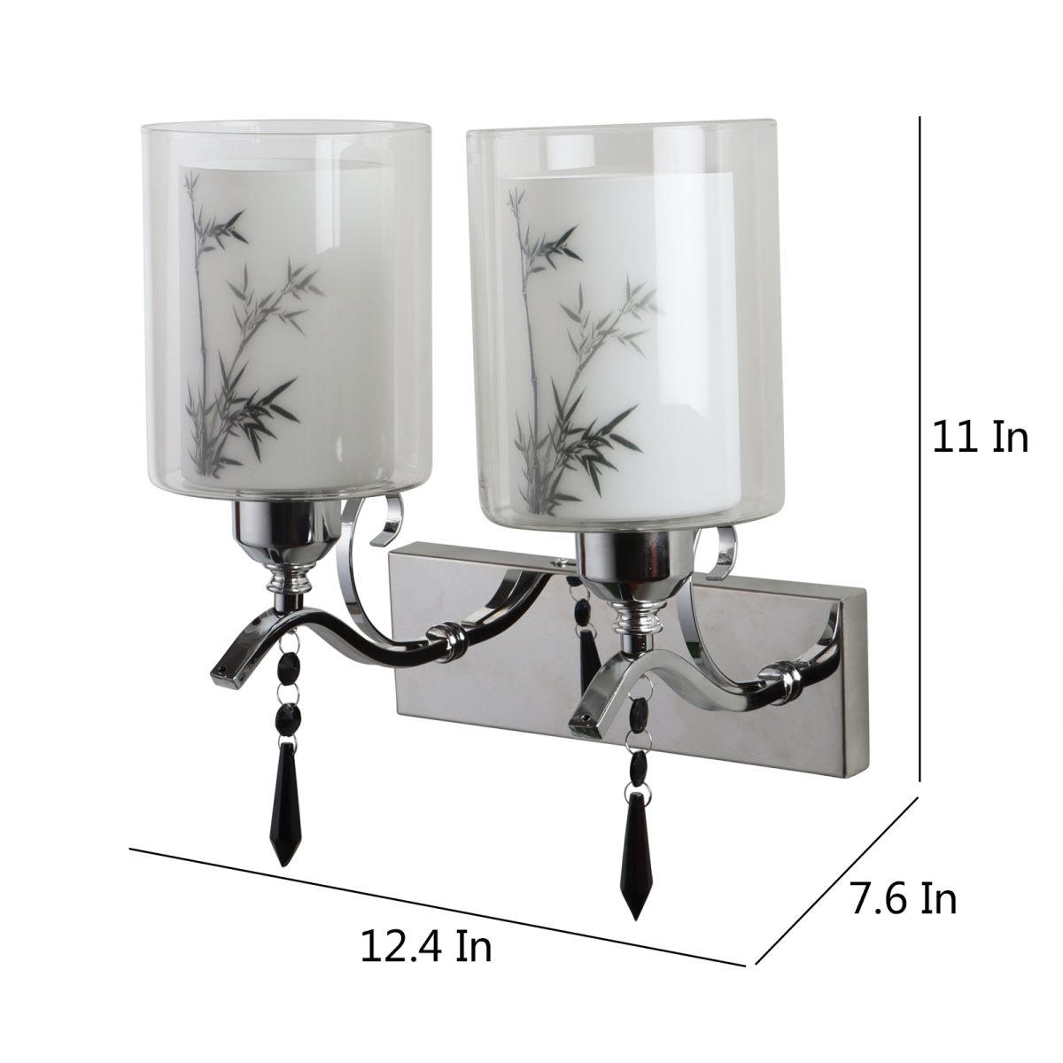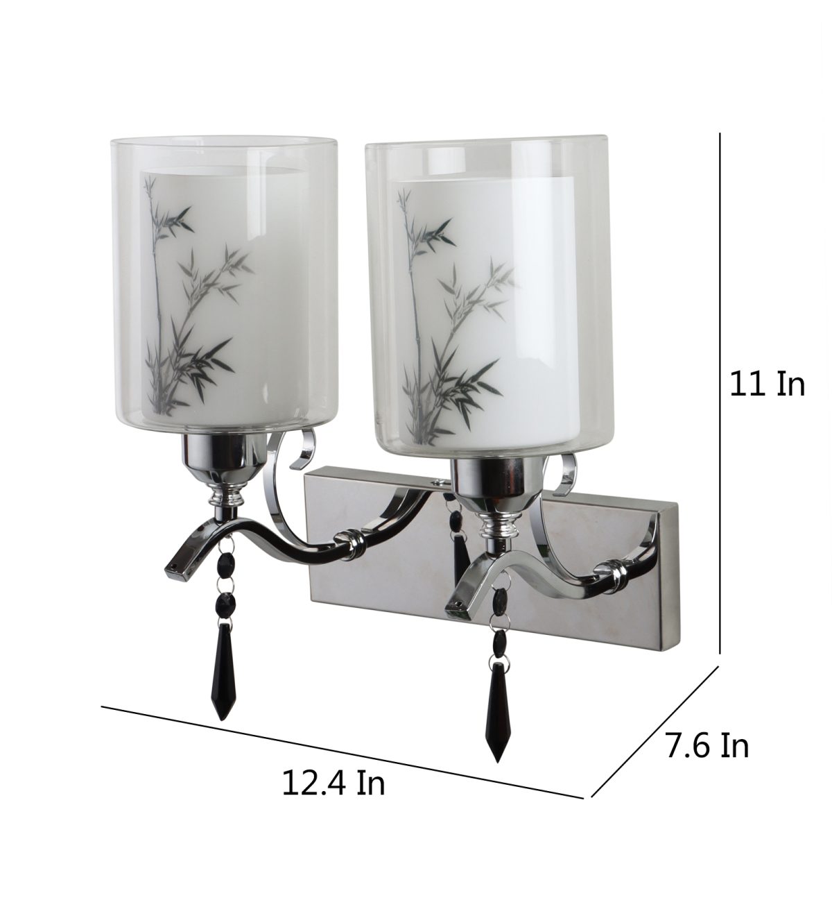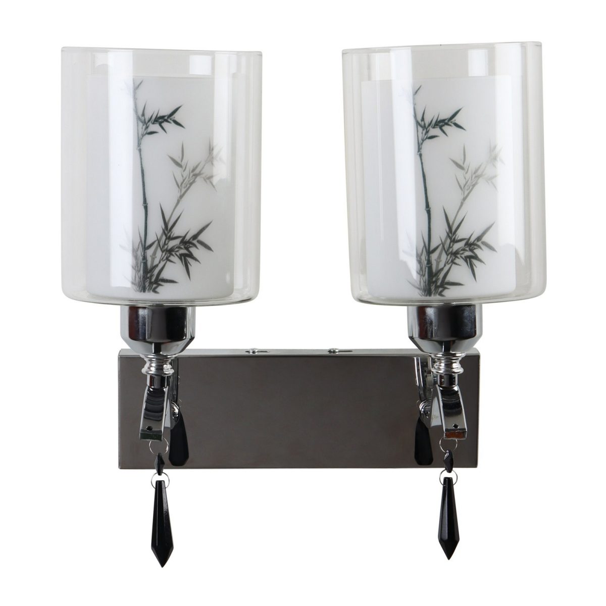 Silver (chrome) finish double wall light with double layered white glass with a printed design. It is maintenance free, comes with an E27 holder, only the change of lamp is required, which is available locally everywhere. Application includes both residential and commercial premises wherever it matches with your interiors. Matching single wall light code – WL2687. LAMP NOT INCLUDED.