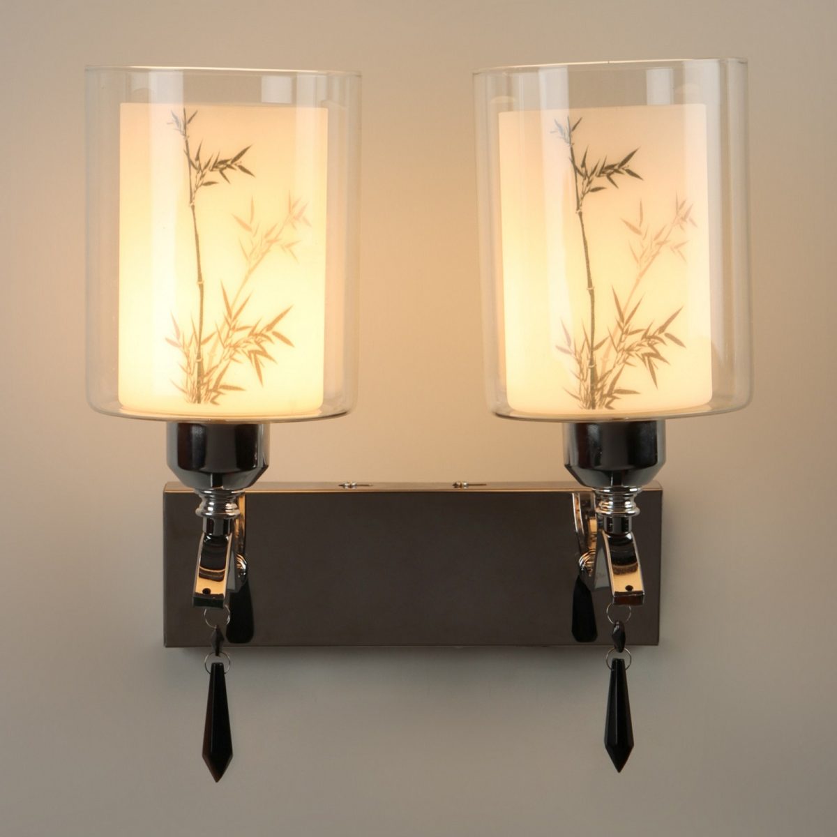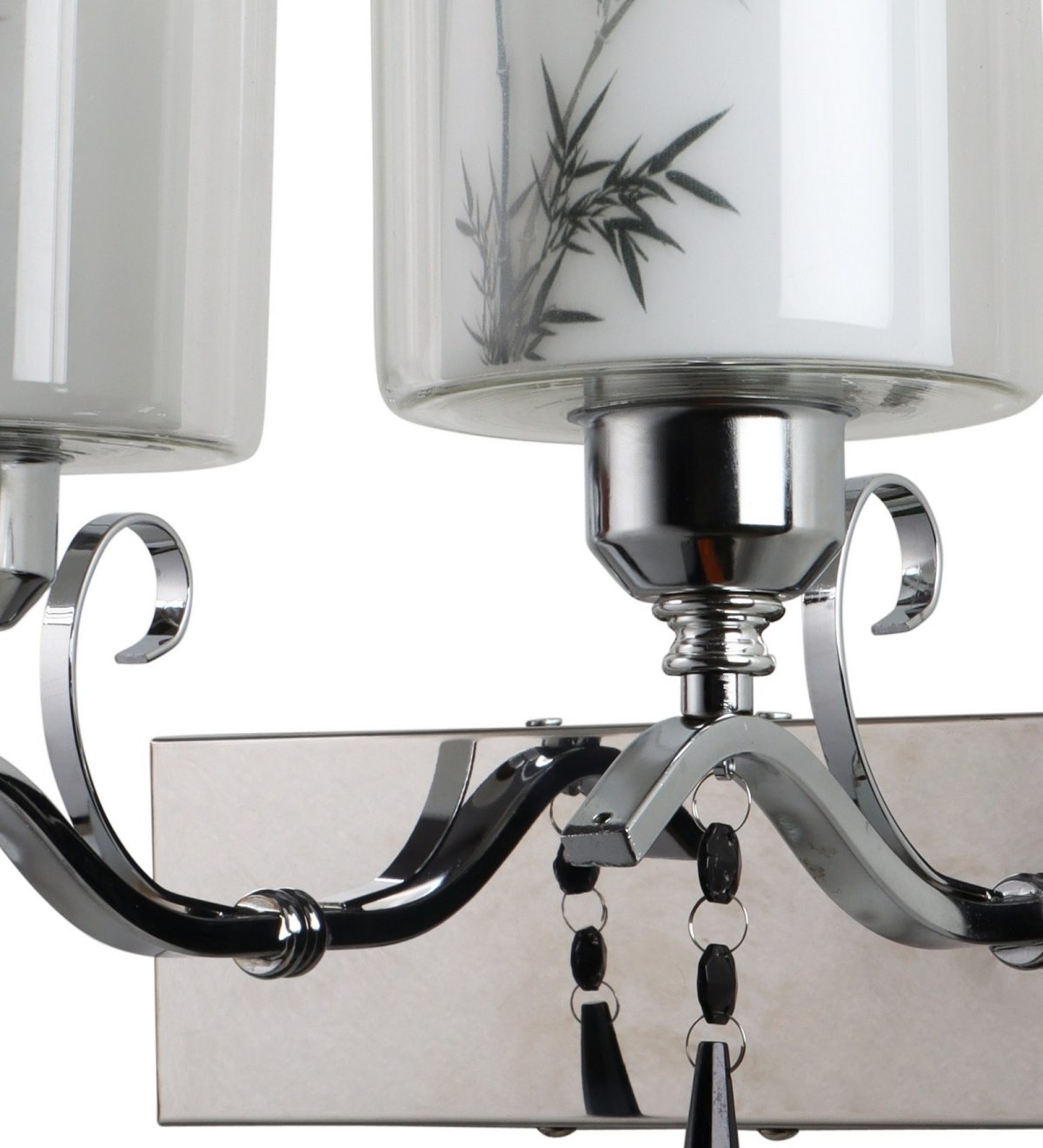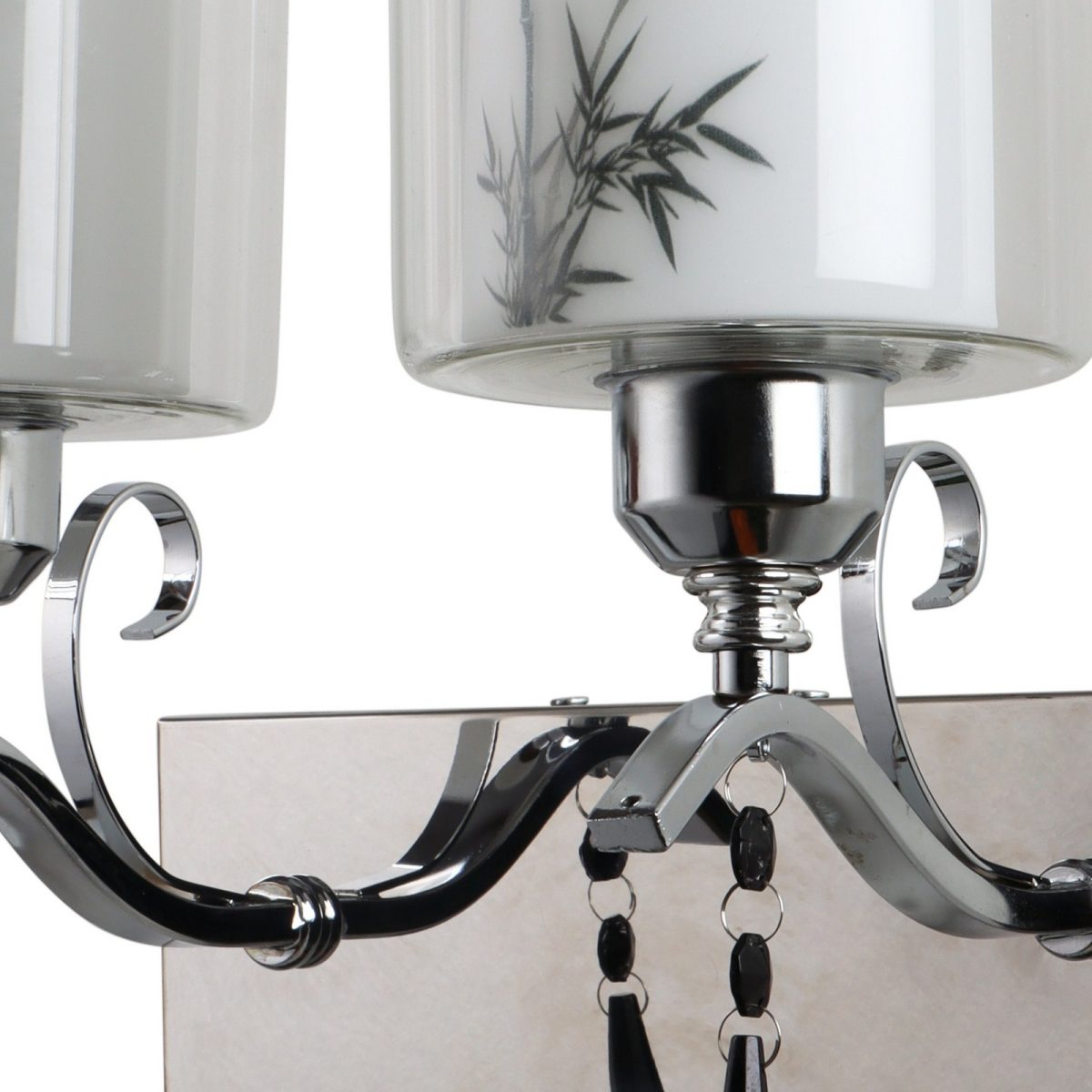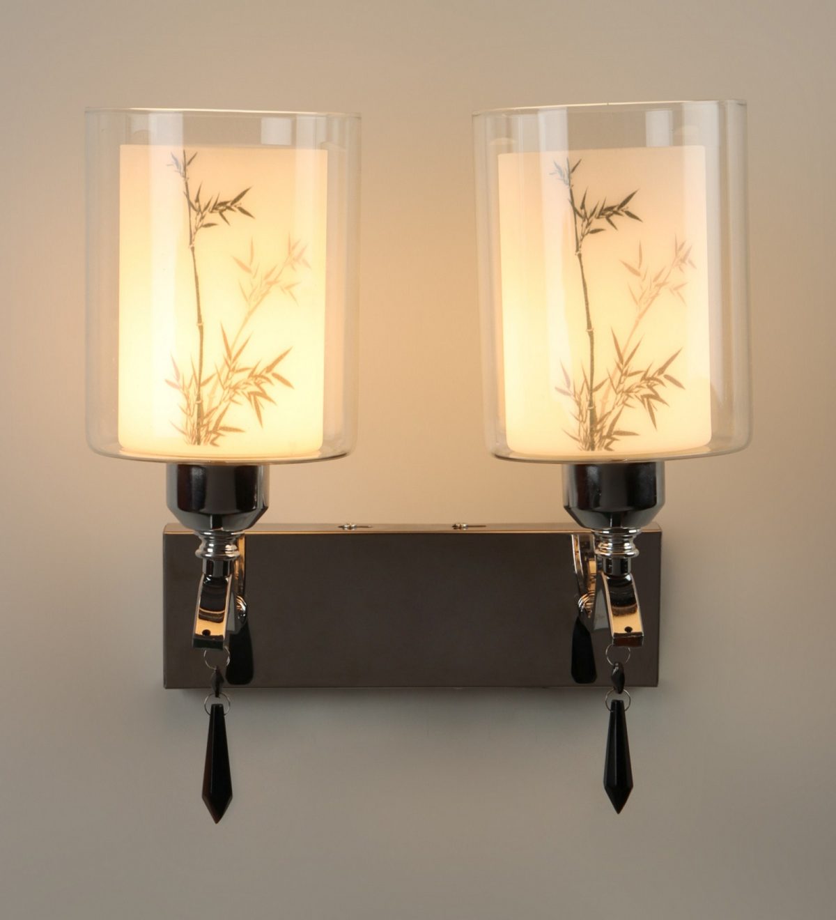 Silver (chrome) finish double wall light with double layered white glass with a printed design. It is maintenance free, comes with an E27 holder, only the change of lamp is required, which is available locally everywhere. Application includes both residential and commercial premises wherever it matches with your interiors. Matching single wall light code – WL2687. LAMP NOT INCLUDED.