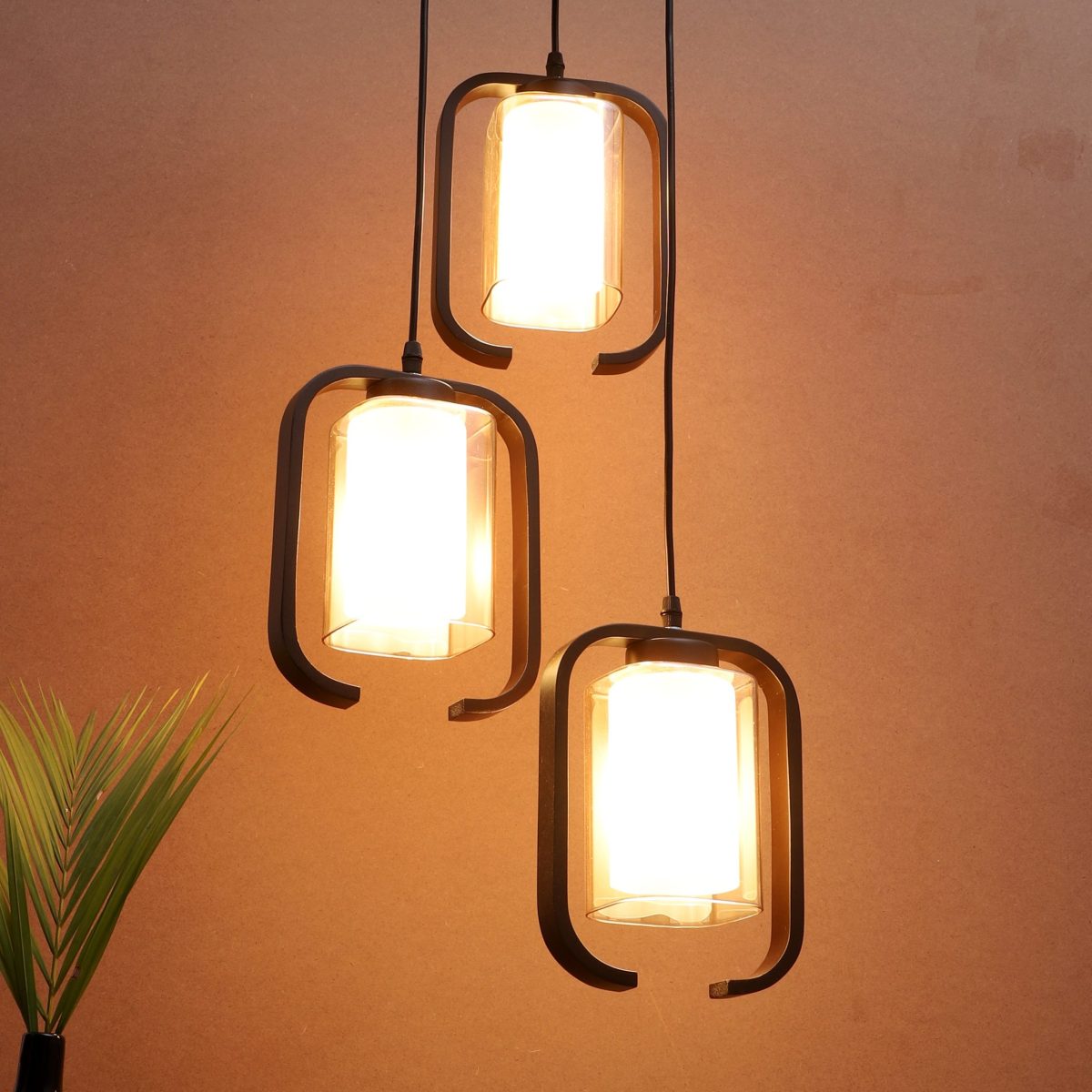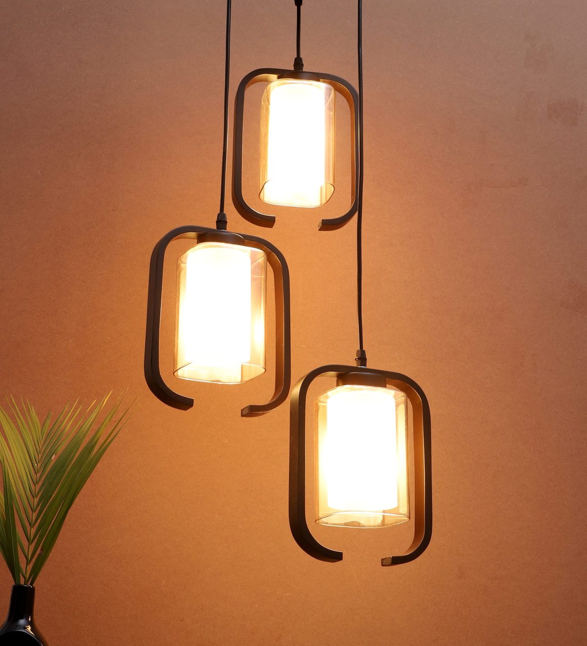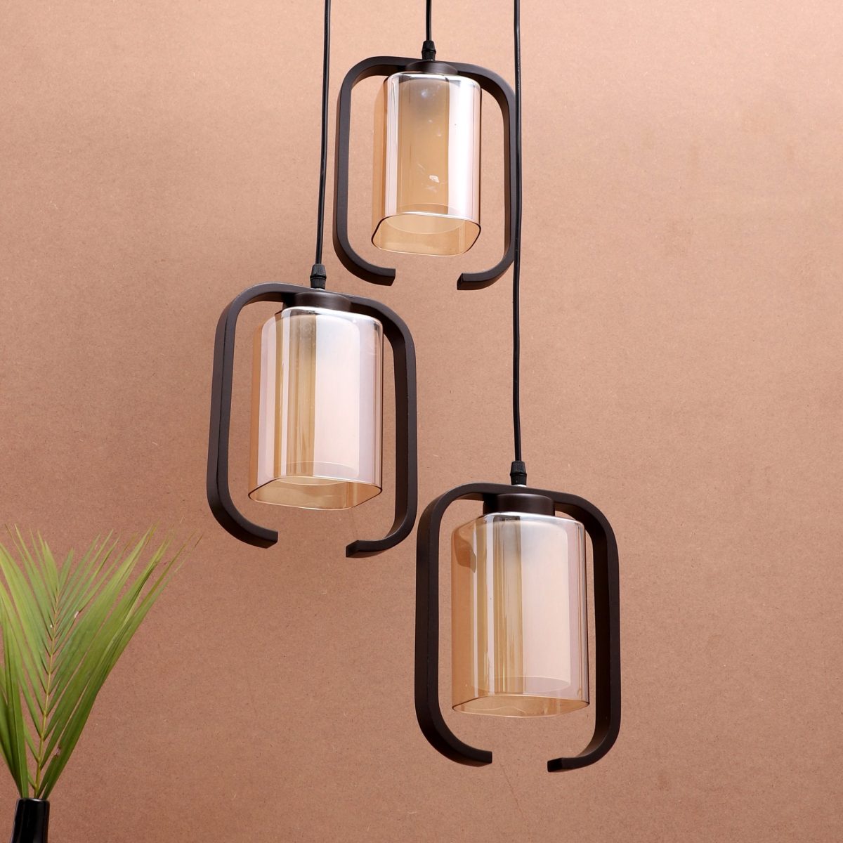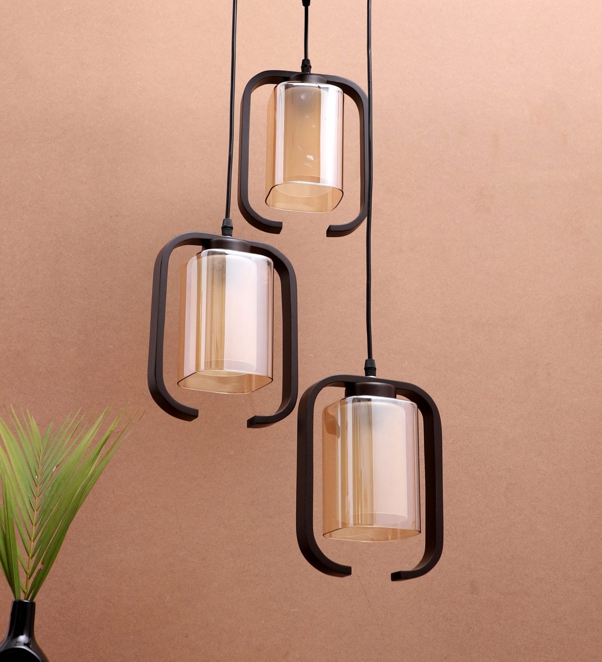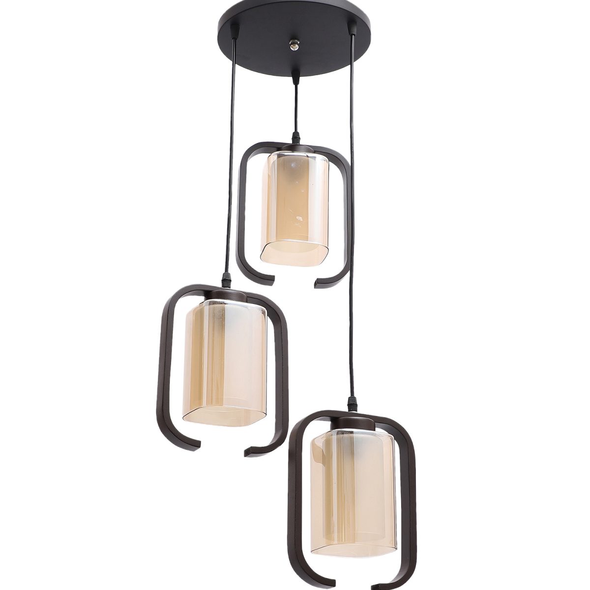 Dark brown (wood) finish, campaign glass tripple hanging light, made of wood, mild steel and glass. The suspension can be adjusted at time of installation to the desired height. Can be customized as per requirement. LAMP NOT INCLUDED.