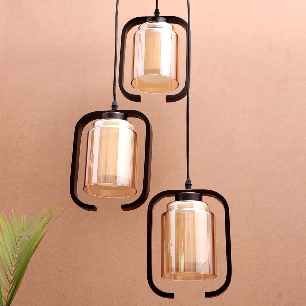 Dark brown (wood) finish, champaign glass tripple hanging light, made of wood, mild steel and glass. The suspension can be adjusted at time of installation to the desired height. Can be customized as per requirement. LAMP NOT INCLUDED.
