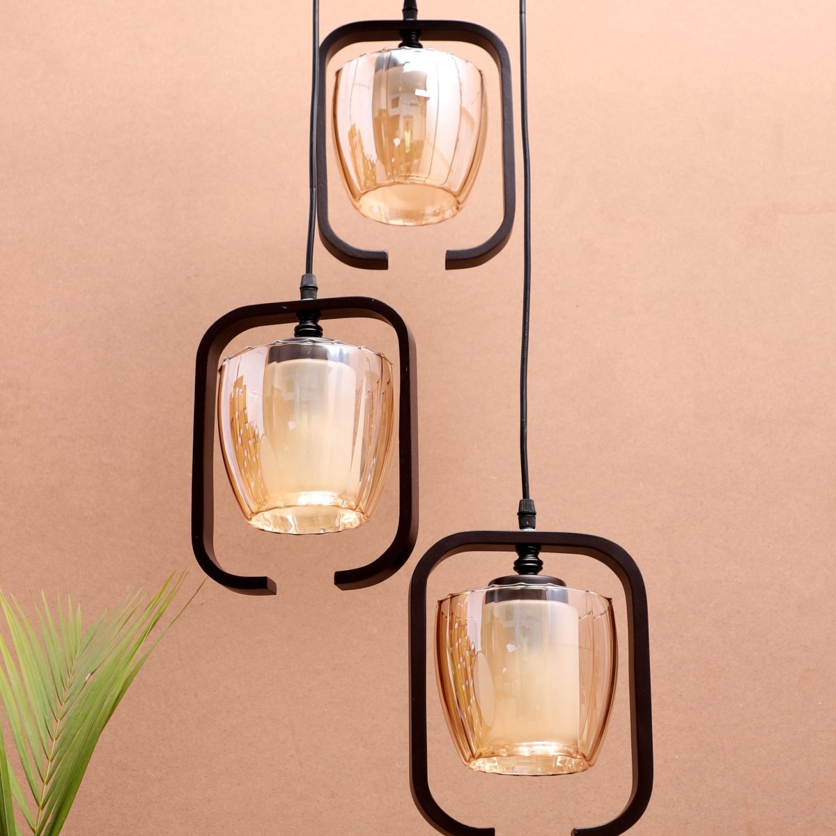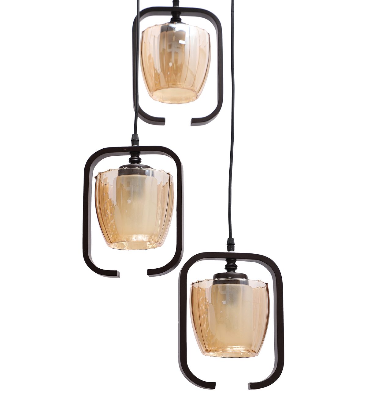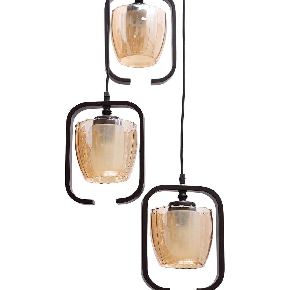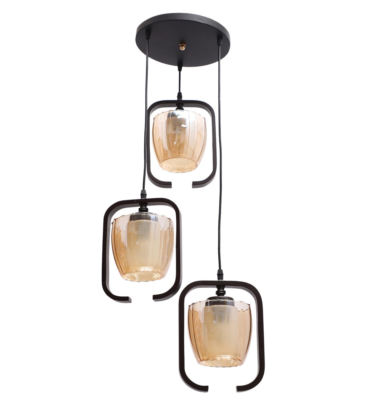 Dark brown (wood) finish, champaign glass tripple hanging light, made of wood, mild steel and glass. The suspension can be adjusted at time of installation to the desired height. Can be customized as per requirement. LAMP NOT INCLUDED.