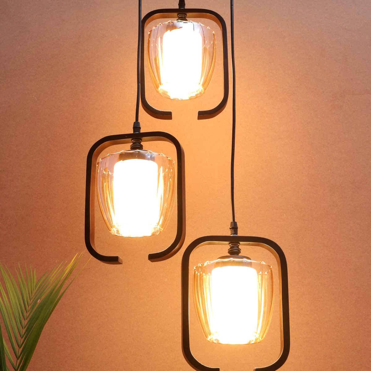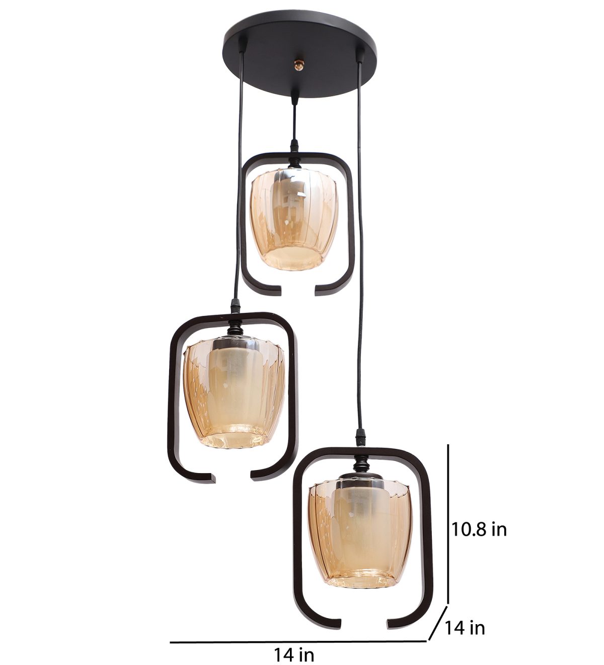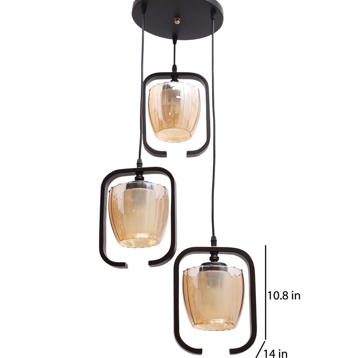 Dark brown (wood) finish, champaign glass tripple hanging light, made of wood, mild steel and glass. The suspension can be adjusted at time of installation to the desired height. Can be customized as per requirement. LAMP NOT INCLUDED.