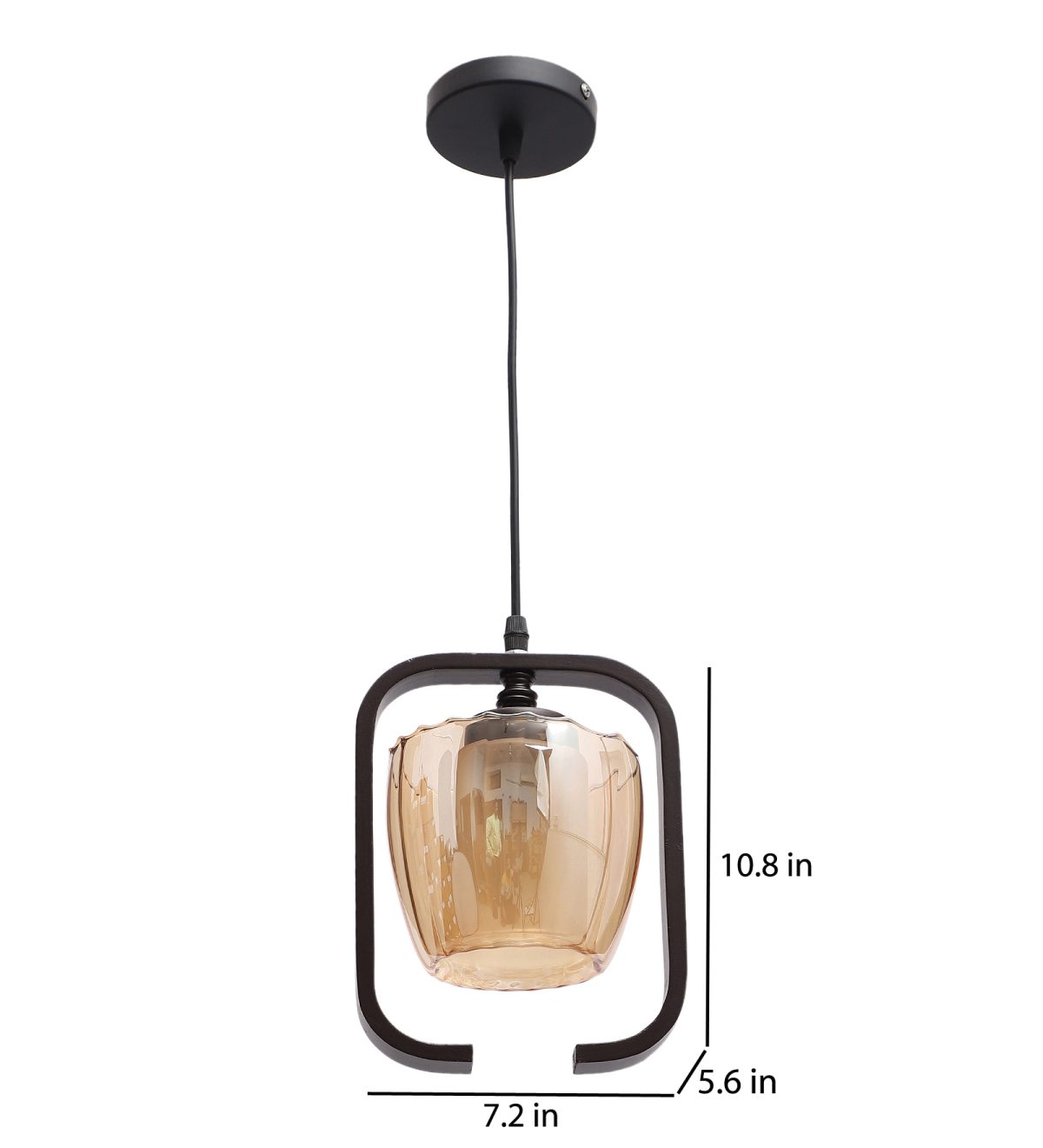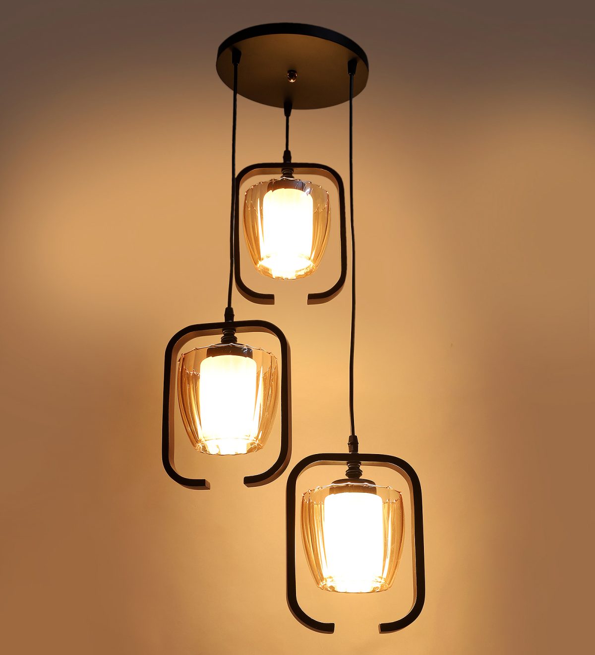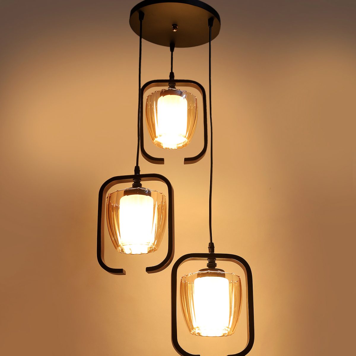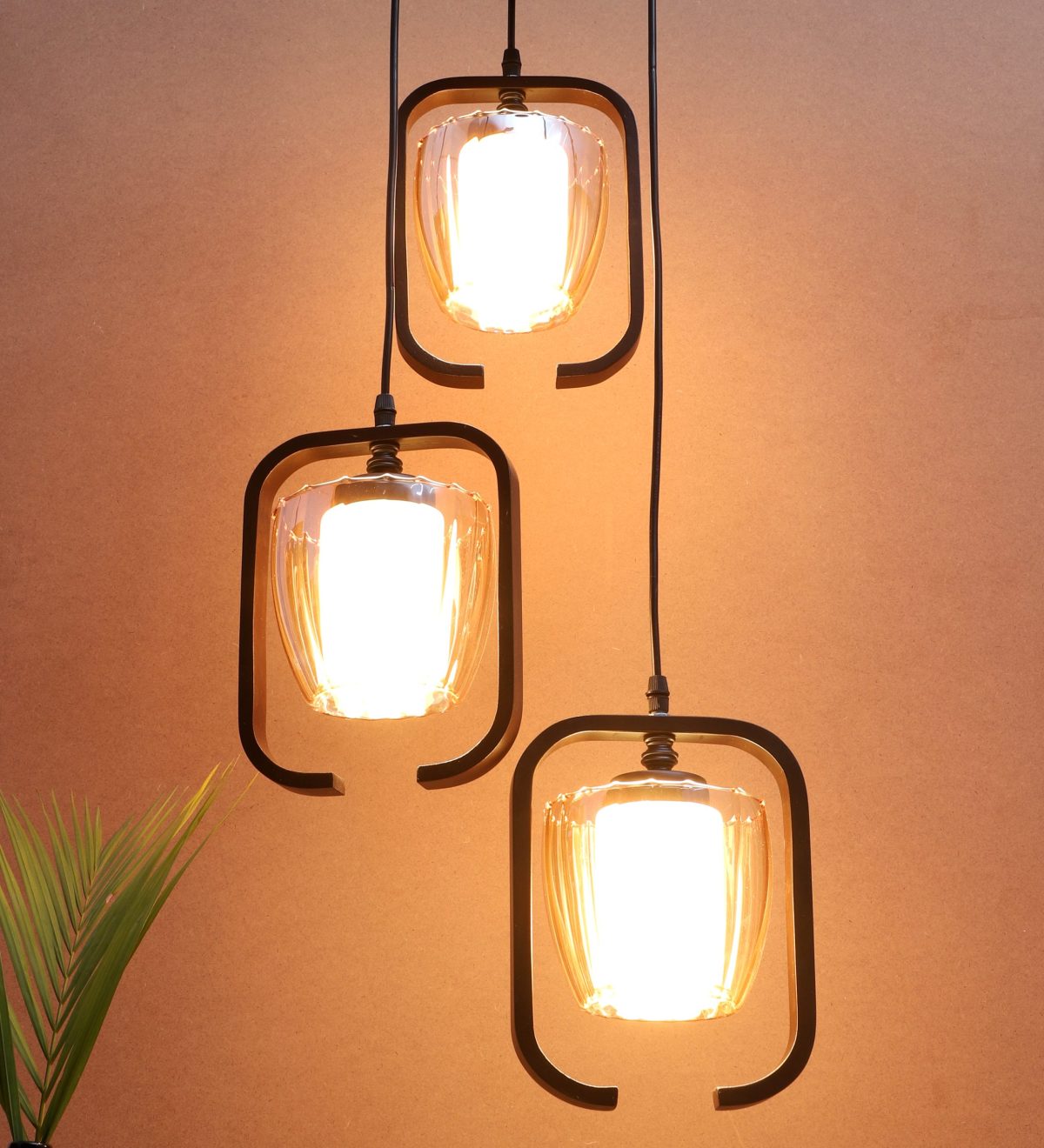 Dark brown (wood) finish, champaign glass tripple hanging light, made of wood, mild steel and glass. The suspension can be adjusted at time of installation to the desired height. Can be customized as per requirement. LAMP NOT INCLUDED.