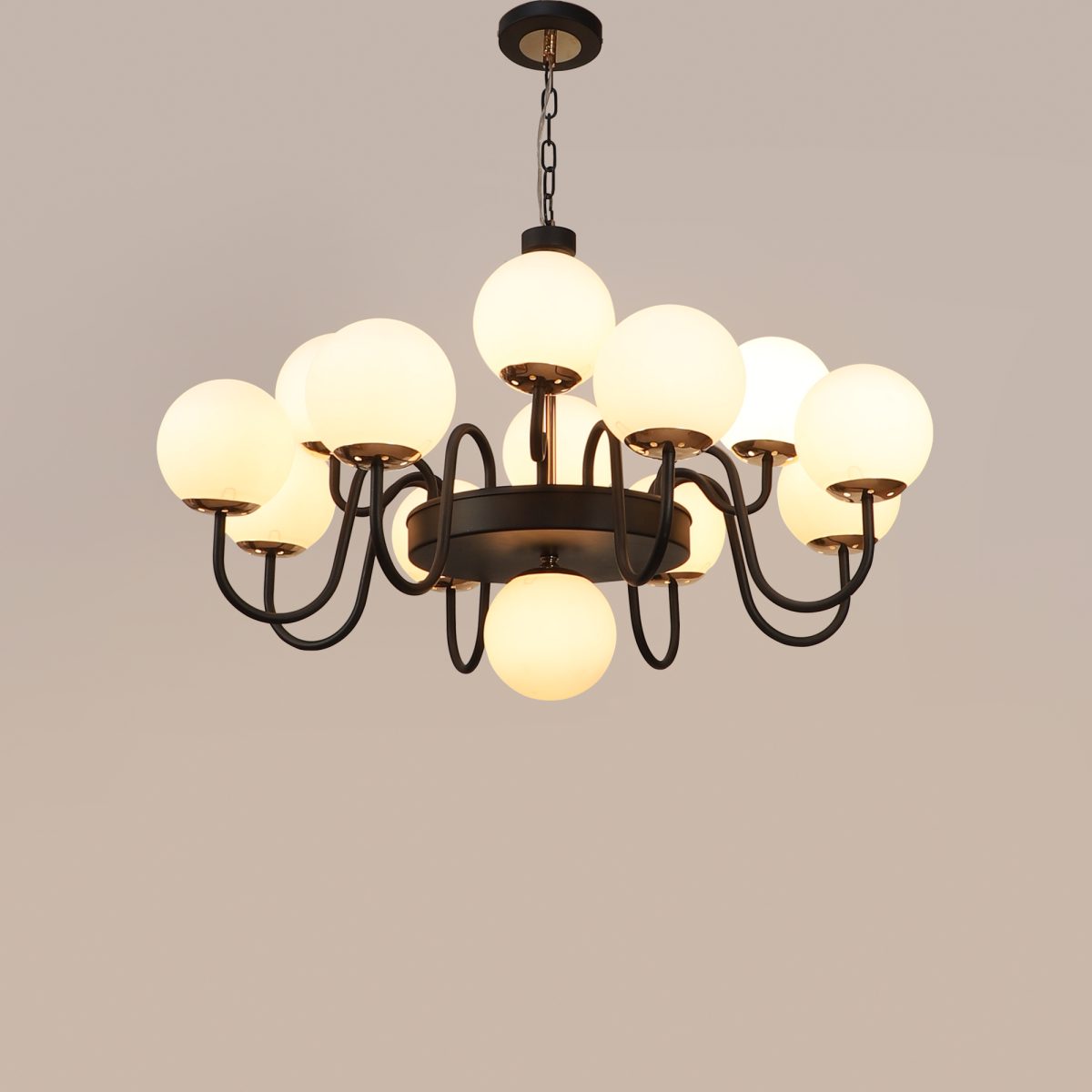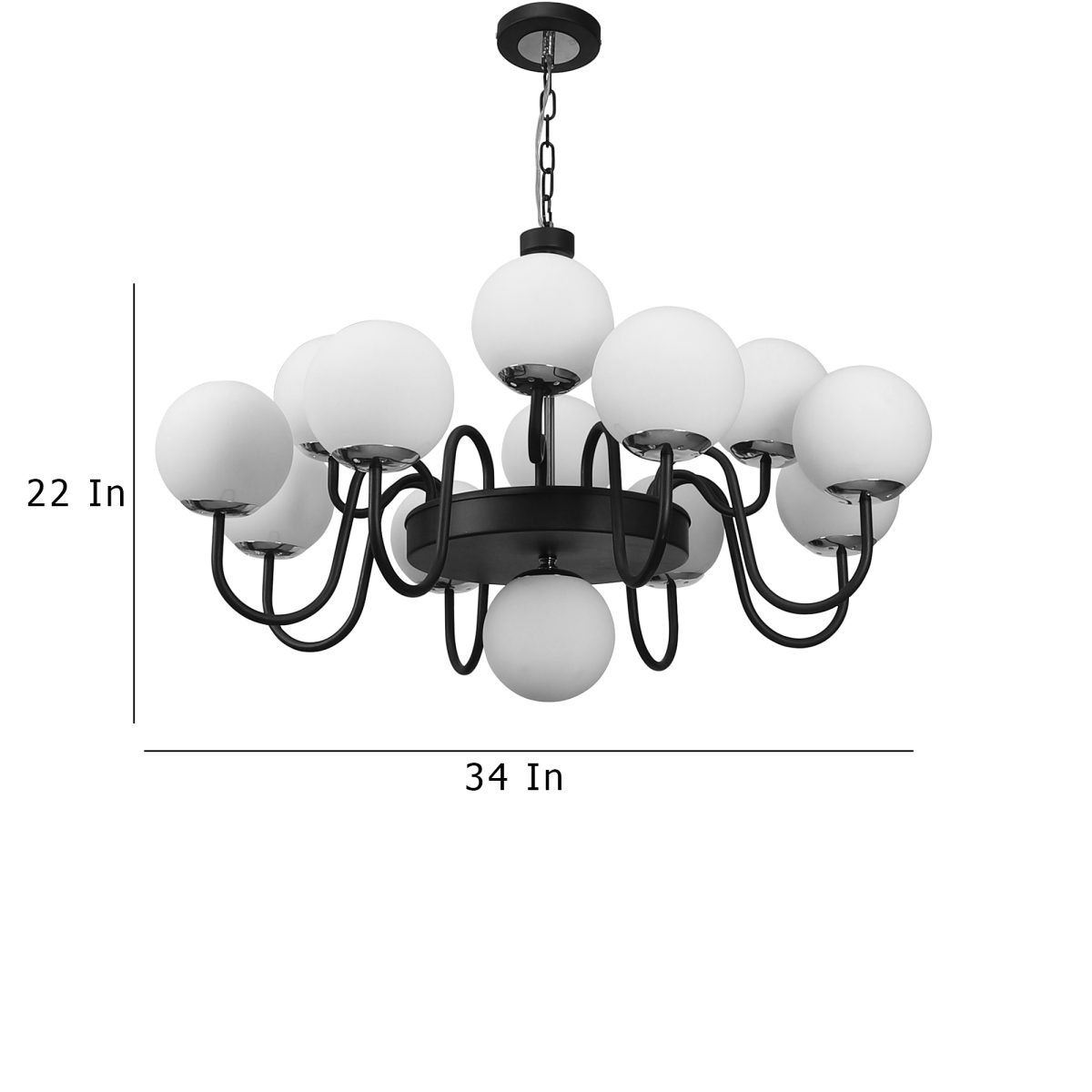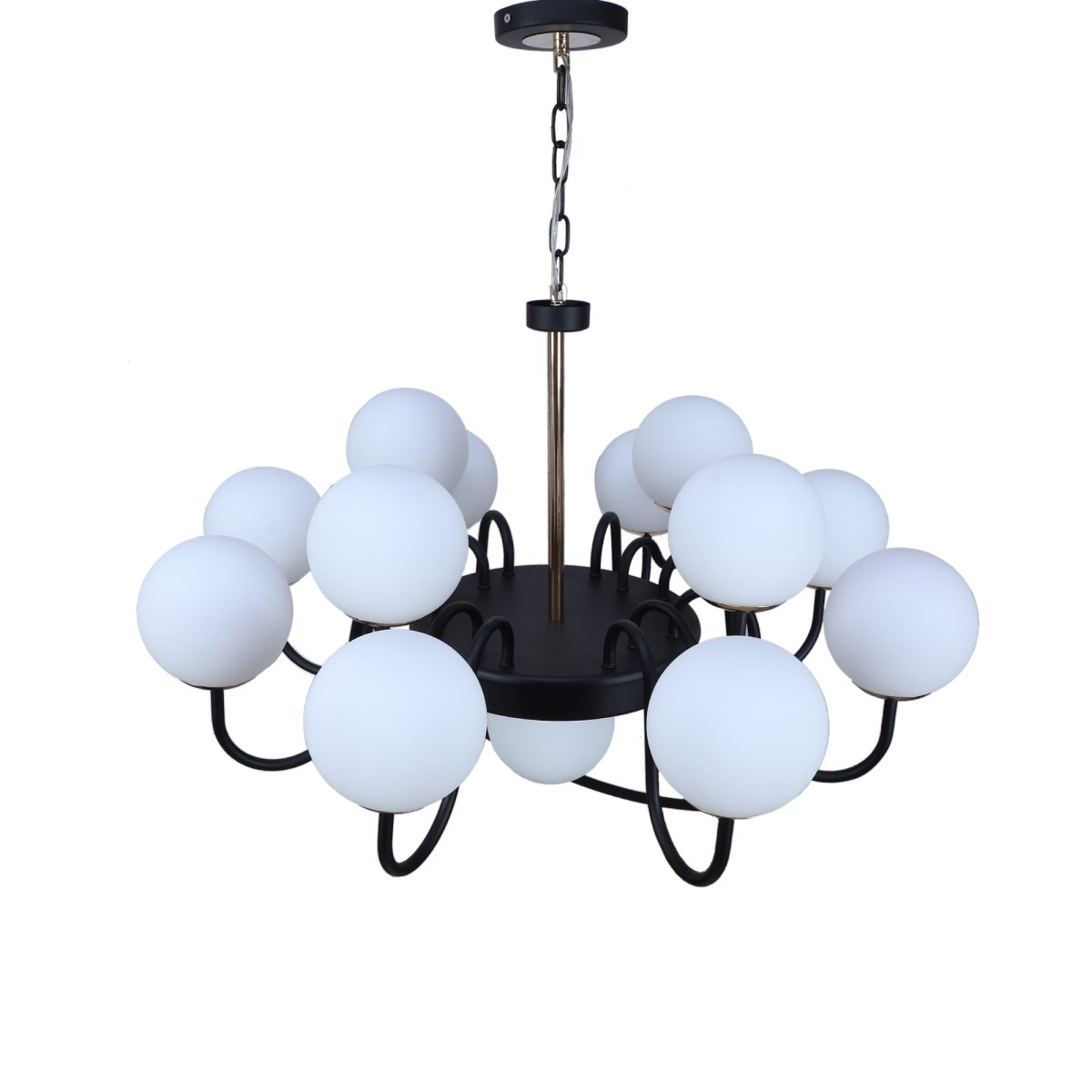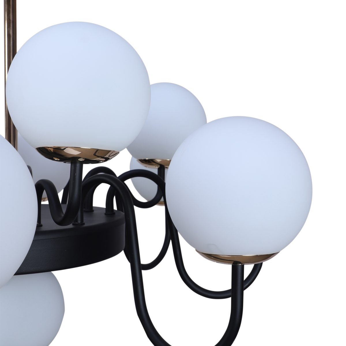 Brown, gold finish chandelier with small, round globe (doom) white glass mounted on a designer frame made of mild steel having thirteen lights(8+4+1). This is a hanging type chandelier in which the base plate is fixed to the ceiling with the help of straight clamp and screws. The suspension can be adjusted at time of installation to the desired height. It is maintenance free, easy to remove glasses and wash them, comes with an E27 holder, only the change of lamp is required, which is available locally everywhere. Application includes both residential and commercial premises wherever it matches with your interiors. Can be customized as per requirement. LAMP NOT INCLUDED.