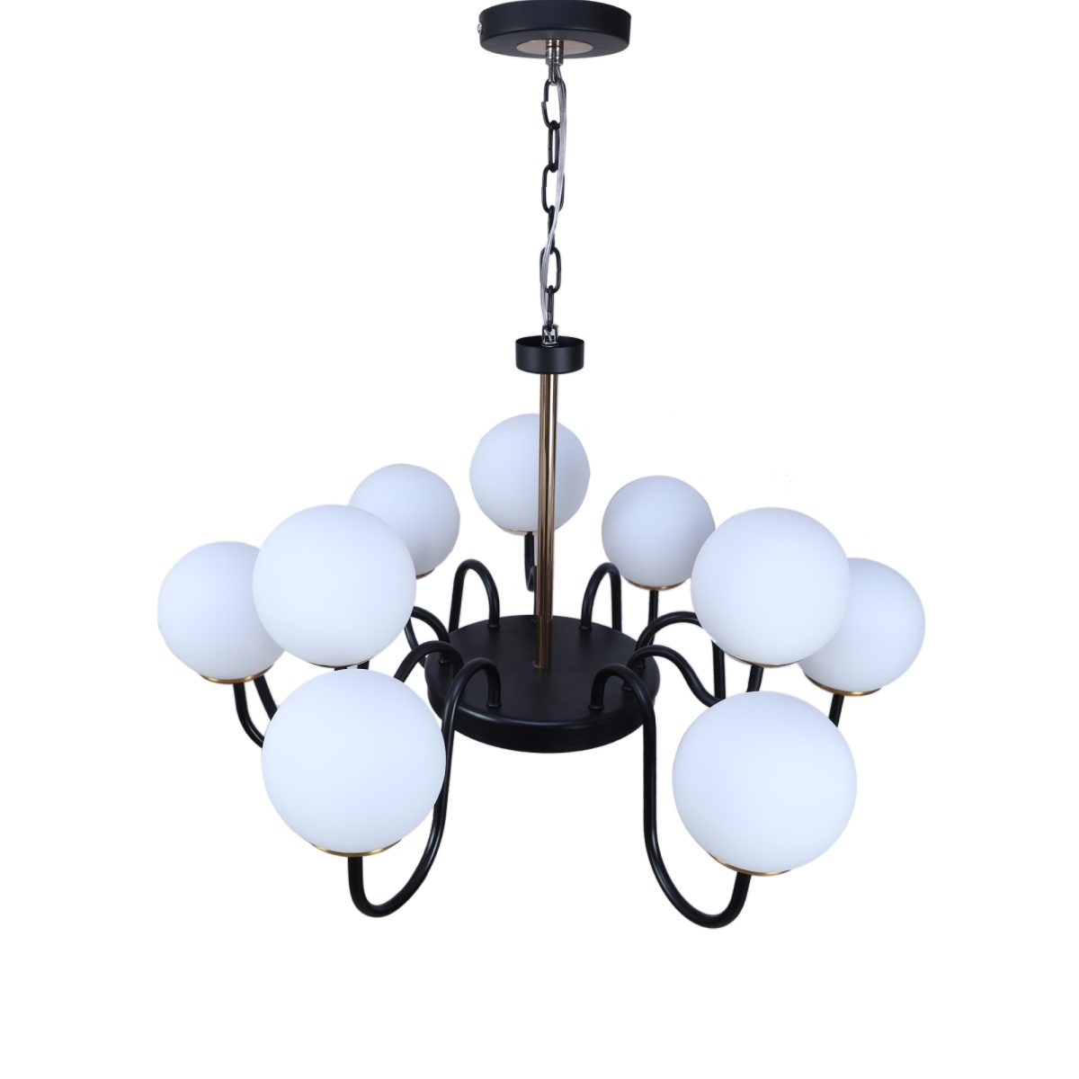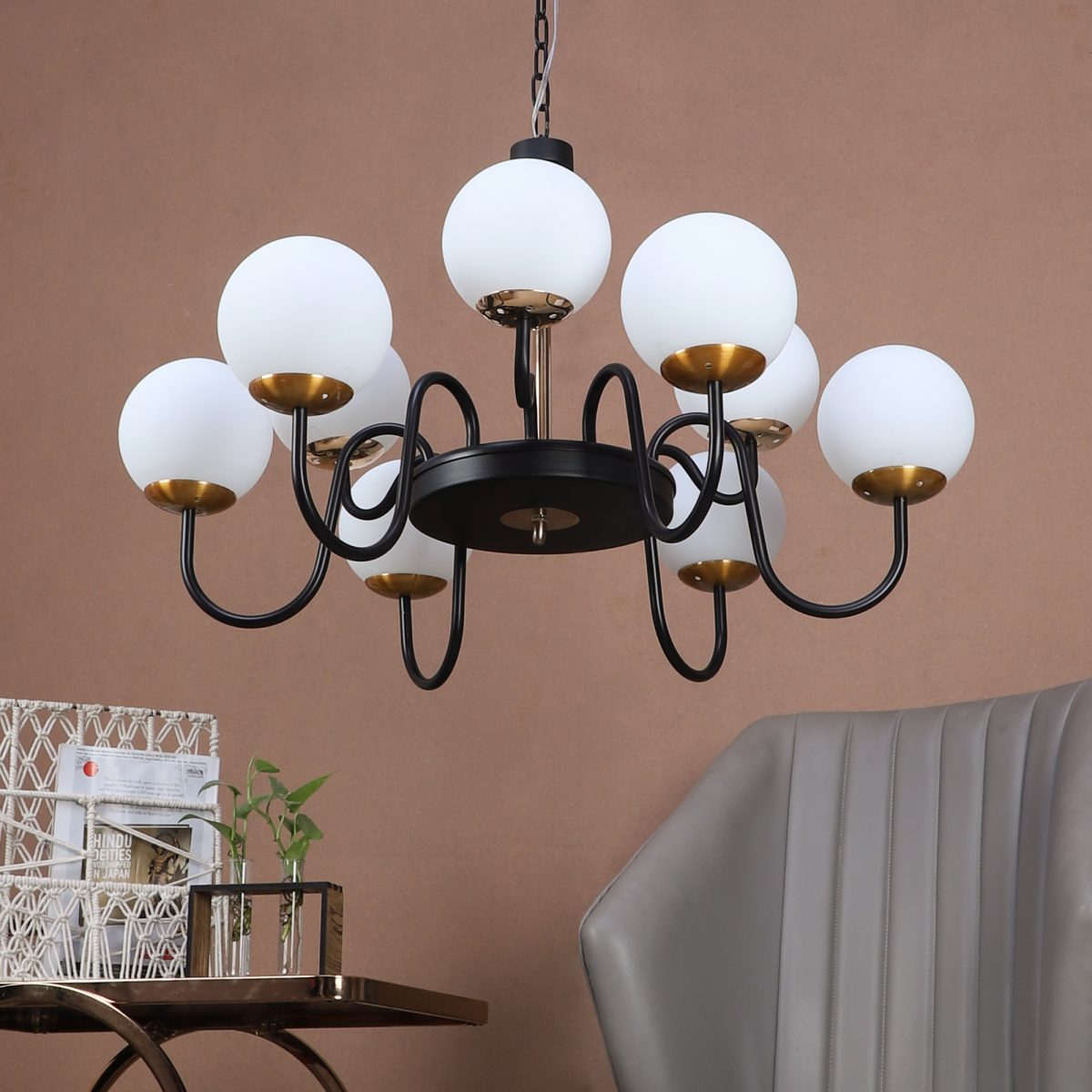 Brown gold finish chandellier having small, round globe (doom) white glass mounted on a designer frame made of mild steel and wood having nine lights (6+3). This is a hanging type chandelier in which the base plate is fixed to the ceiling with the help of straight clamp and screws. The suspension can be adjusted at time of installation to the desired height. It is maintenance free, easy to remove glasses and wash them, comes with an E27 holder, only the change of lamp is required, which is available locally everywhere. Application includes both residential and commercial premises wherever it matches with your interiors. Can be customized as per requirement. LAMP NOT INCLUDED.
