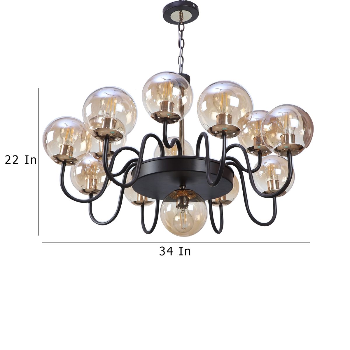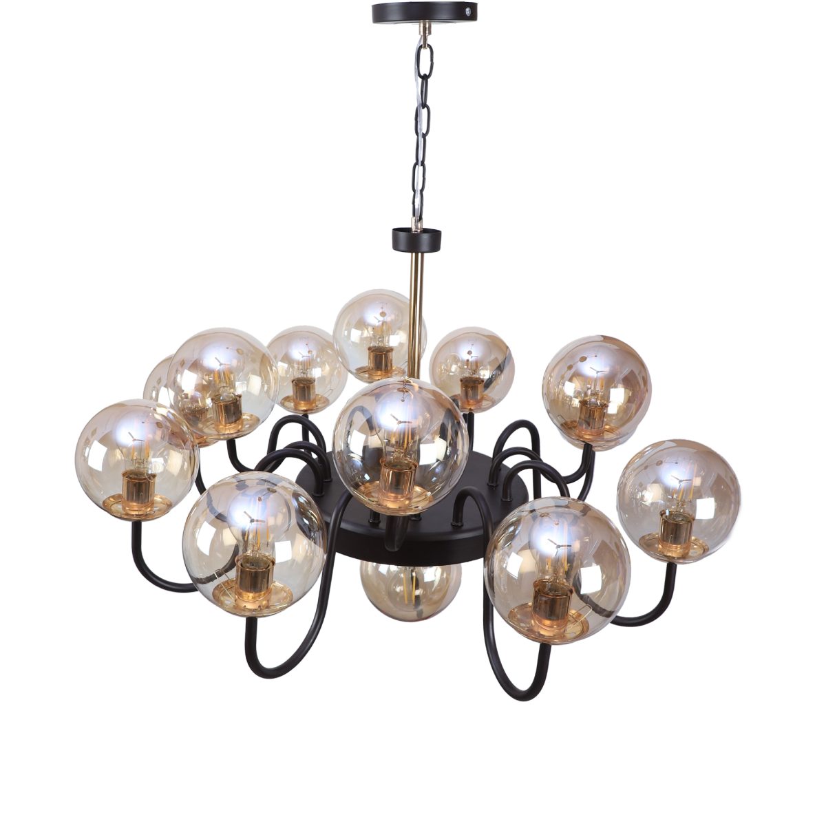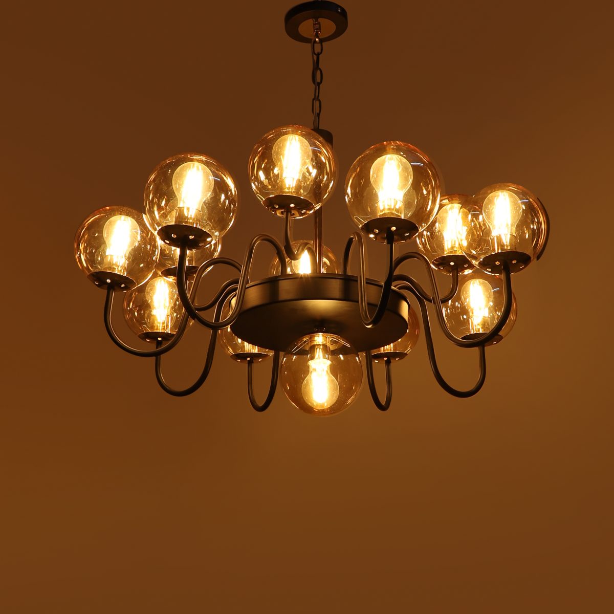 Brown gold finish, small, round globe (doom) champaign coloured glass mounted on a designer frame made of mild steel and wood having thirteen lights(8+4+1). This is a hanging type chandelier in which the base plate is fixed to the ceiling with the help of straight clamp and screws. The suspension can be adjusted at time of installation to the desired height. It is maintenance free, easy to remove glasses and wash them, comes with an E27 holder, only the change of lamp is required, which is available locally everywhere. Filament lamp is recommended to enhance its beauty. Application includes both residential and commercial premises wherever it matches with your interiors. Can be customized as per requirement. LAMP NOT INCLUDED.