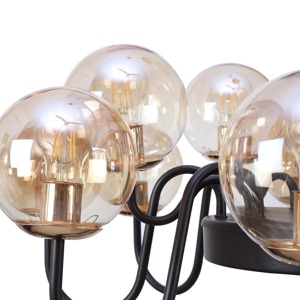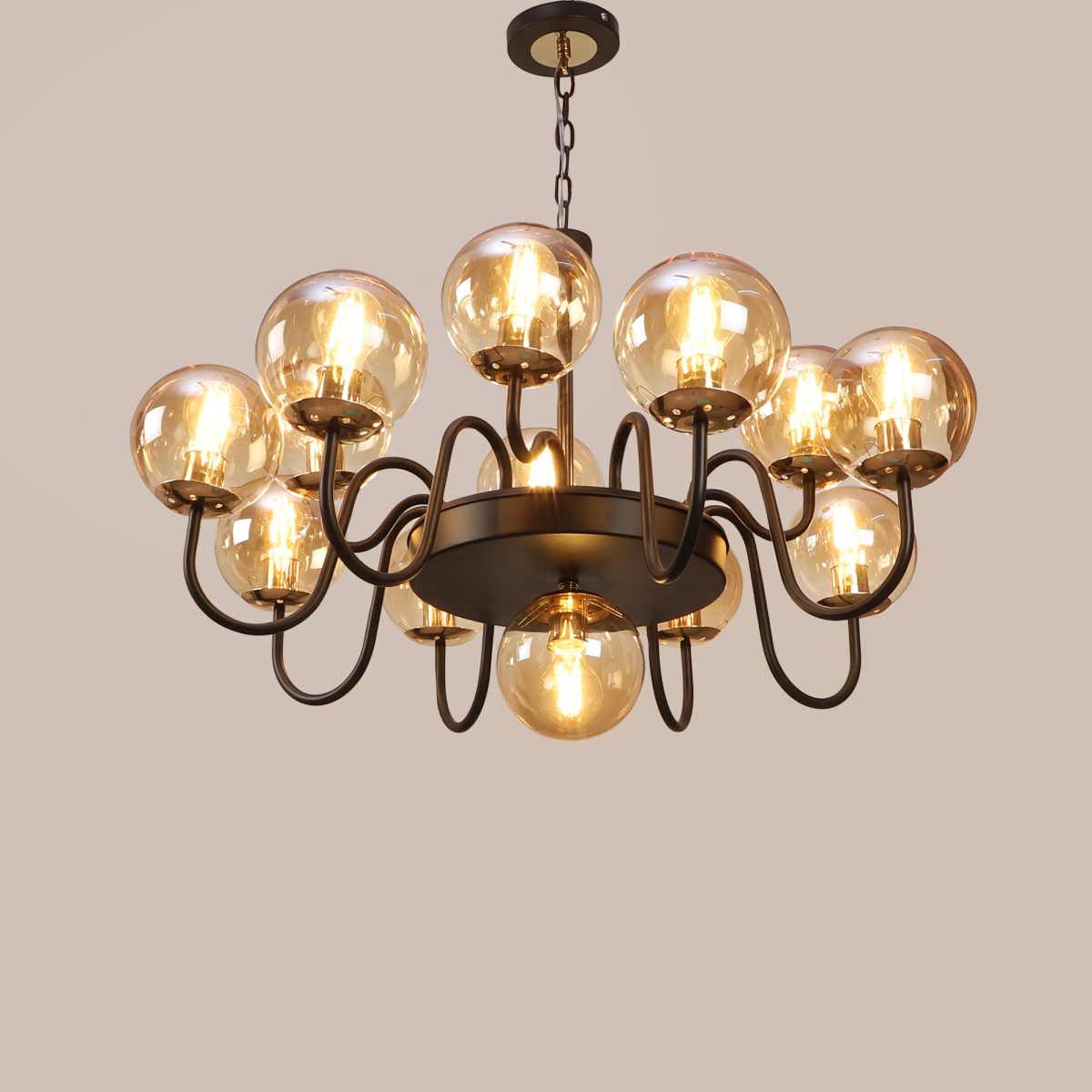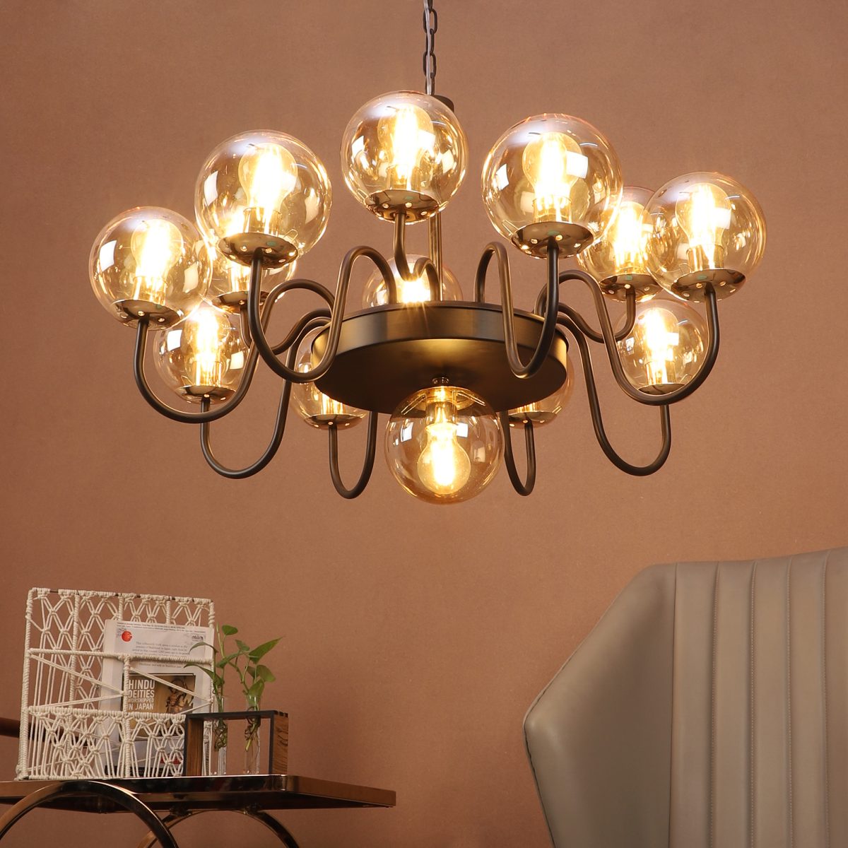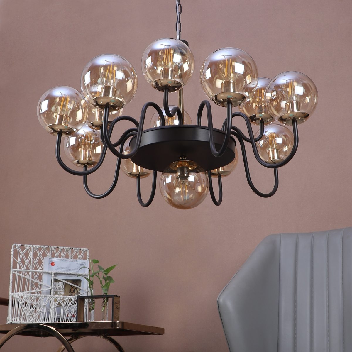 Brown gold finish, small, round globe (doom) champaign coloured glass mounted on a designer frame made of mild steel and wood having thirteen lights(8+4+1). This is a hanging type chandelier in which the base plate is fixed to the ceiling with the help of straight clamp and screws. The suspension can be adjusted at time of installation to the desired height. It is maintenance free, easy to remove glasses and wash them, comes with an E27 holder, only the change of lamp is required, which is available locally everywhere. Filament lamp is recommended to enhance its beauty. Application includes both residential and commercial premises wherever it matches with your interiors. Can be customized as per requirement. LAMP NOT INCLUDED.