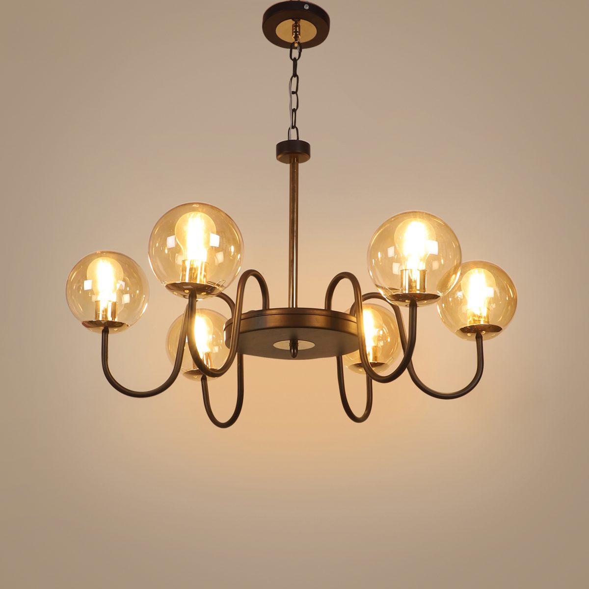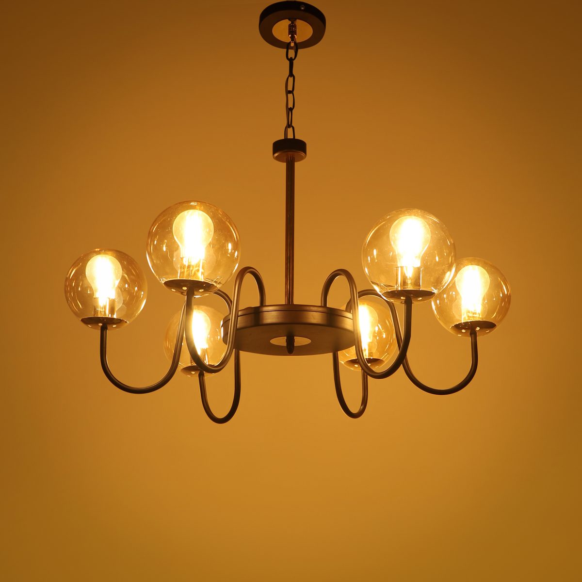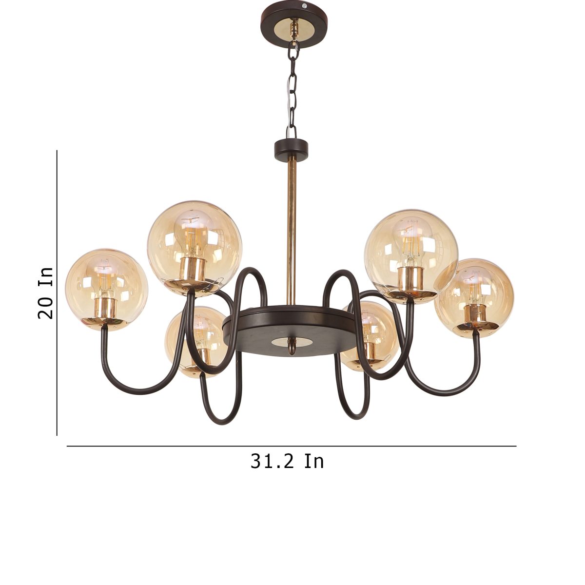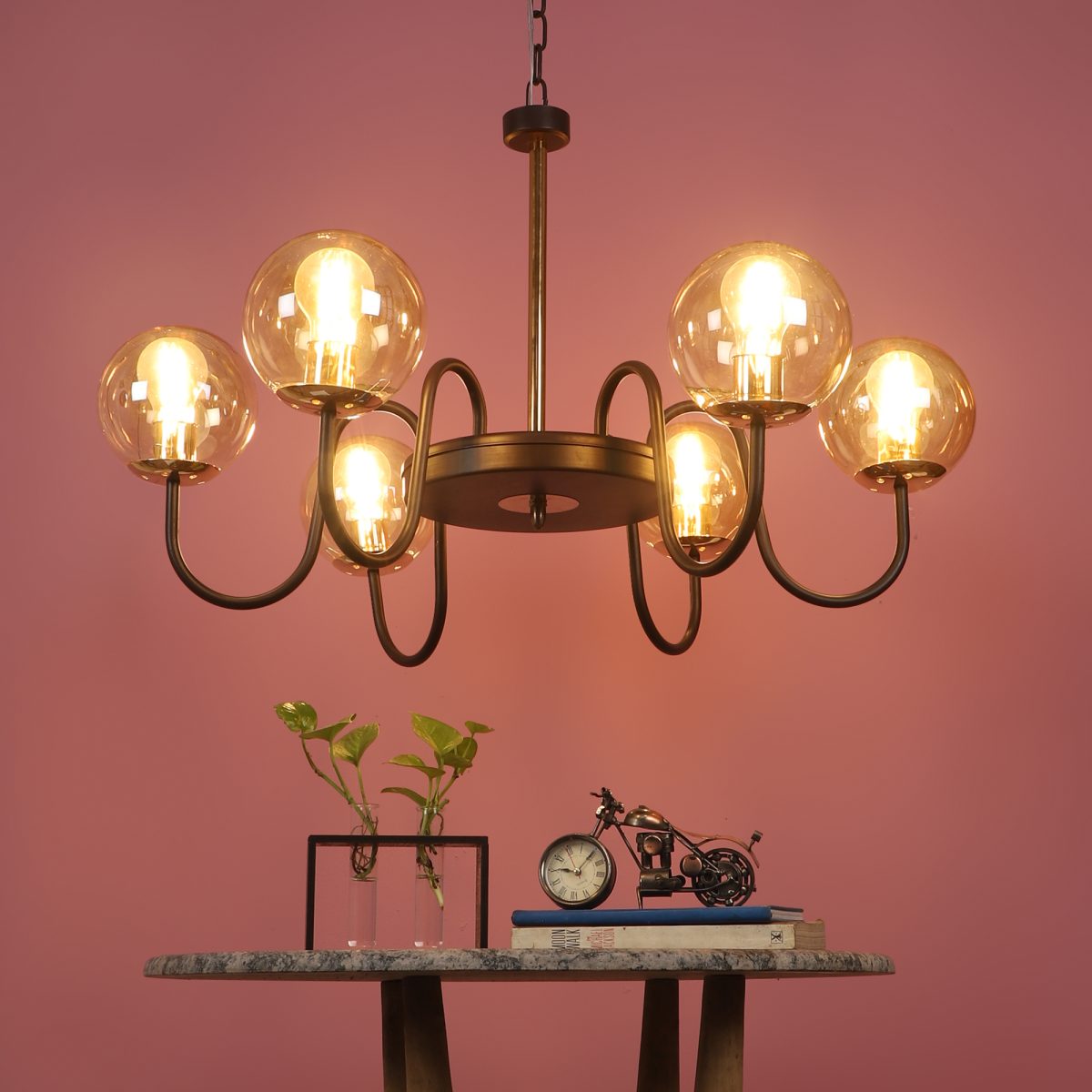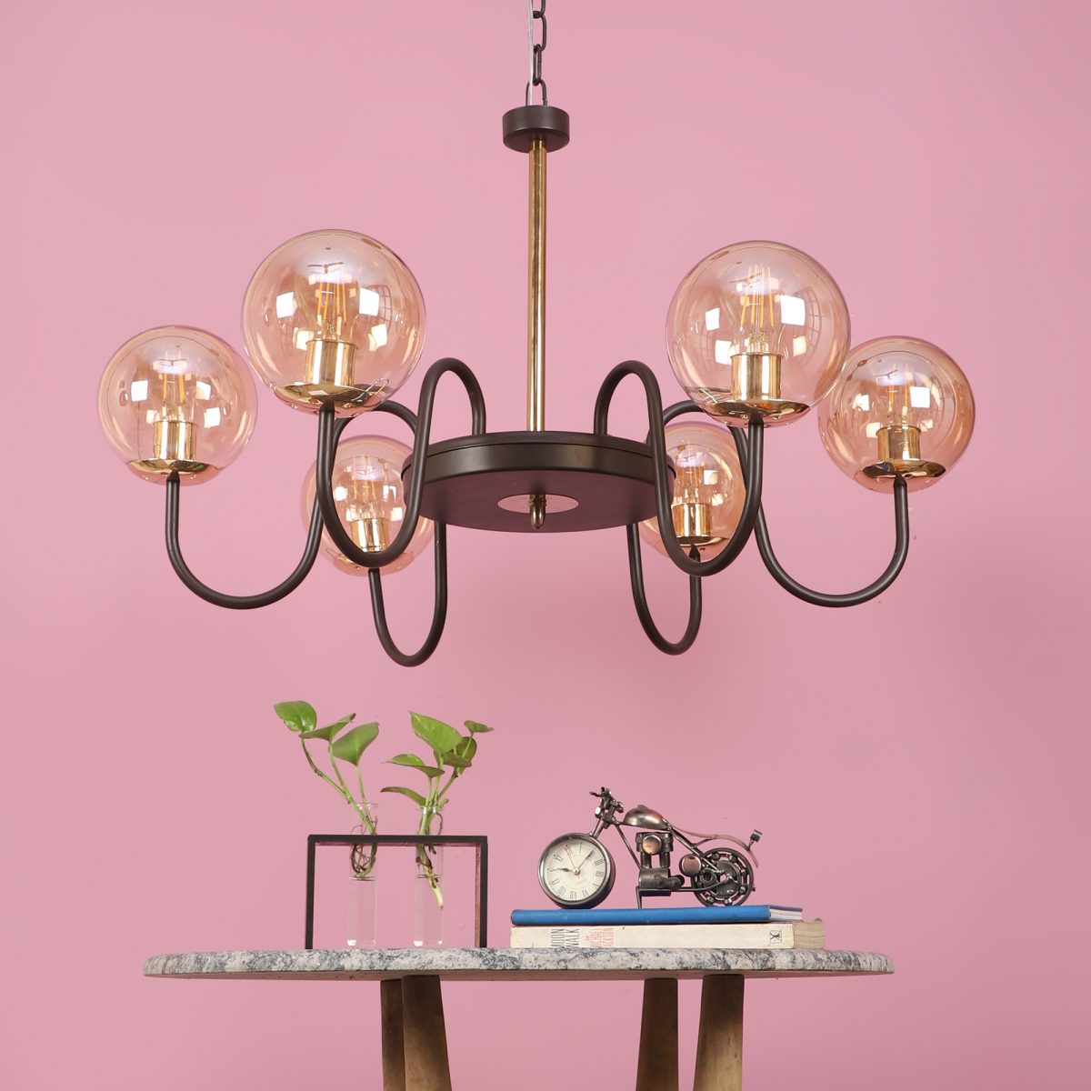 Brown gold finish, small, round globe (doom) champaign coloured glass mounted on a designer frame made of mild steel and wood having six lights. This is a hanging type chandelier in which the base plate is fixed to the ceiling with the help of straight clamp and screws. The suspension can be adjusted at time of installation to the desired height. It is maintenance free, easy to remove glasses and wash them, comes with an E27 holder, only the change of lamp is required, which is available locally everywhere. Filament lamp is recommended to enhance its beauty. Application includes both residential and commercial premises wherever it matches with your interiors. Can be customized as per requirement. LAMP NOT INCLUDED.