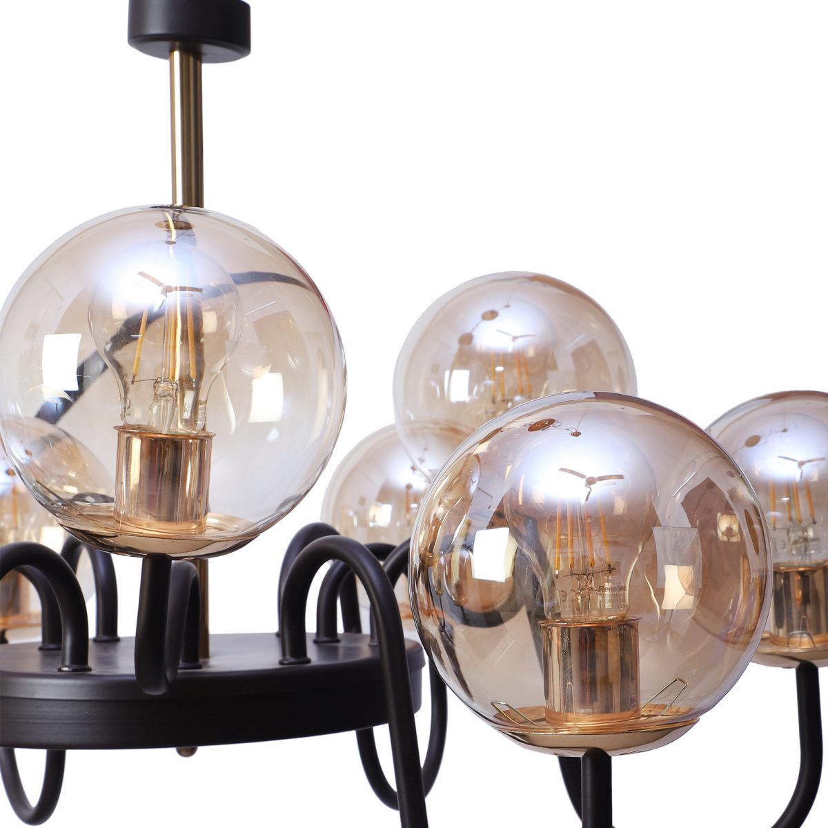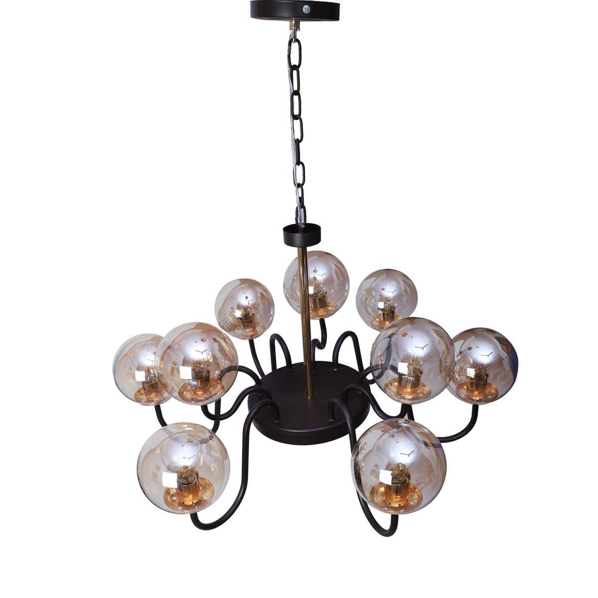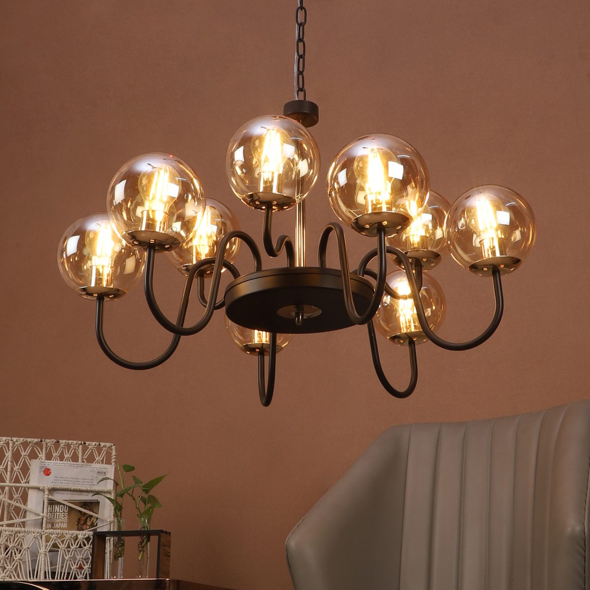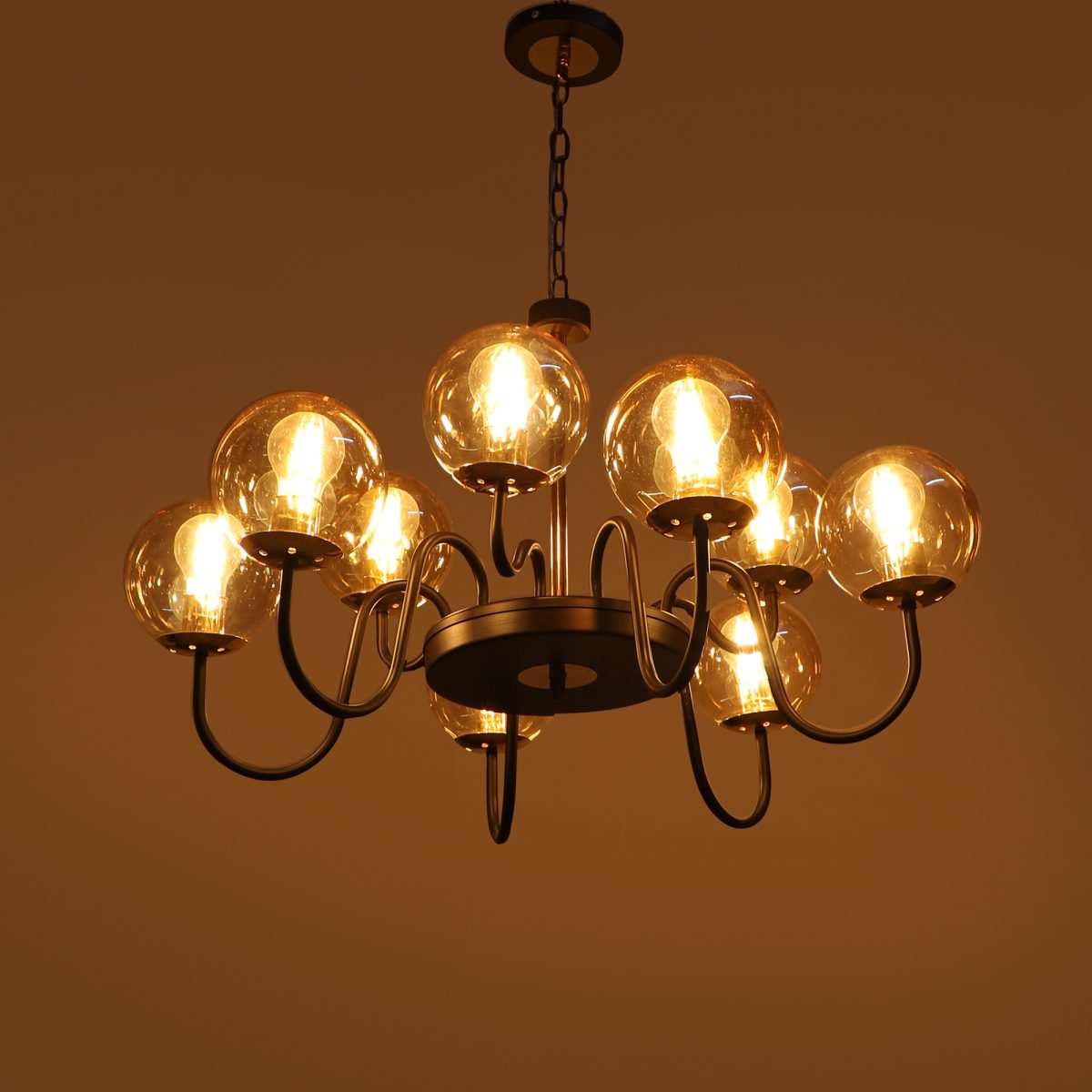 Brown gold finish, small, round globe (doom) champaign coloured glass mounted on a designer frame made of mild steel and wood having nine lights (6+3). This is a hanging type chandelier in which the base plate is fixed to the ceiling with the help of straight clamp and screws. The suspension can be adjusted at time of installation to the desired height. It is maintenance free, easy to remove glasses and wash them, comes with an E27 holder, only the change of lamp is required, which is available locally everywhere. Filament lamp is recommended to enhance its beauty. Application includes both residential and commercial premises wherever it matches with your interiors. Can be customized as per requirement. LAMP NOT INCLUDED.
