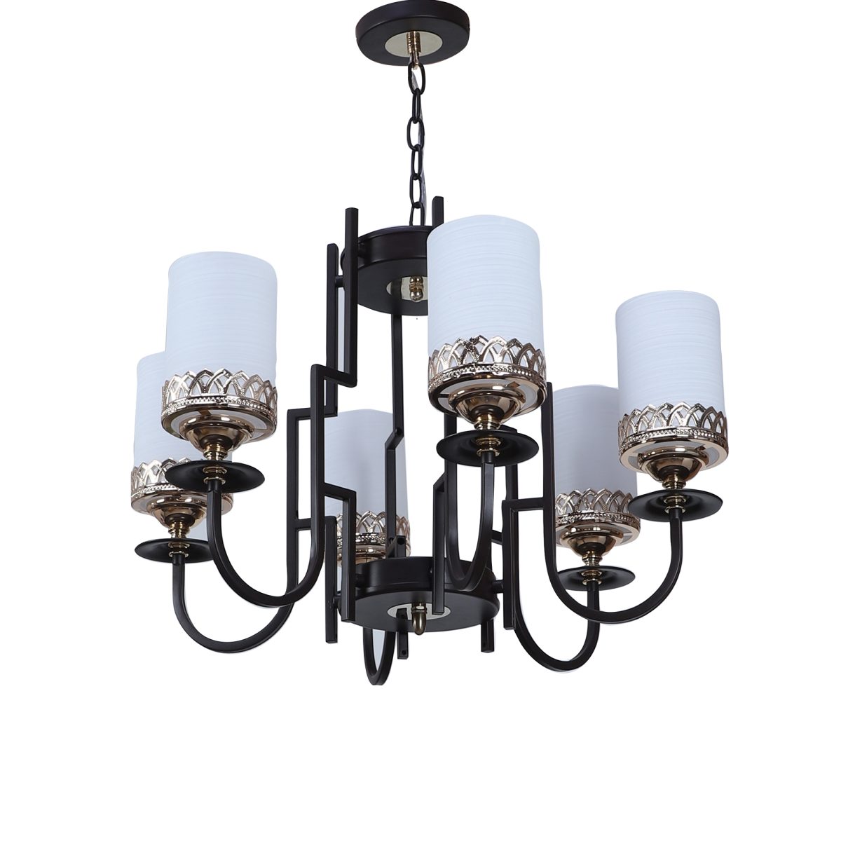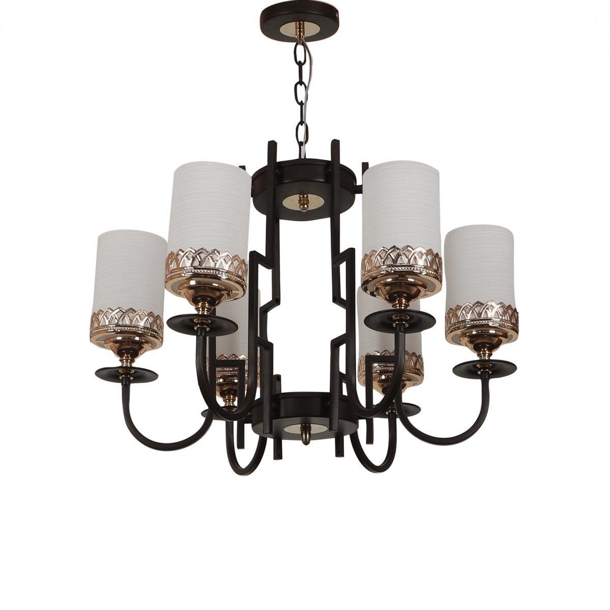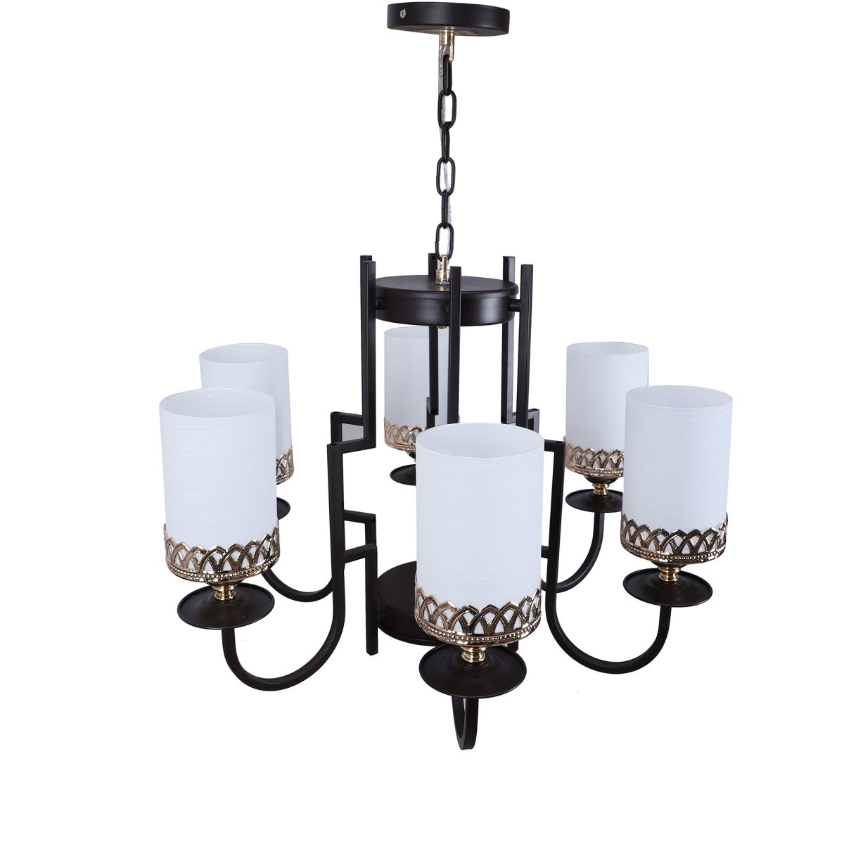 Dark brown, gold chandellier with round, cylindrical white glass having self textured design mounted on a designer frame made of mild steel having six lights. This is a hanging type chandelier in which the base plate is fixed to the ceiling with the help of straight clamp and screws. The suspension can be adjusted at time of installation to the desired height. It is maintenance free, easy to remove glasses and wash them. Comes with an E27 holder, only the change of lamp is required, which is available locally everywhere. Application includes both residential and commercial premises wherever it matches with your interiors. Can be customized as per requirement. LAMP NOT INCLUDED.