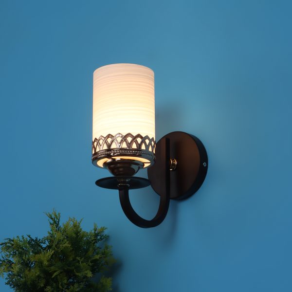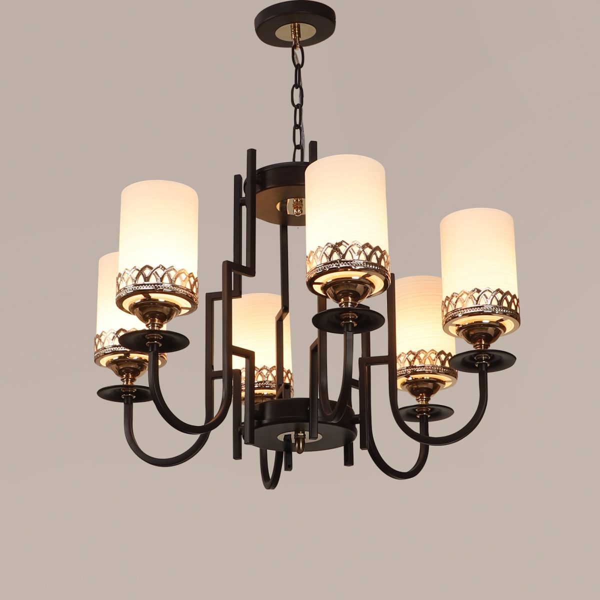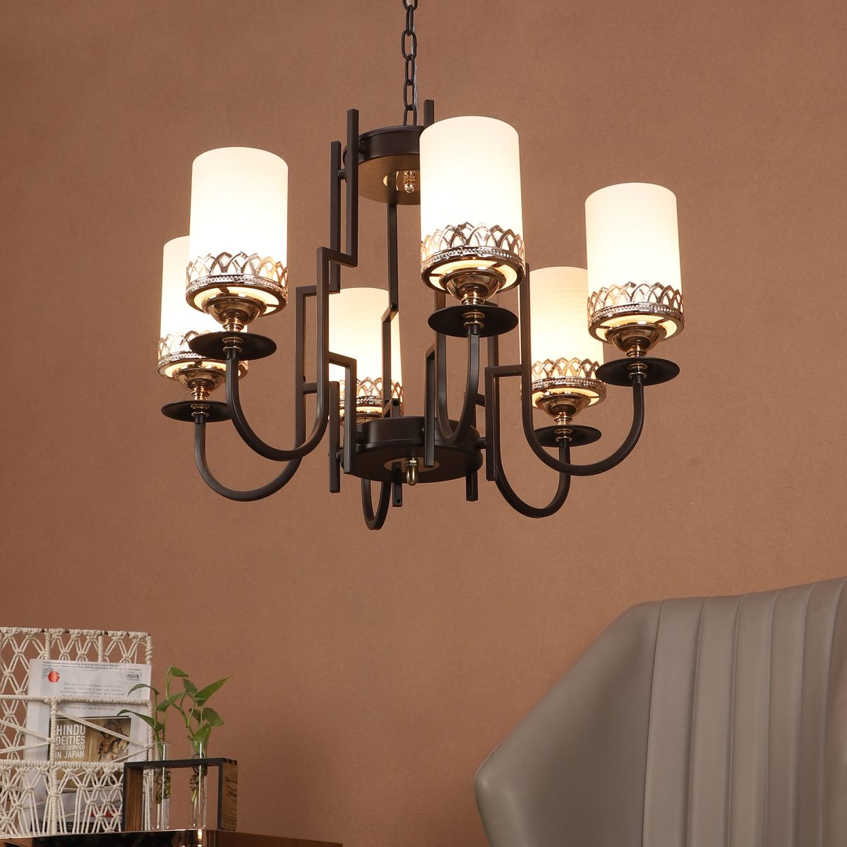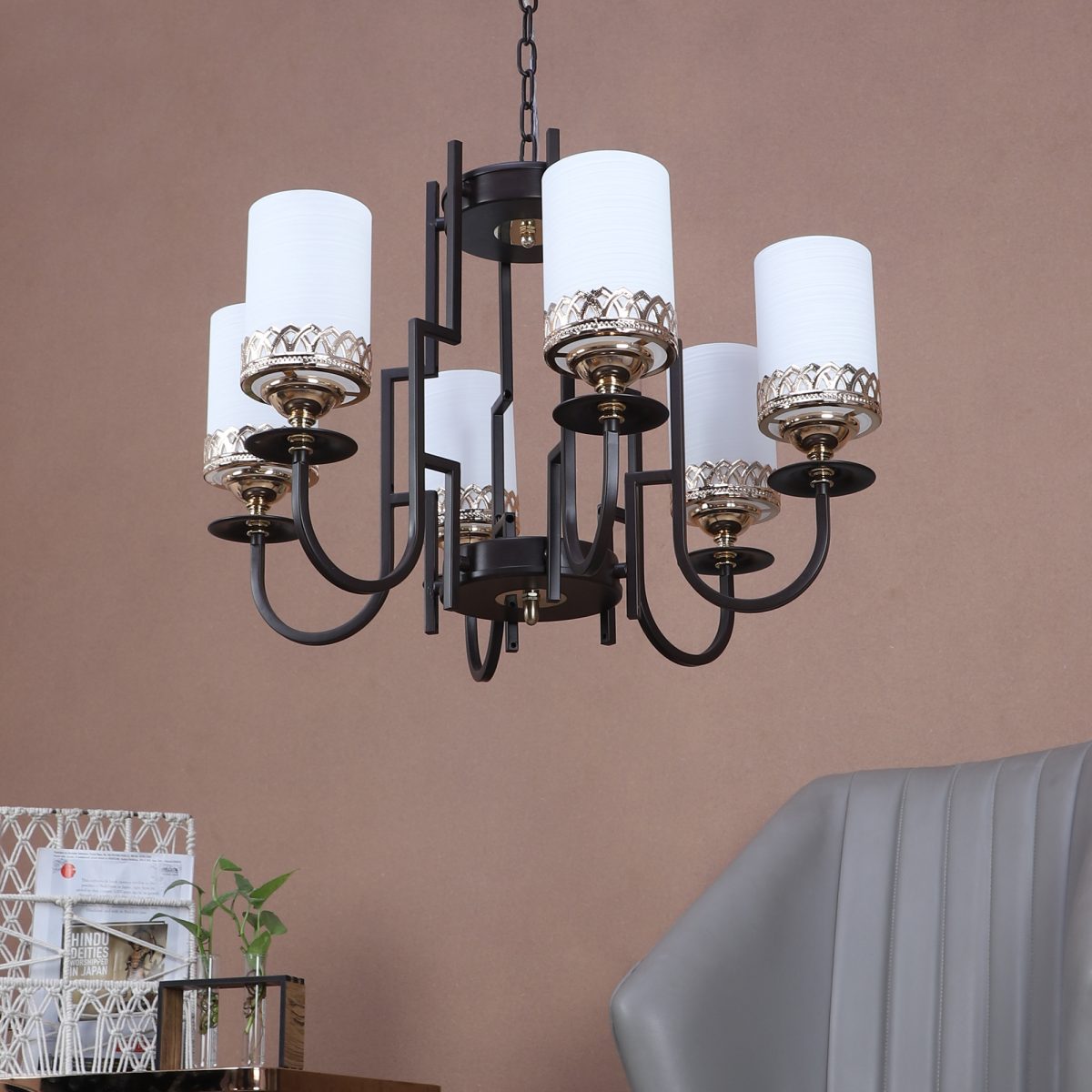Dark brown, gold chandellier with round, cylindrical white glass having self textured design mounted on a designer frame made of mild steel having six lights. This is a hanging type chandelier in which the base plate is fixed to the ceiling with the help of straight clamp and screws. The suspension can be adjusted at time of installation to the desired height. It is maintenance free, easy to remove glasses and wash them. Comes with an E27 holder, only the change of lamp is required, which is available locally everywhere. Application includes both residential and commercial premises wherever it matches with your interiors. Can be customized as per requirement. LAMP NOT INCLUDED.