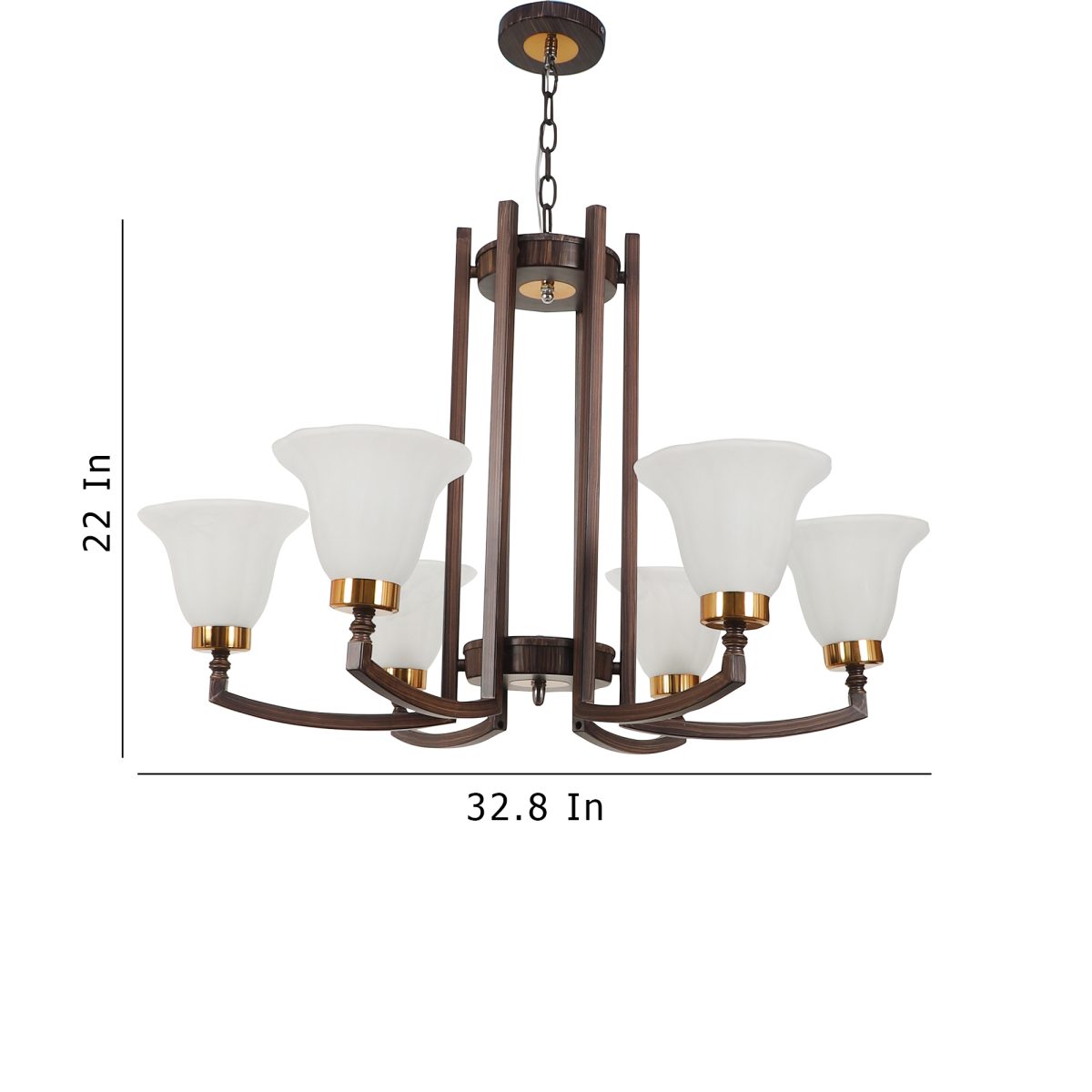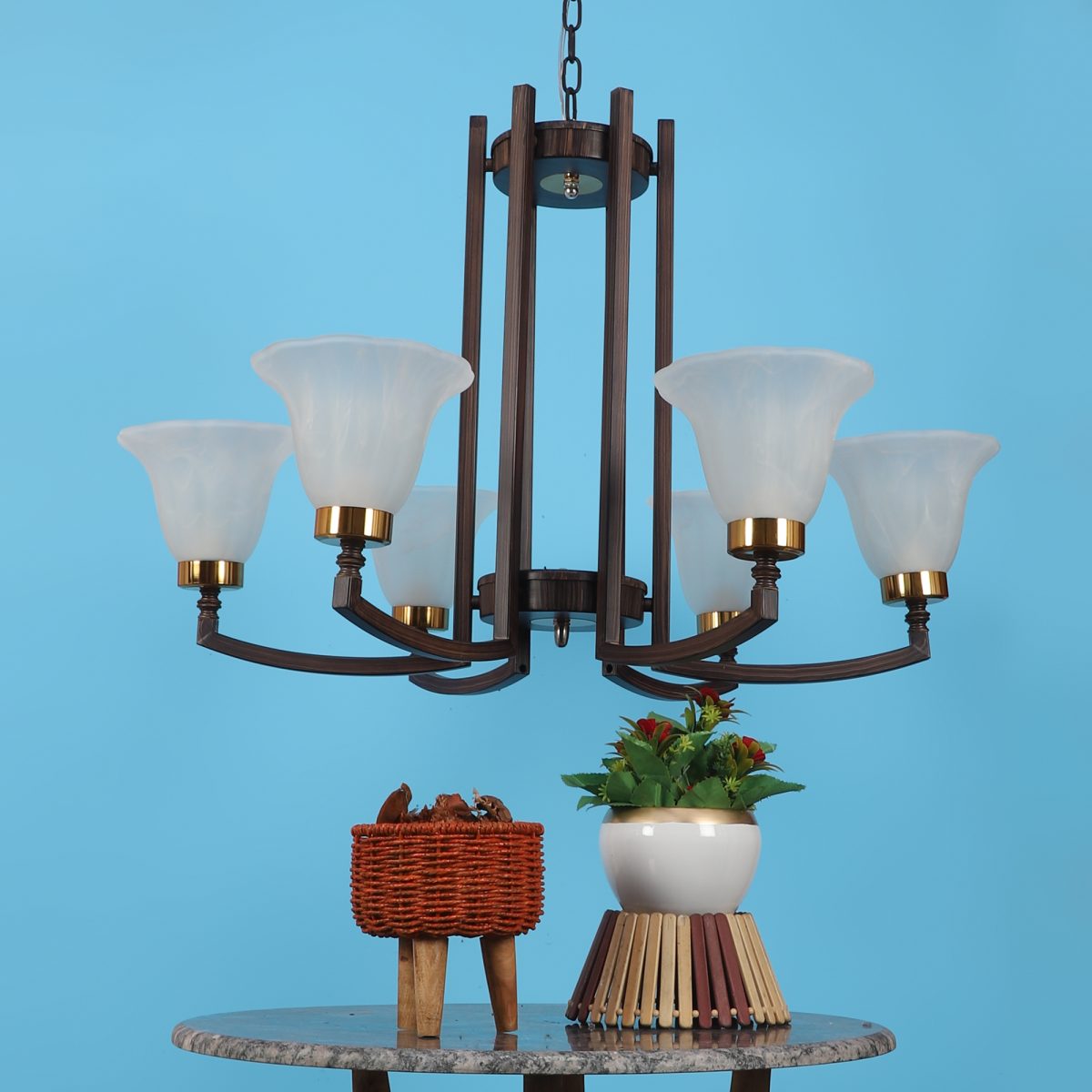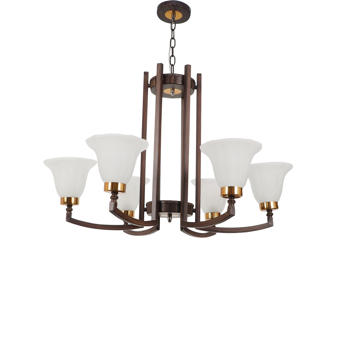 Dark brown (wood), gold finish, flower shaped textured white glass mounted on a designer frame made of mild steel having six lights. This is a hanging type chandelier in which the base plate is fixed to the ceiling with the help of straight clamp and screws. The suspension can be adjusted at time of installation to the desired height. It is maintenance free, easy to remove glass and wash them. Comes with an E27 holder, only the change of lamp is required, which is available locally everywhere. Application includes both residential and commercial premises wherever it matches with your interiors. Matching wall light code WL2515, WL2516. Can be customized as per requirement in case of bulk quantities. LAMP NOT INCLUDED.
