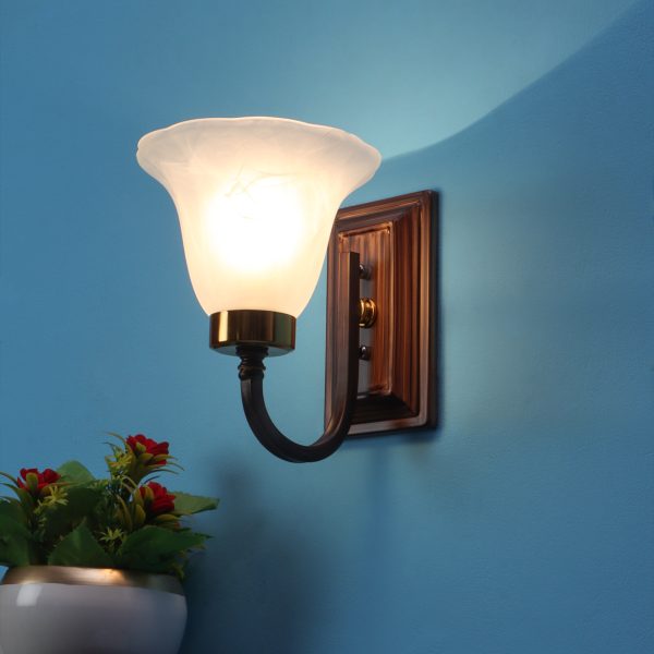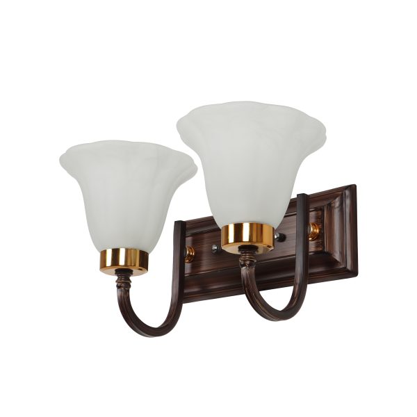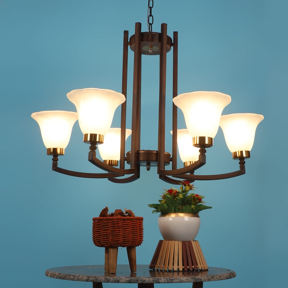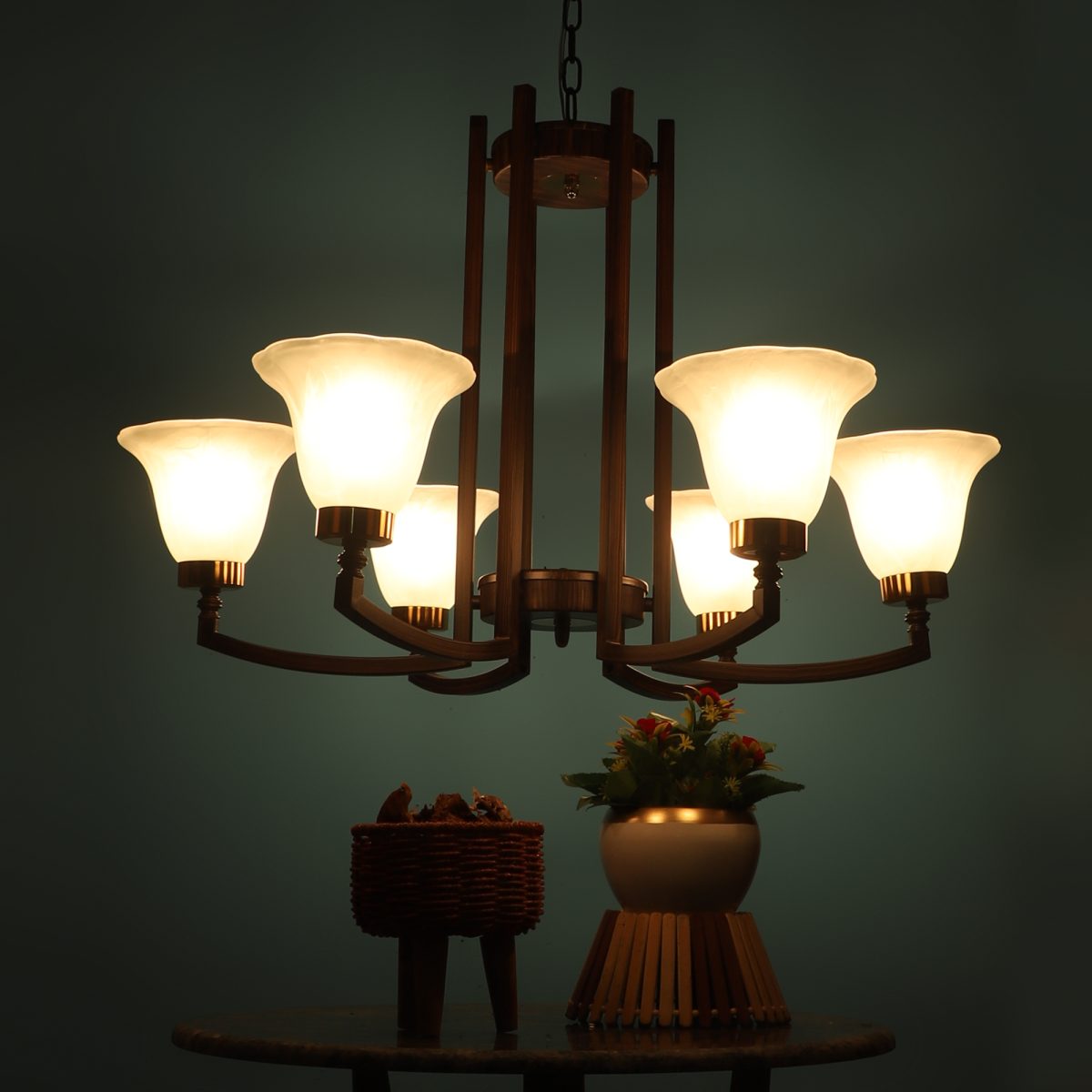 Dark brown (wood), gold finish, flower shaped textured white glass mounted on a designer frame made of mild steel having six lights. This is a hanging type chandelier in which the base plate is fixed to the ceiling with the help of straight clamp and screws. The suspension can be adjusted at time of installation to the desired height. It is maintenance free, easy to remove glass and wash them. Comes with an E27 holder, only the change of lamp is required, which is available locally everywhere. Application includes both residential and commercial premises wherever it matches with your interiors. Matching wall light code WL2515, WL2516. Can be customized as per requirement in case of bulk quantities. LAMP NOT INCLUDED.