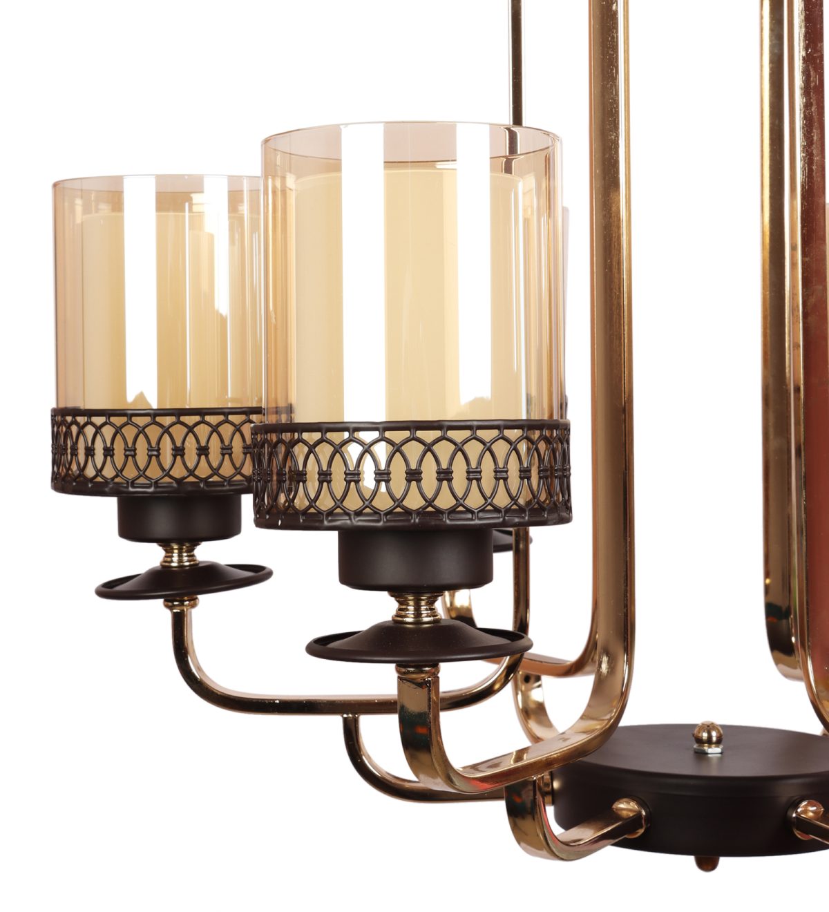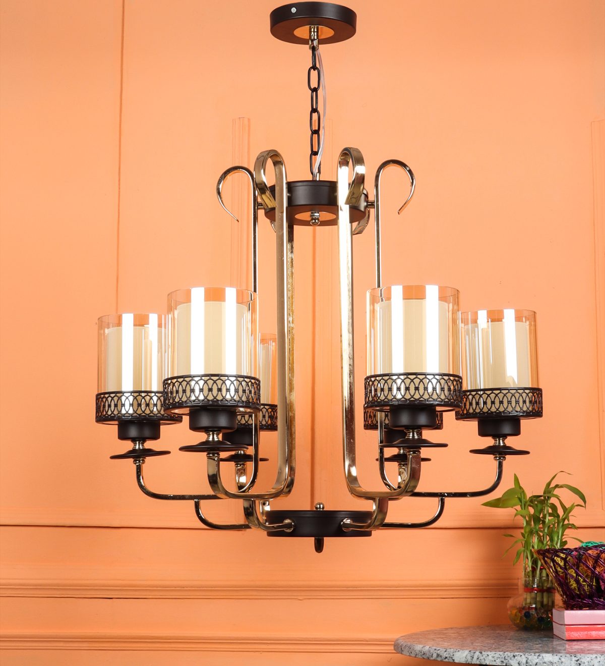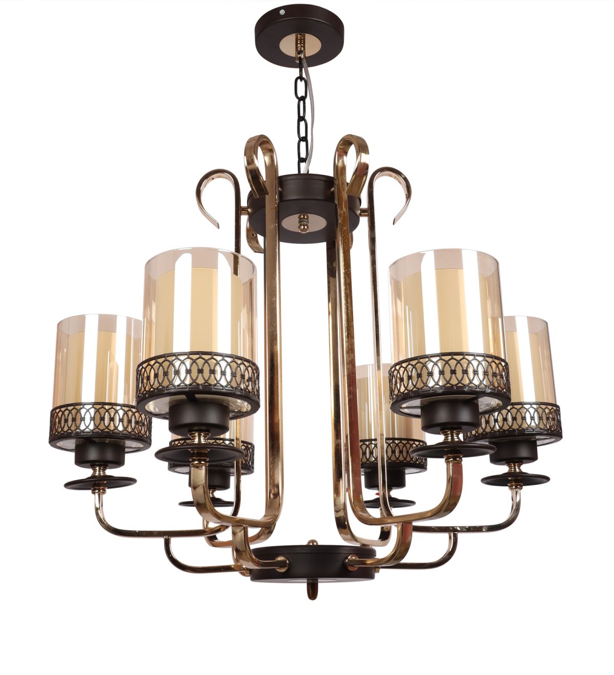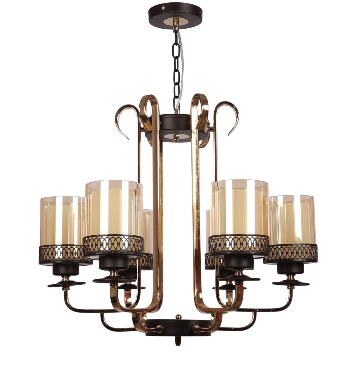 Brown, gold finish, round, cylindrical champagne coloured two layered glass mounted on a designer frame made of mild steel having six lights. This is a hanging type chandelier in which the base plate is fixed to the ceiling with the help of straight clamp and screws. The suspension can be adjusted at time of installation to the desired height. It is maintenance free, it is easy to remove glass and wash them. Comes with an E27 holder, only the change of lamp is required, which is available locally everywhere. Application includes both residential and commercial premises wherever it matches with your interiors. Matching wall light code WL2697, WL2698. Can be customized as per requirement in case of bulk quantities. LAMP NOT INCLUDED.