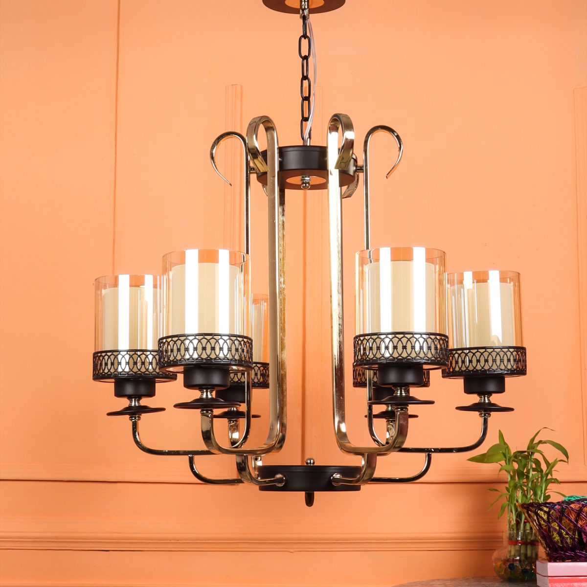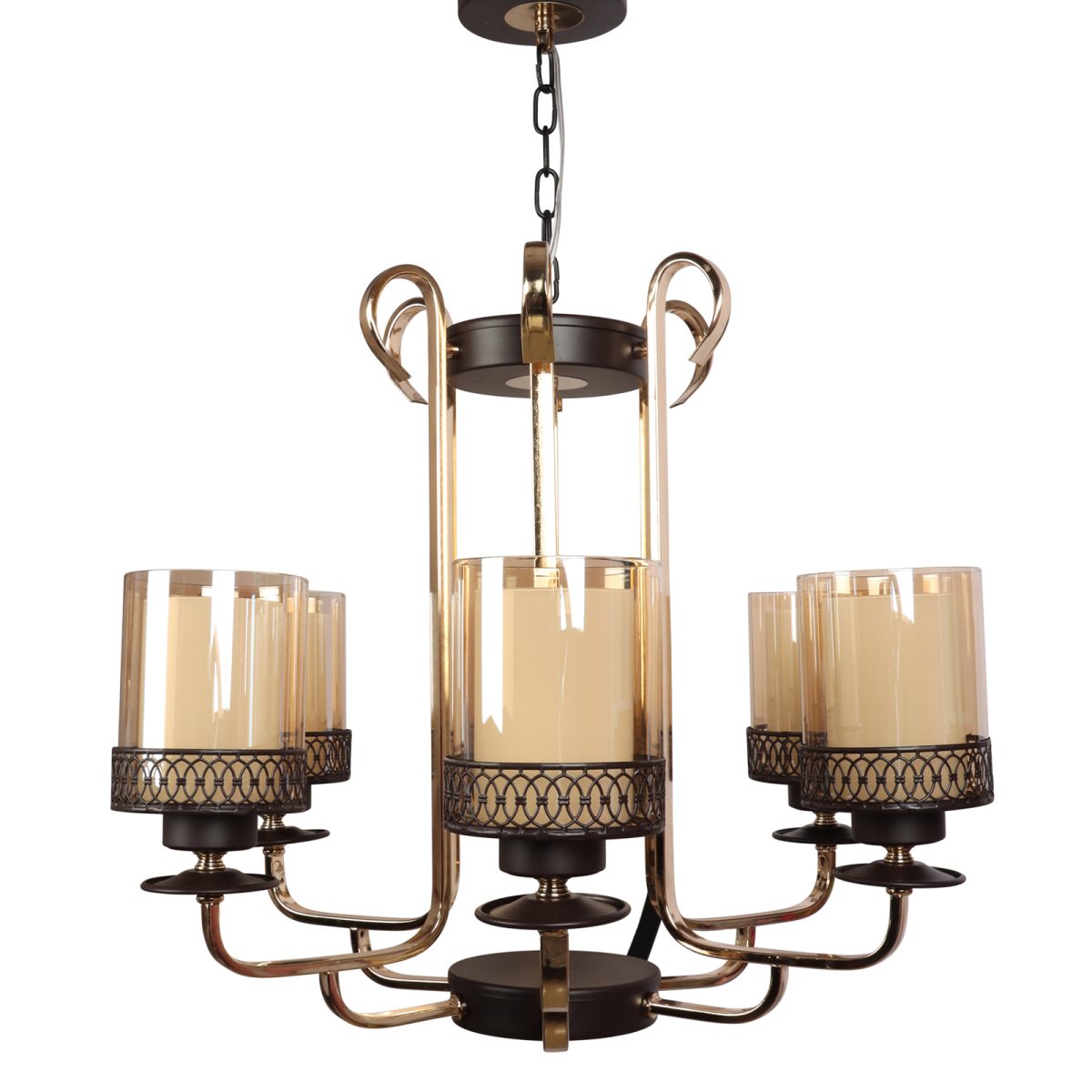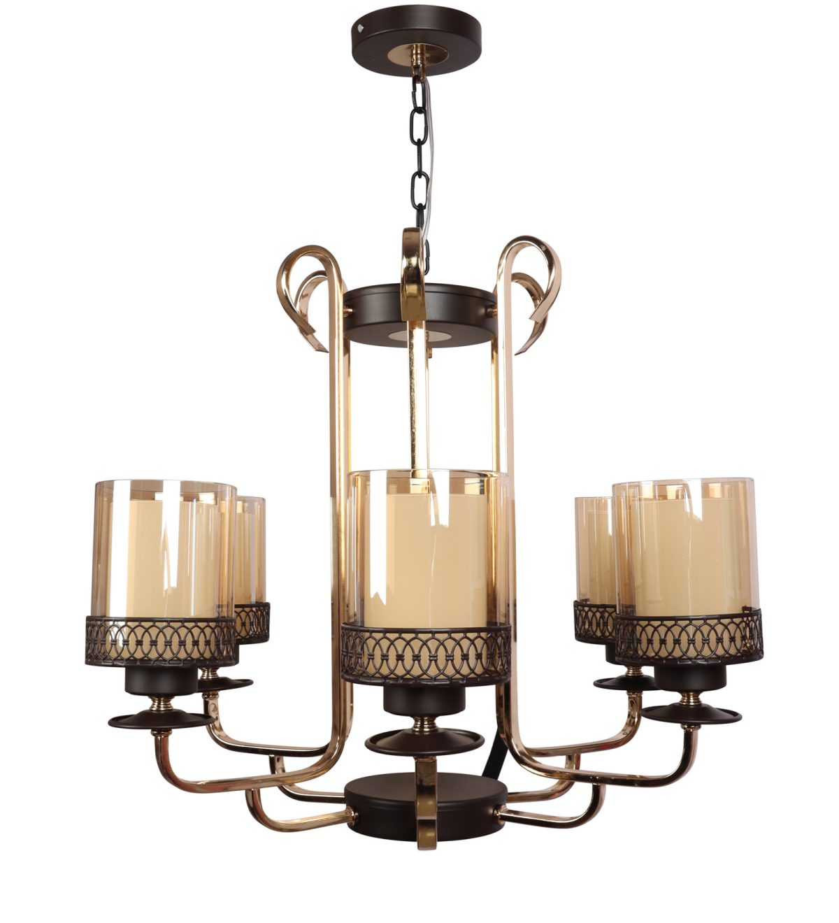 Brown, gold finish, round, cylindrical champagne coloured two layered glass mounted on a designer frame made of mild steel having six lights. This is a hanging type chandelier in which the base plate is fixed to the ceiling with the help of straight clamp and screws. The suspension can be adjusted at time of installation to the desired height. It is maintenance free, it is easy to remove glass and wash them. Comes with an E27 holder, only the change of lamp is required, which is available locally everywhere. Application includes both residential and commercial premises wherever it matches with your interiors. Matching wall light code WL2697, WL2698. Can be customized as per requirement in case of bulk quantities. LAMP NOT INCLUDED.