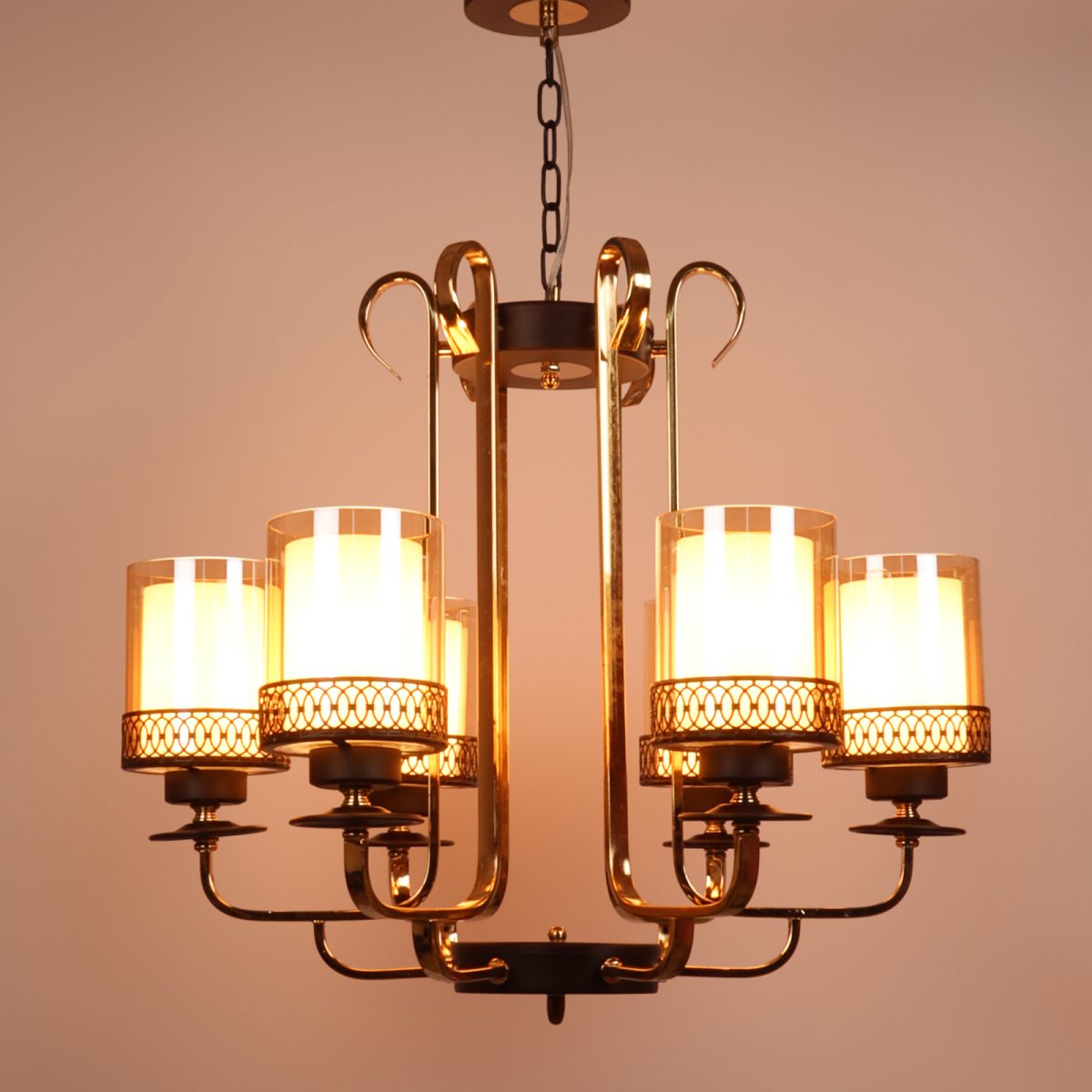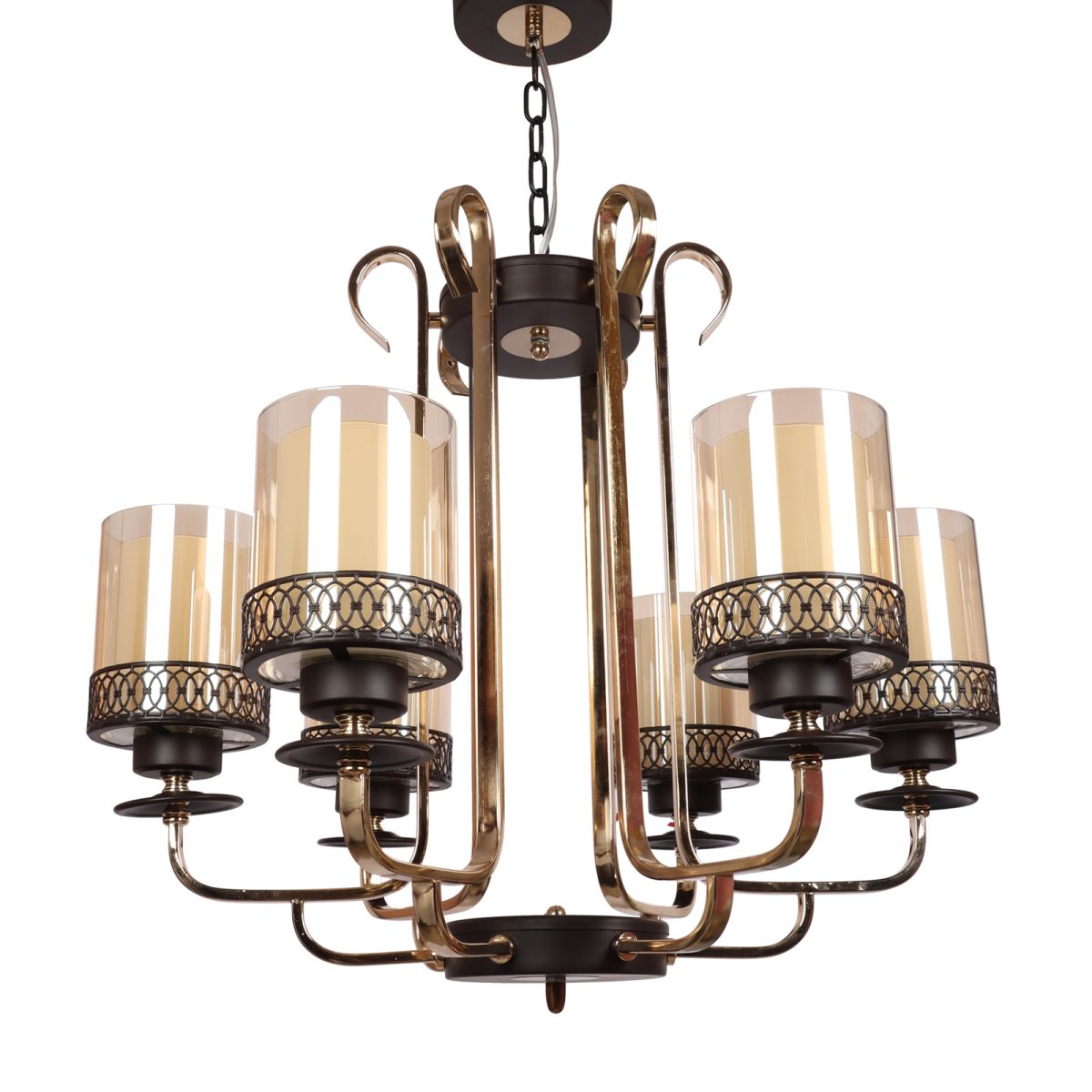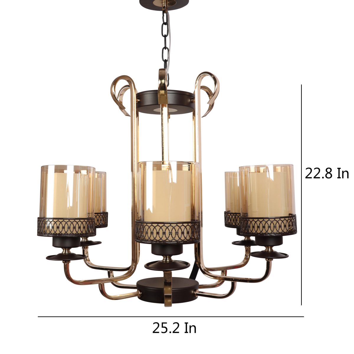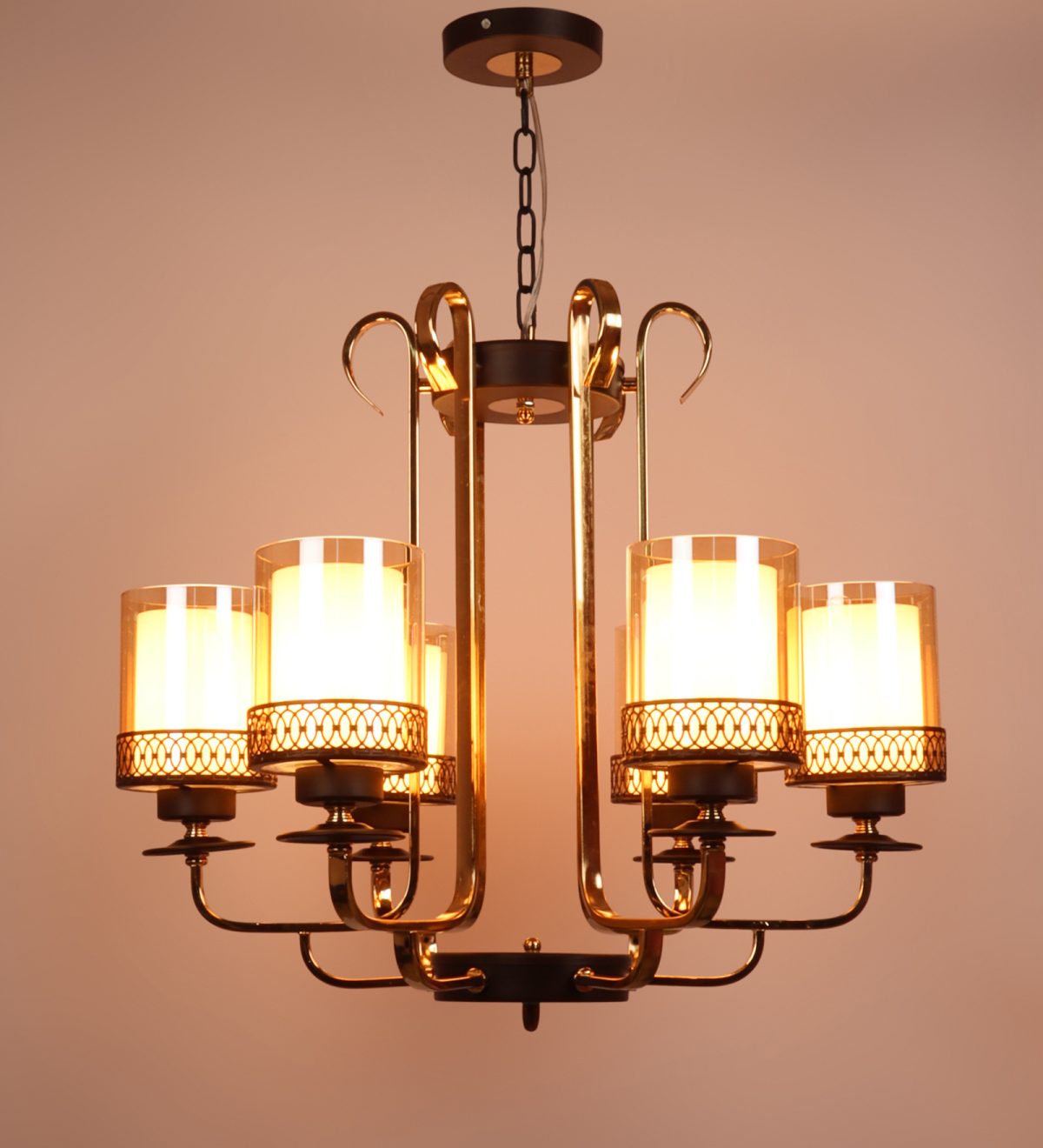 Brown, gold finish, round, cylindrical champagne coloured two layered glass mounted on a designer frame made of mild steel having six lights. This is a hanging type chandelier in which the base plate is fixed to the ceiling with the help of straight clamp and screws. The suspension can be adjusted at time of installation to the desired height. It is maintenance free, it is easy to remove glass and wash them. Comes with an E27 holder, only the change of lamp is required, which is available locally everywhere. Application includes both residential and commercial premises wherever it matches with your interiors. Matching wall light code WL2697, WL2698. Can be customized as per requirement in case of bulk quantities. LAMP NOT INCLUDED.