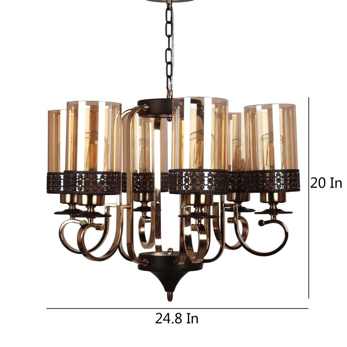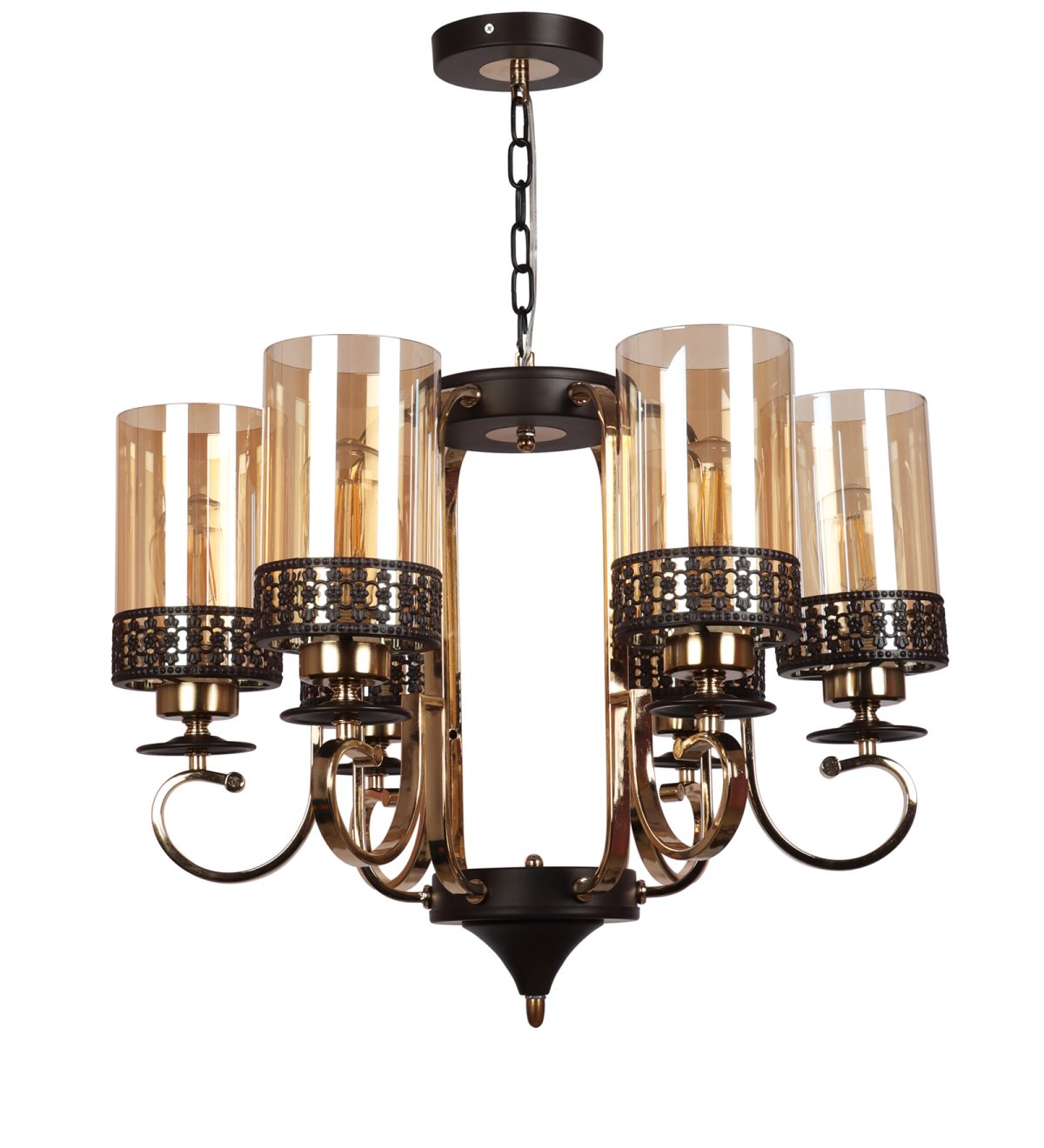 Brown, gold finish, round, cylindrical champagne coloured glass mounted on a designer frame made of mild steel having six lights. This is a hanging type chandelier in which the base plate is fixed to the ceiling with the help of straight clamp and screws. The suspension can be adjusted at time of installation to the desired height. It is maintenance free, it is easy to remove glass and wash them. Comes with an E27 holder, only the change of lamp is required, which is available locally everywhere. Application includes both residential and commercial premises wherever it matches with your interiors. Matching wall light code WL2723, WL2724. Can be customized as per requirement in case of bulk quantities. LAMP NOT INCLUDED.