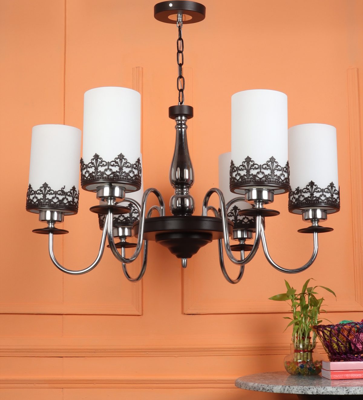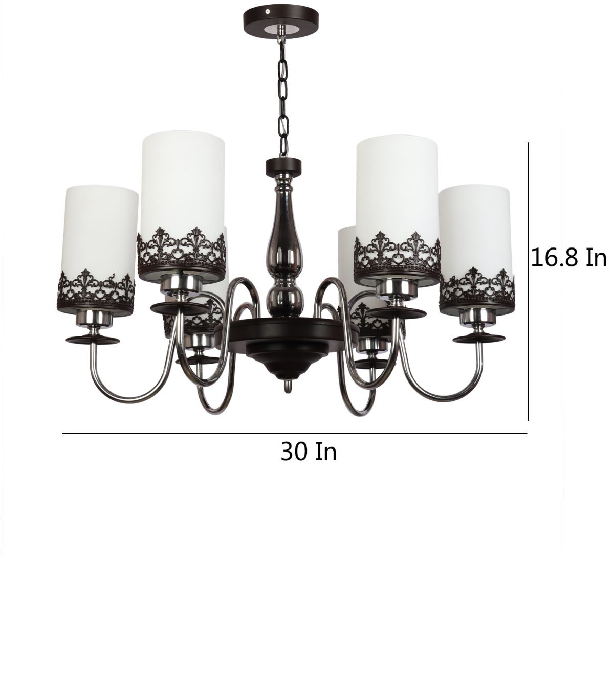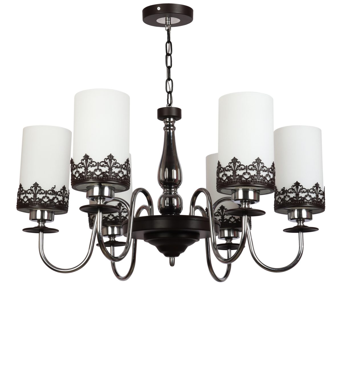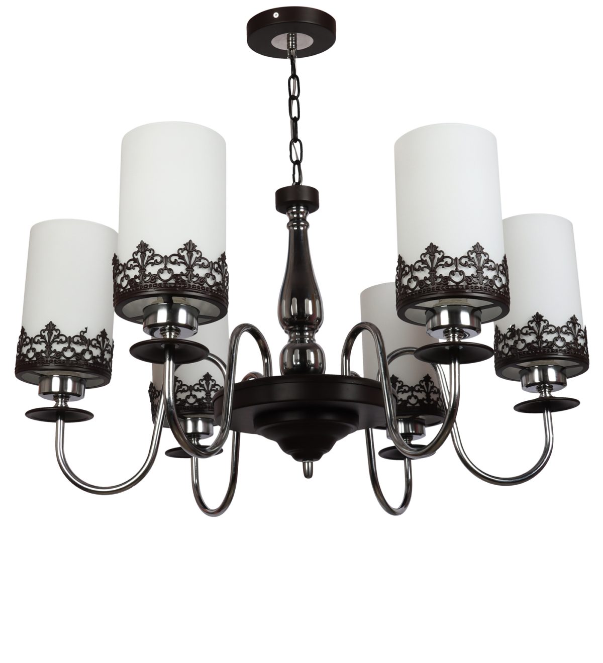 Dark brown (wood) finish, round, cylindrical white glass mounted on a designer frame made of mild steel having six lights. This is a hanging type chandelier in which the base cap is fixed to the ceiling with the help of straight clamp and screws. The suspension can be adjusted at time of installation to the desired height. It is maintenance free, it is easy to remove glass and wash them. Comes with an E27 holder, only the change of lamp is required, which is available locally everywhere. Application includes both residential and commercial premises wherever it matches with your interiors. Also available in nine lights having code CH462-9. Matching wall light code WL2727, WL2728. Can be customized as per requirement in case of bulk quantities. LAMP NOT INCLUDED.