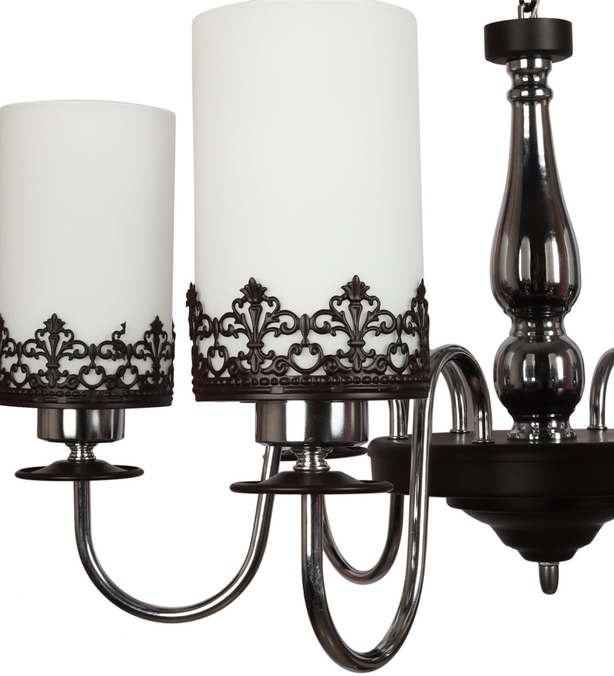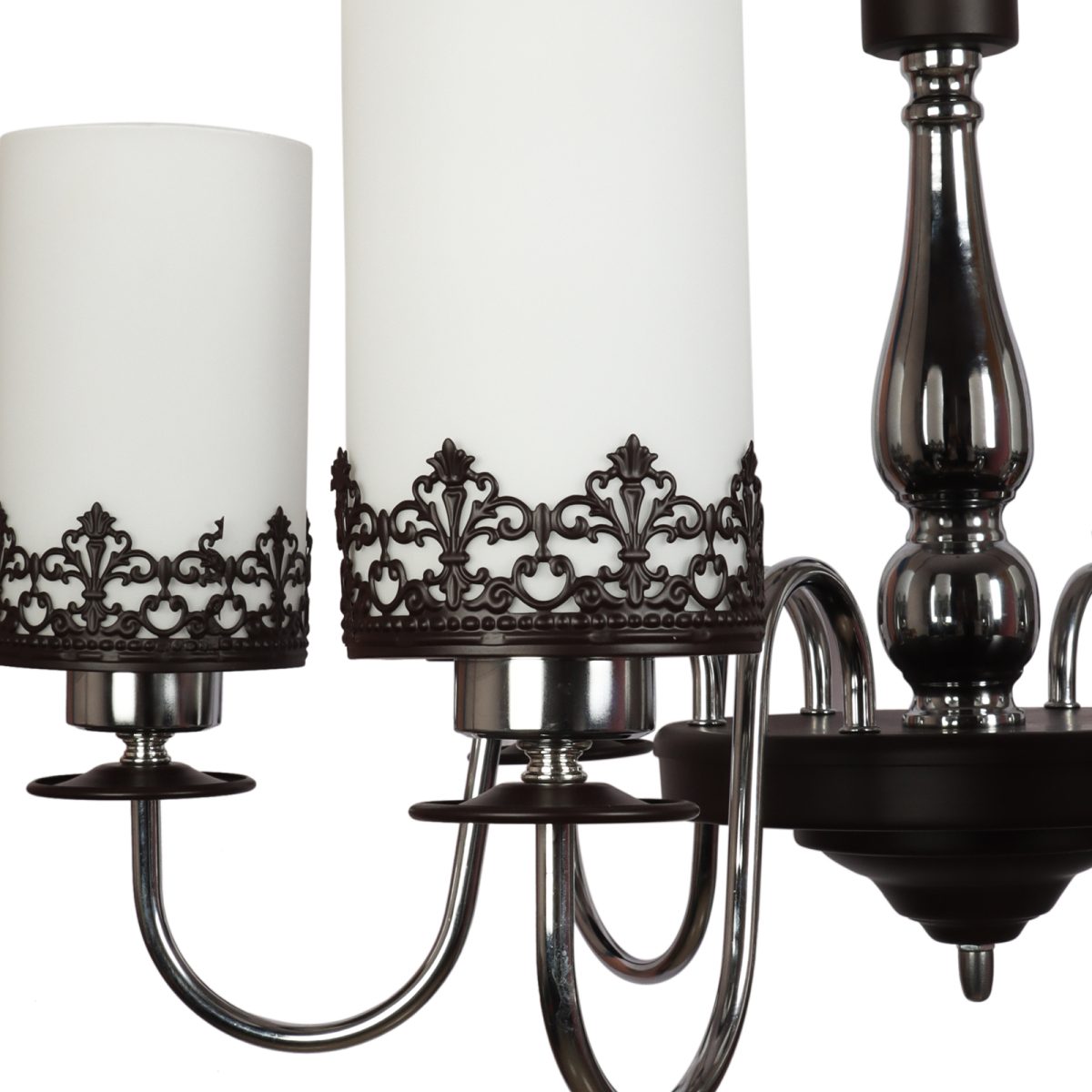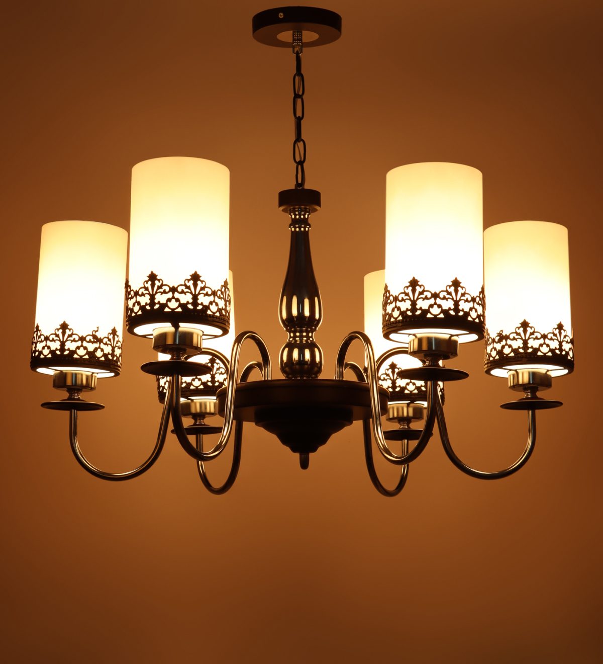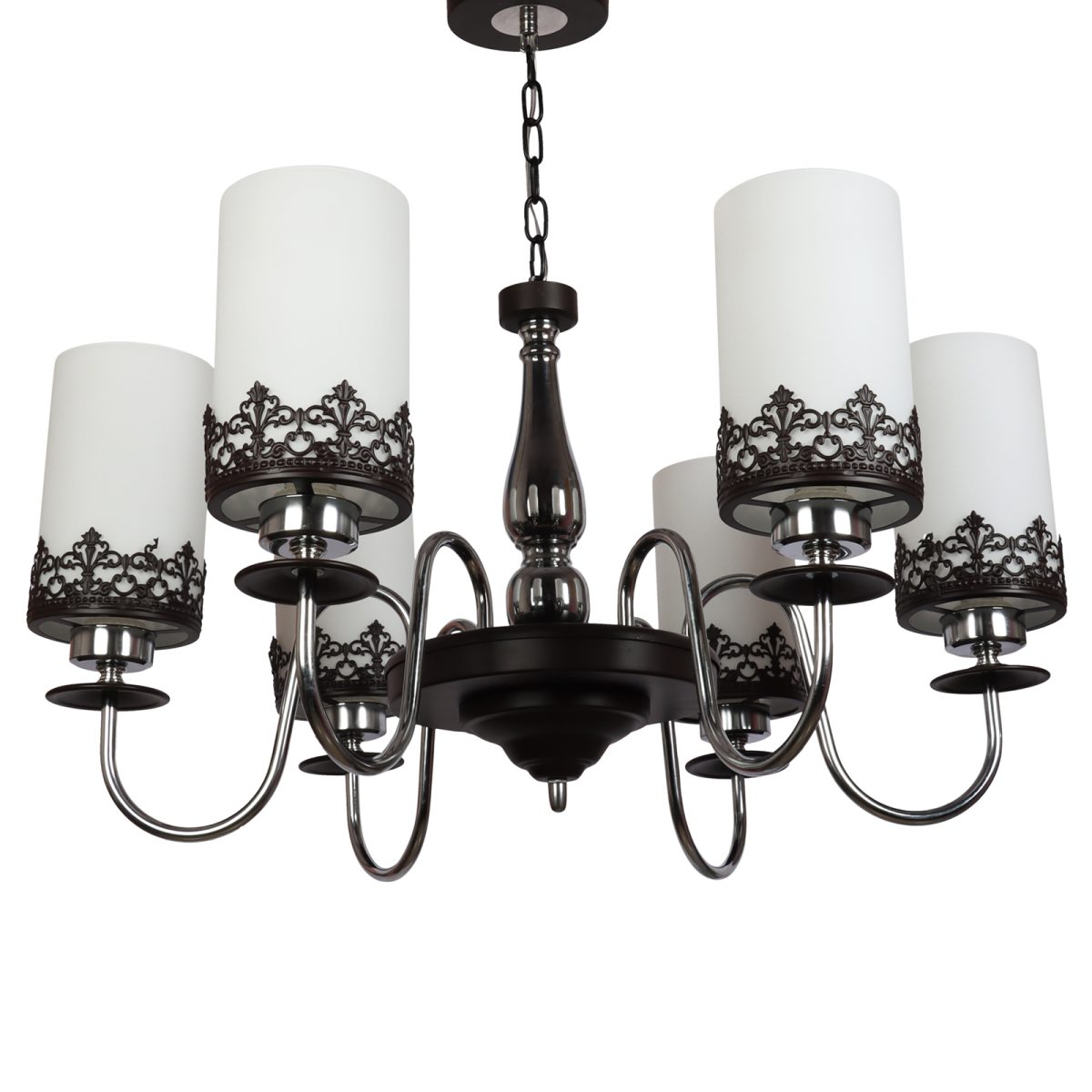 Dark brown (wood) finish, round, cylindrical white glass mounted on a designer frame made of mild steel having six lights. This is a hanging type chandelier in which the base cap is fixed to the ceiling with the help of straight clamp and screws. The suspension can be adjusted at time of installation to the desired height. It is maintenance free, it is easy to remove glass and wash them. Comes with an E27 holder, only the change of lamp is required, which is available locally everywhere. Application includes both residential and commercial premises wherever it matches with your interiors. Also available in nine lights having code CH462-9. Matching wall light code WL2727, WL2728. Can be customized as per requirement in case of bulk quantities. LAMP NOT INCLUDED.
