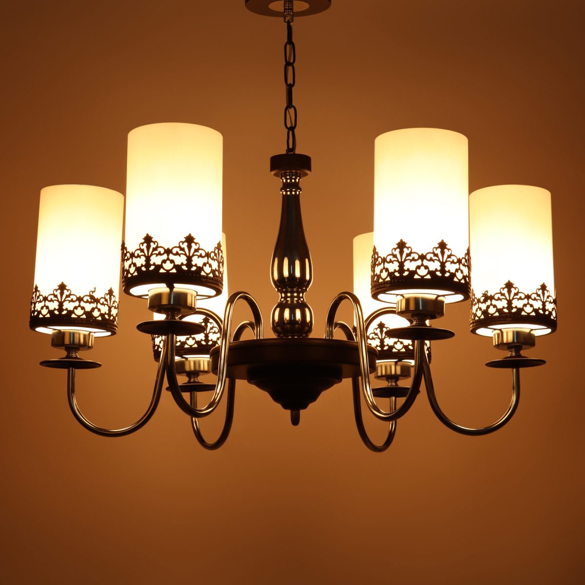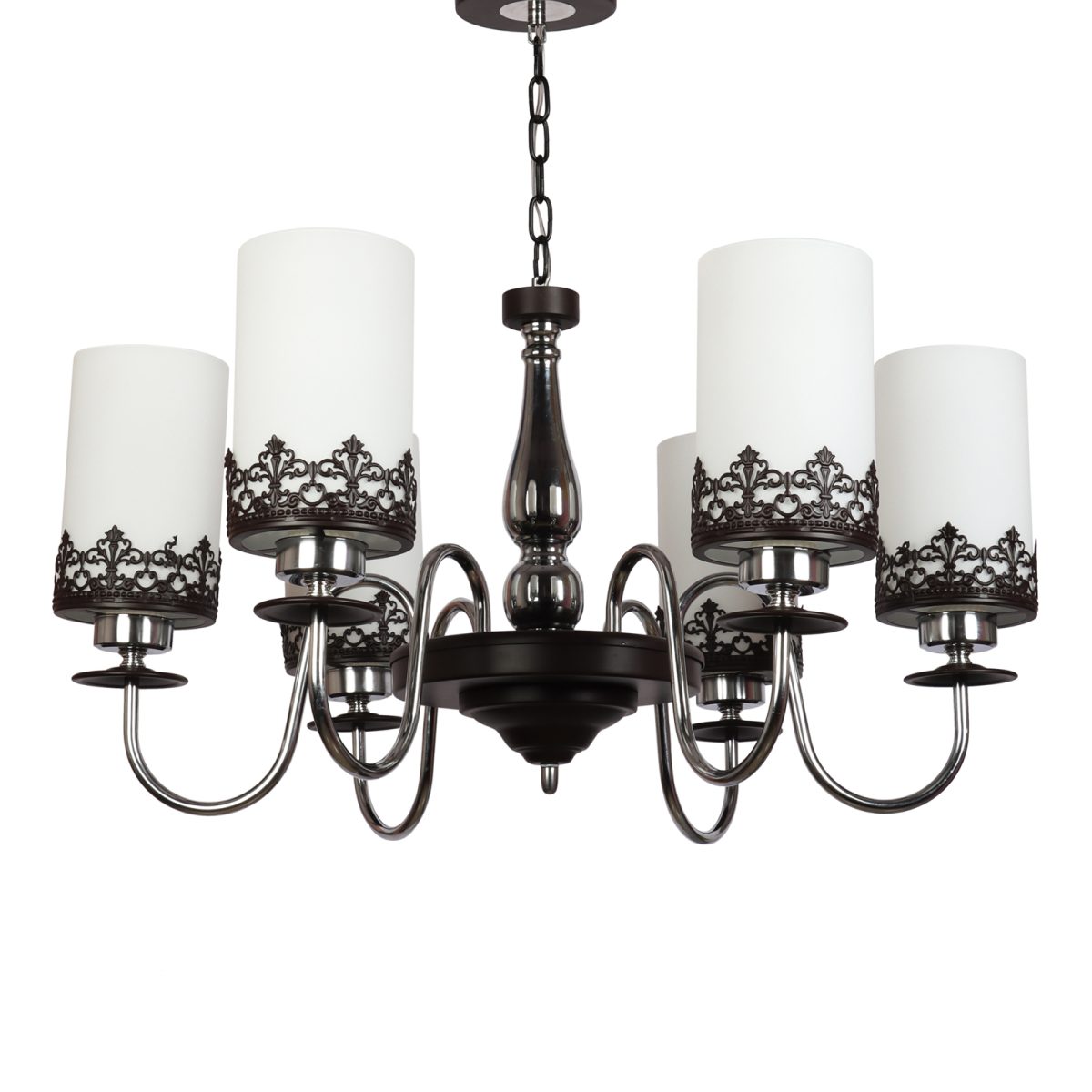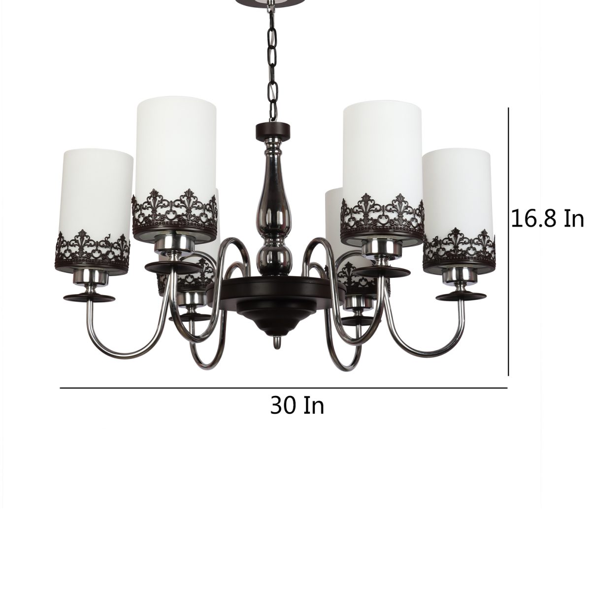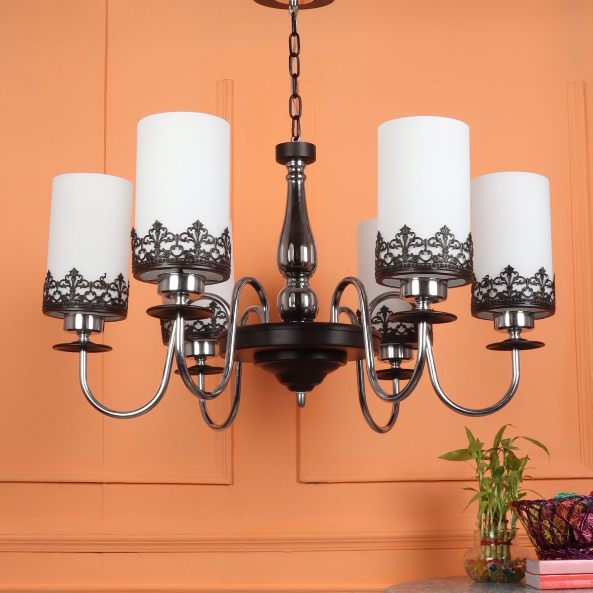 Dark brown (wood) finish, round, cylindrical white glass mounted on a designer frame made of mild steel having six lights. This is a hanging type chandelier in which the base cap is fixed to the ceiling with the help of straight clamp and screws. The suspension can be adjusted at time of installation to the desired height. It is maintenance free, it is easy to remove glass and wash them. Comes with an E27 holder, only the change of lamp is required, which is available locally everywhere. Application includes both residential and commercial premises wherever it matches with your interiors. Also available in nine lights having code CH462-9. Matching wall light code WL2727, WL2728. Can be customized as per requirement in case of bulk quantities. LAMP NOT INCLUDED.