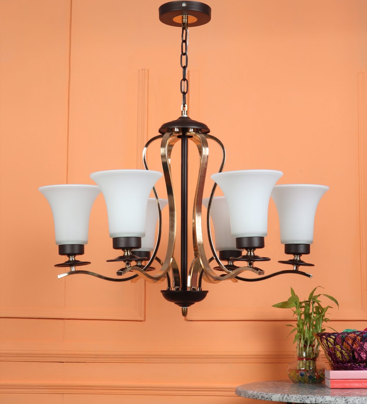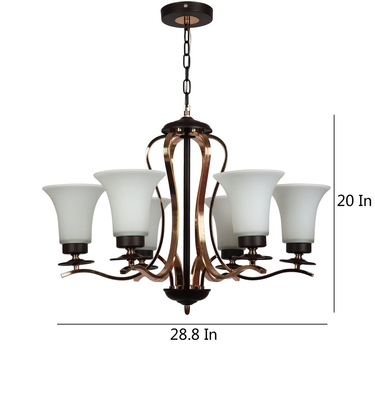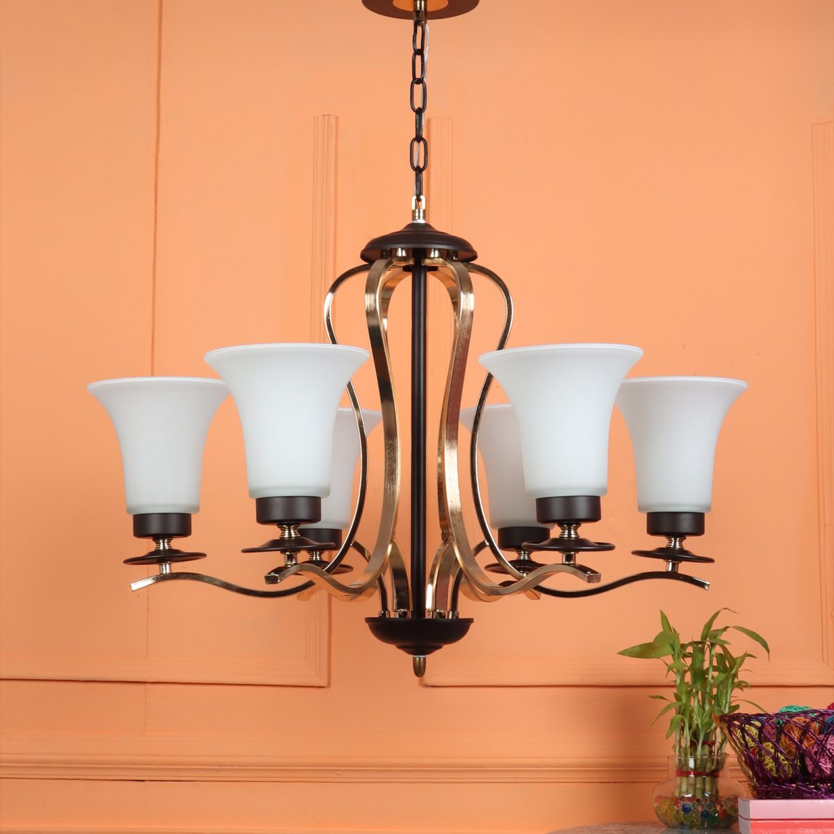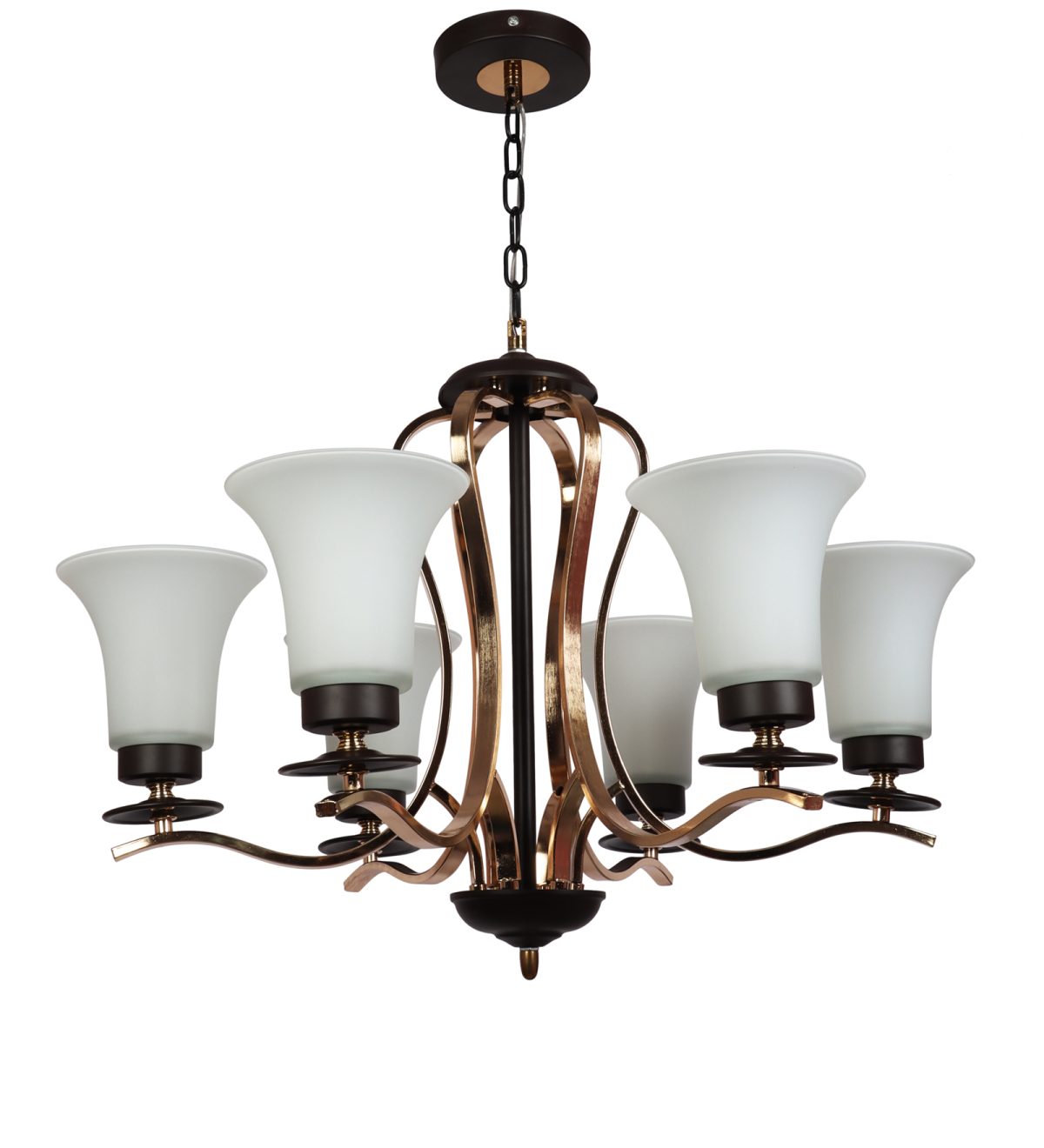 Brown, gold finish, bell shaped white glass mounted on a designer frame made of mild steel having six lights. This is a hanging type chandelier in which the base plate is fixed to the ceiling with the help of straight clamp and screws. The suspension can be adjusted at time of installation to the desired height. It is maintenance free, it is easy to remove glass and wash them. Comes with an E27 holder, only the change of lamp is required, which is available locally everywhere. Application includes both residential and commercial premises wherever it matches with your interiors. Matching wall light code WL2731, WL2732. Can be customized as per requirement in case of bulk quantities. LAMP NOT INCLUDED.