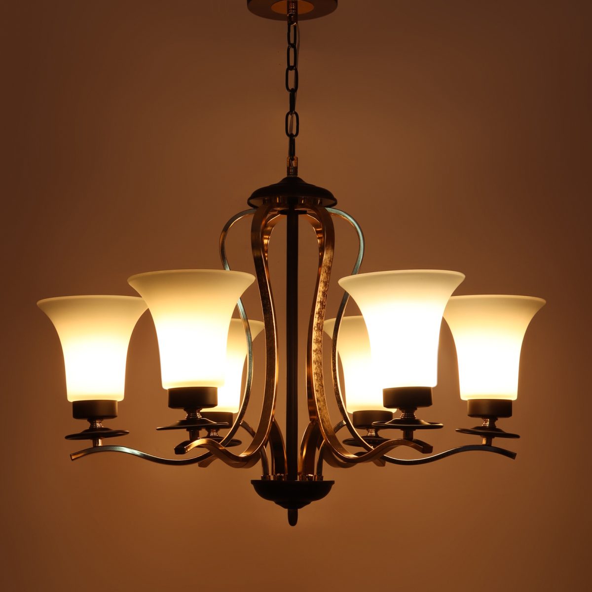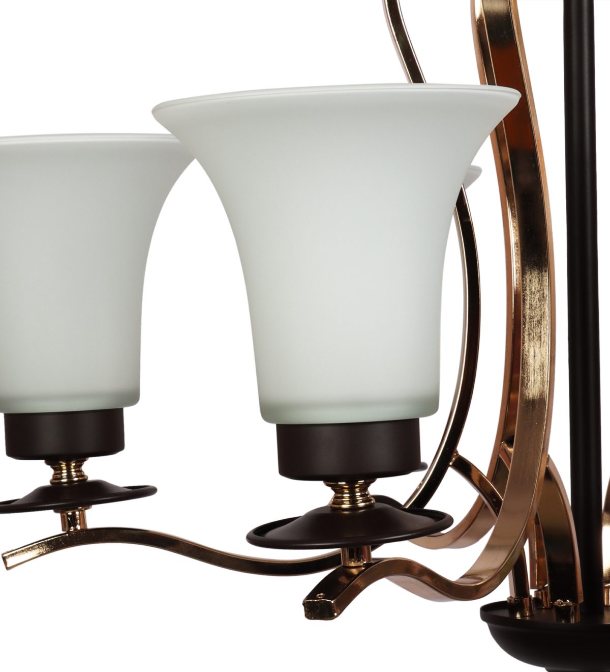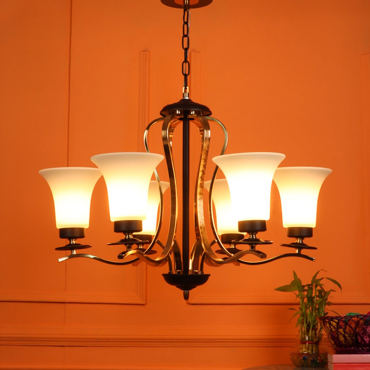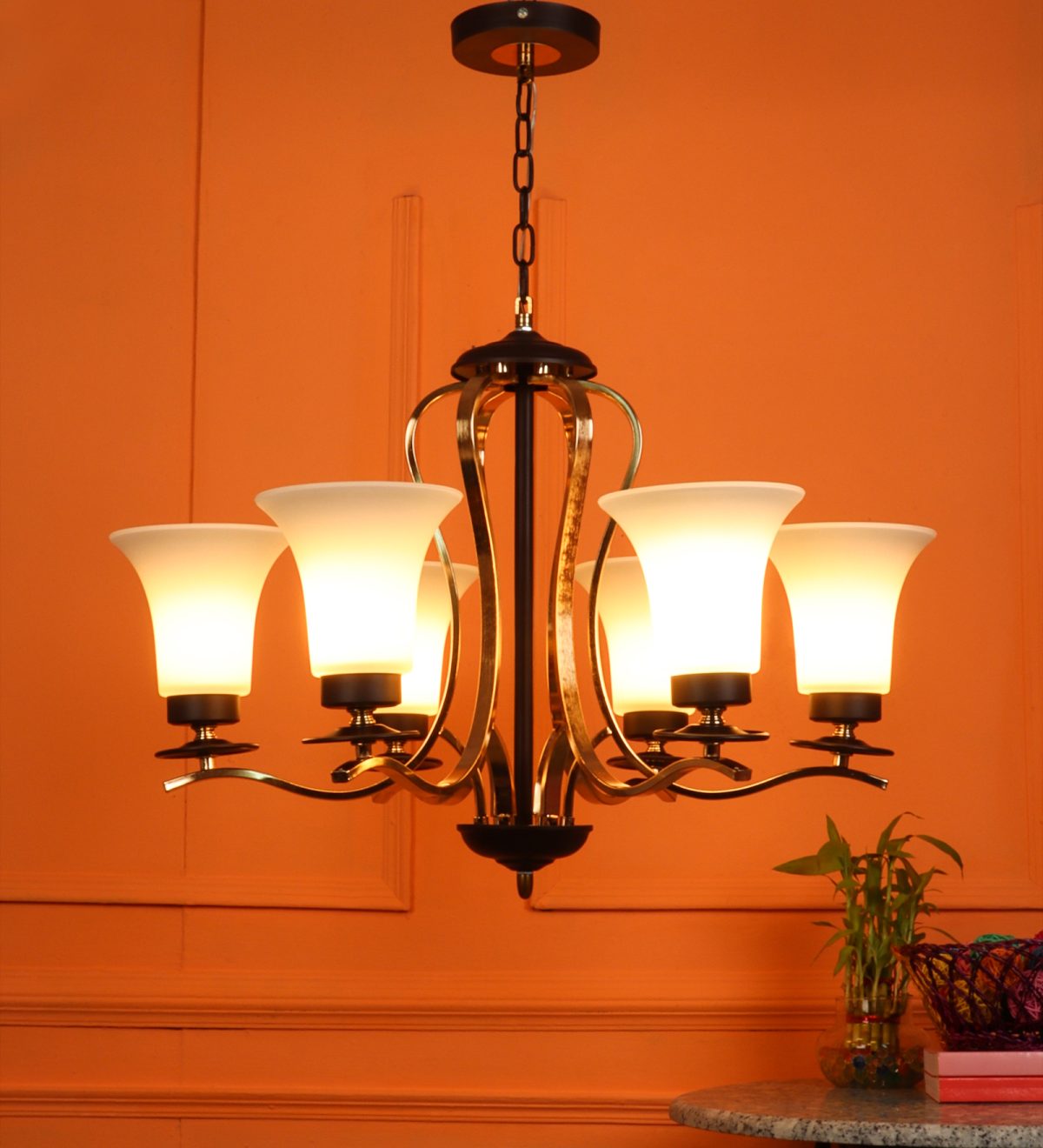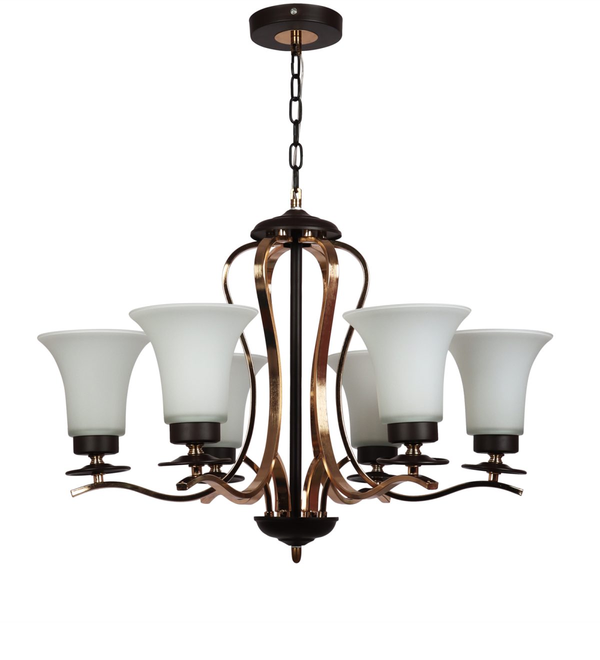 Brown, gold finish, bell shaped white glass mounted on a designer frame made of mild steel having six lights. This is a hanging type chandelier in which the base plate is fixed to the ceiling with the help of straight clamp and screws. The suspension can be adjusted at time of installation to the desired height. It is maintenance free, it is easy to remove glass and wash them. Comes with an E27 holder, only the change of lamp is required, which is available locally everywhere. Application includes both residential and commercial premises wherever it matches with your interiors. Matching wall light code WL2731, WL2732. Can be customized as per requirement in case of bulk quantities. LAMP NOT INCLUDED.