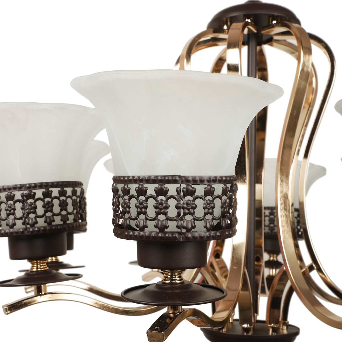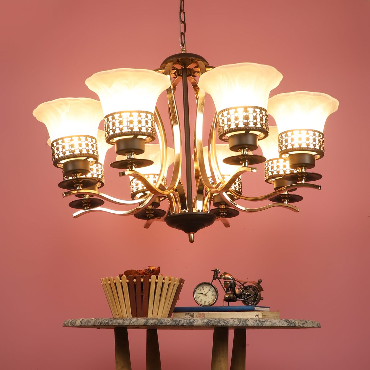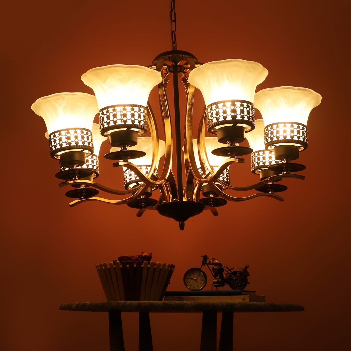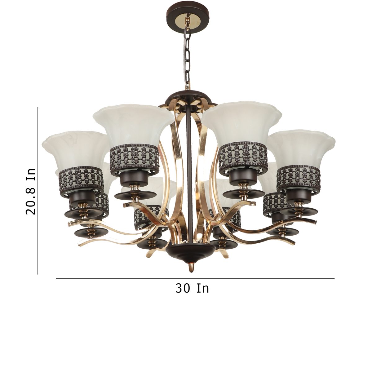 Brown, gold finish, round, flower shaped textured glass mounted on a designer frame made of mild steel having eight lights. This is a hanging type chandelier in which the base plate is fixed to the ceiling with the help of straight clamp and screws. The suspension can be adjusted at time of installation to the desired height. It is maintenance free, it is easy to remove glass and wash them. Comes with an E27 holder, only the change of lamp is required, which is available locally everywhere. Application includes both residential and commercial premises wherever it matches with your interiors. Matching wall light code WL2699, WL2700. Can be customized as per requirement in case of bulk quantities. LAMP NOT INCLUDED.