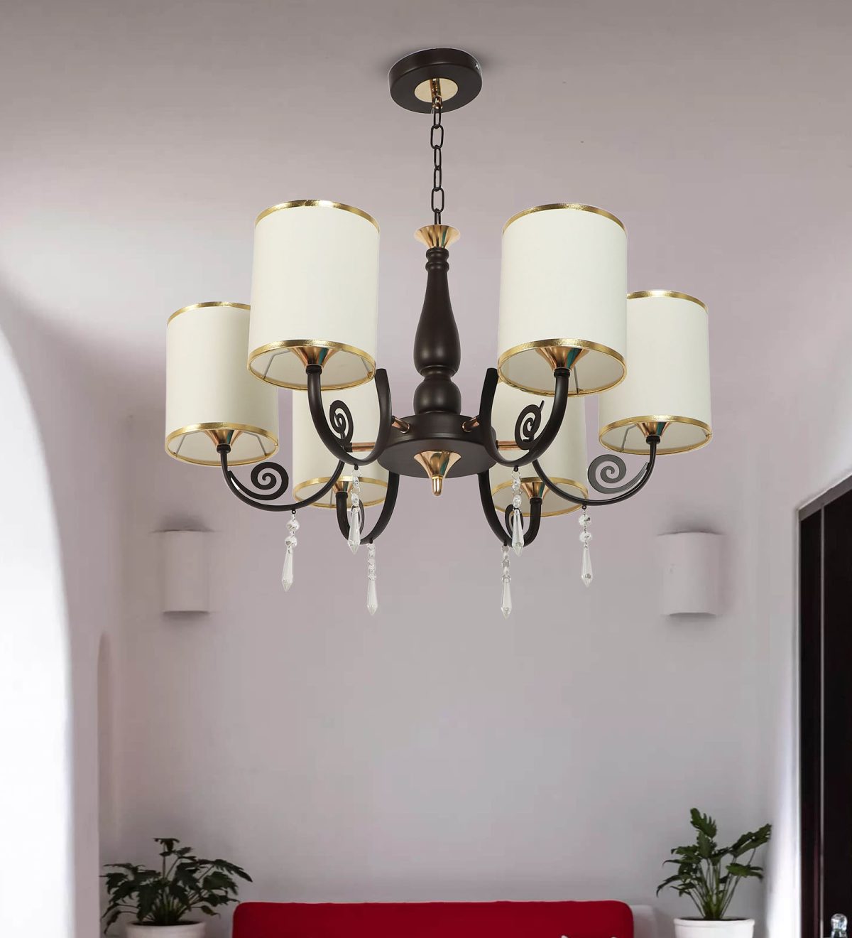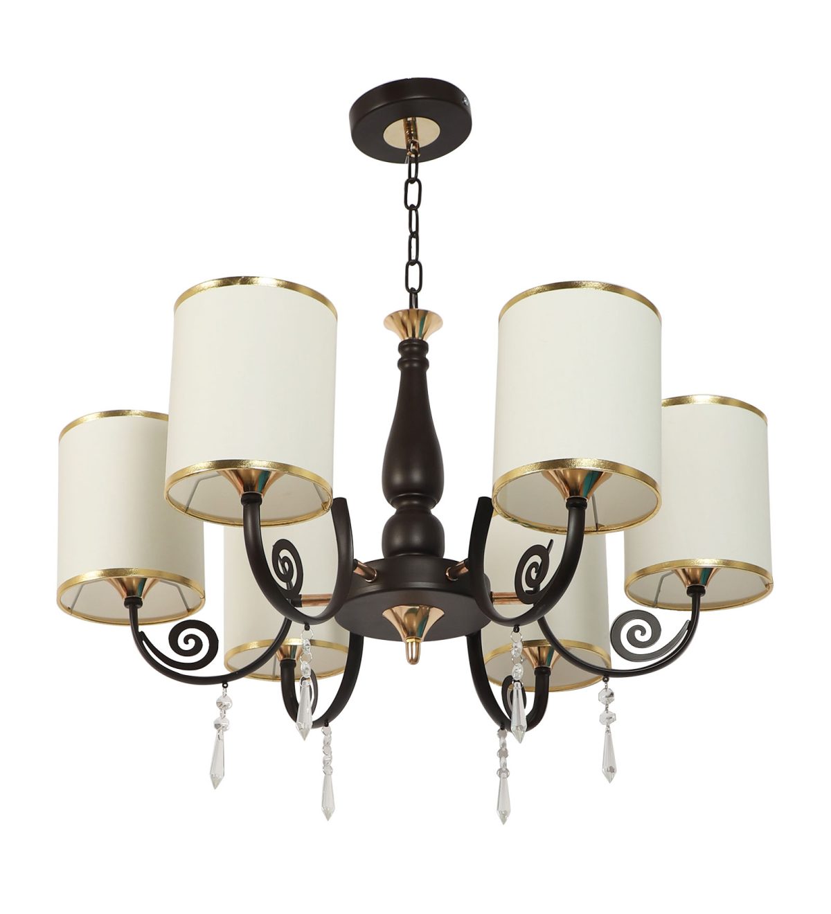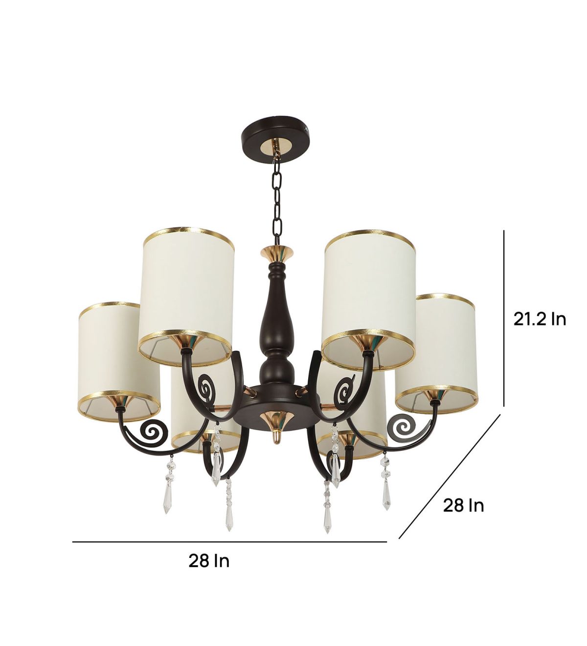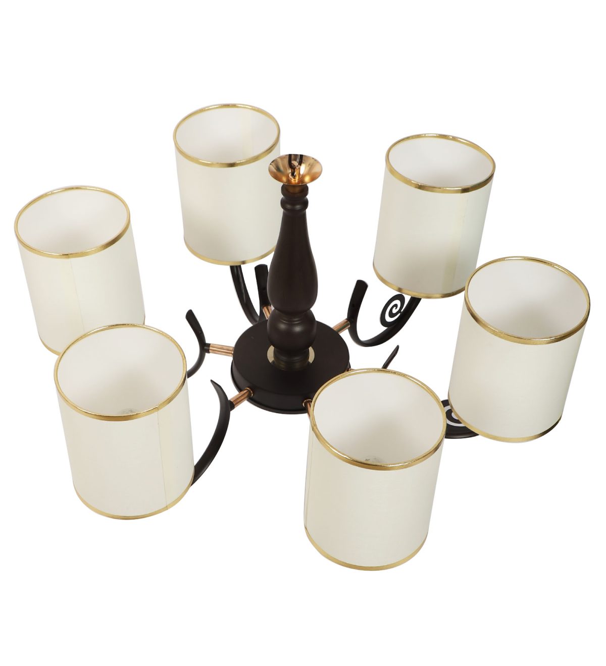 Brown, gold finish fabric shade chandellier having six lights.The suspension can be adjusted at time of installation to the desired height. It is maintenance free, it is easy to remove glasses and wash them. Comes with an E27 holder. Can be customized as per requirement. Other sizes can be made as per requirement. LAMP NOT INCLUDED.