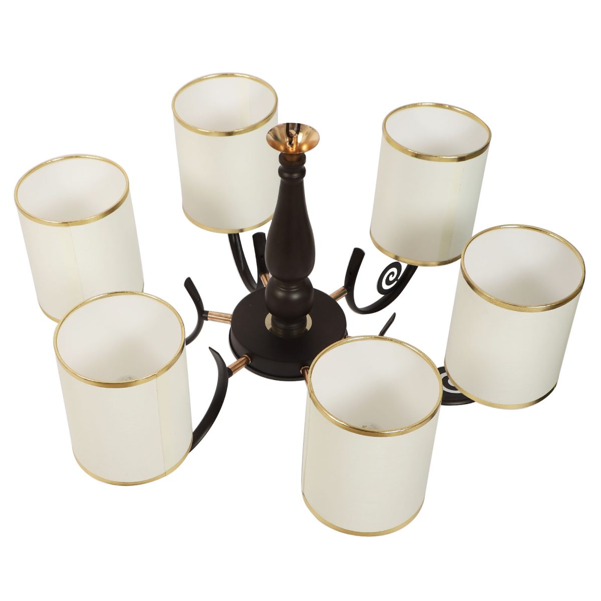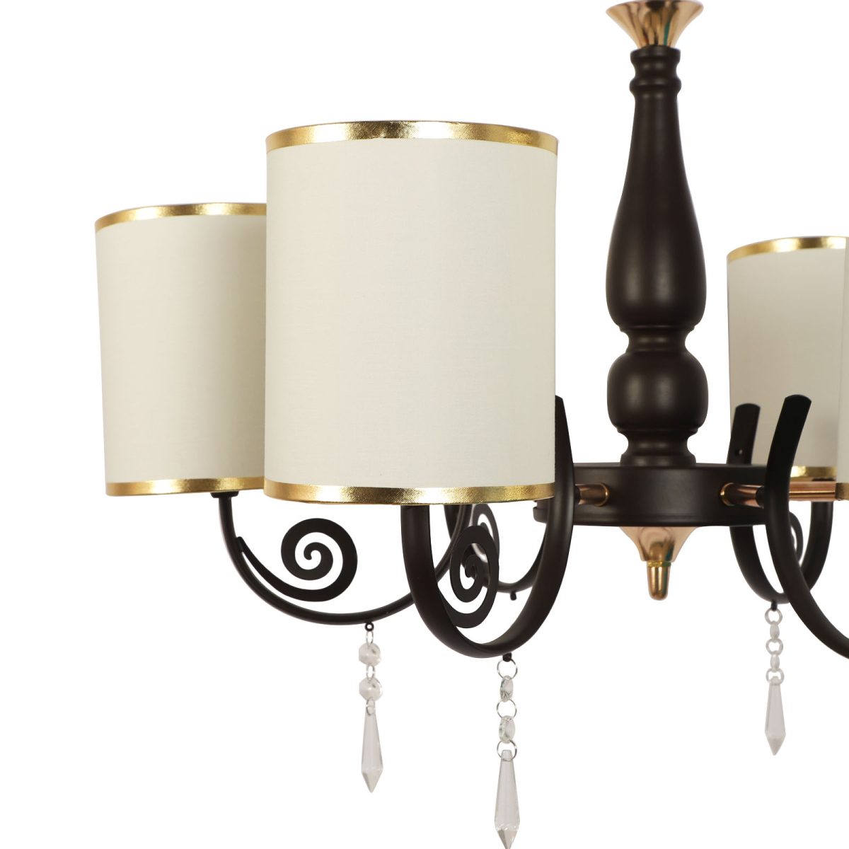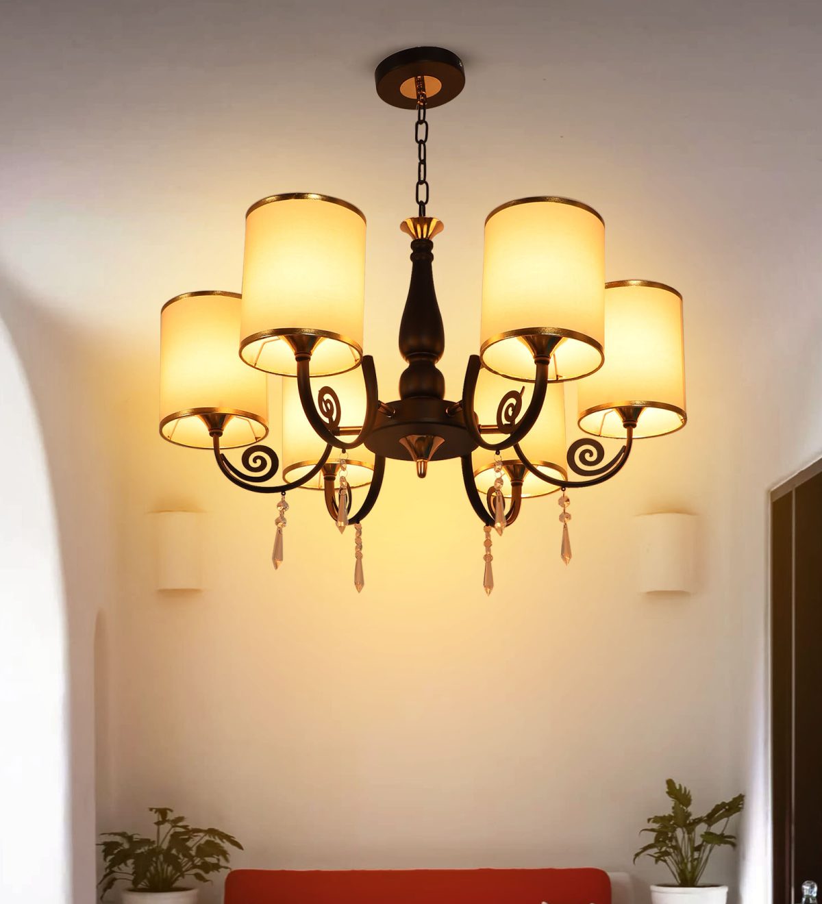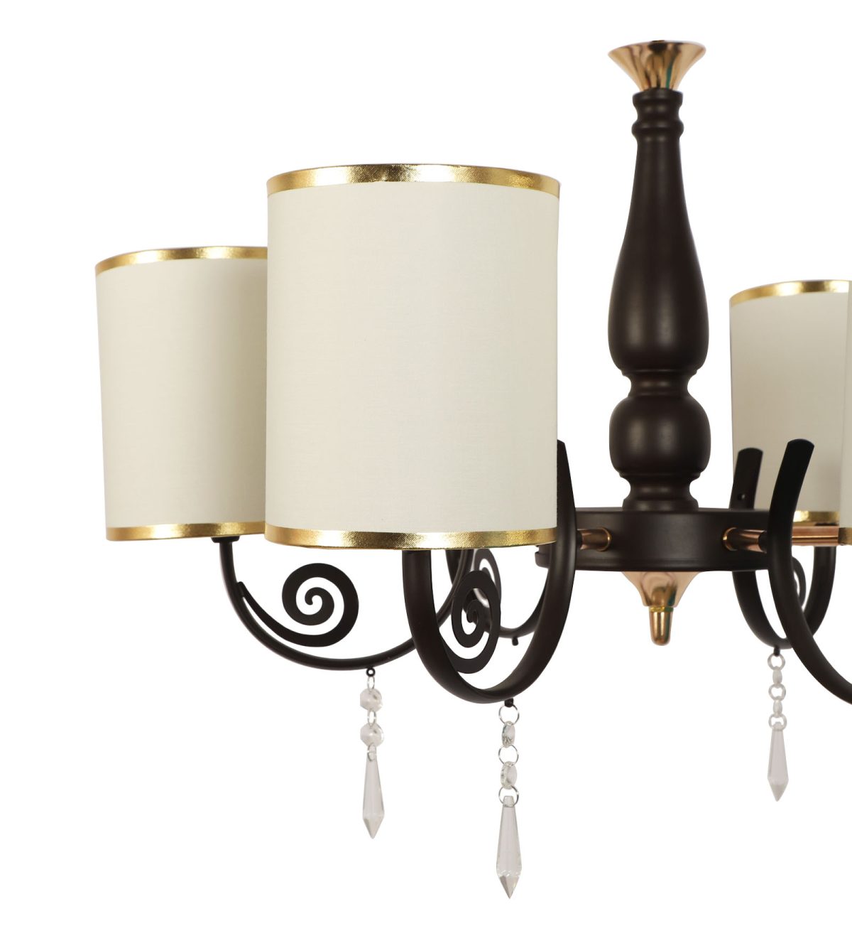 Brown, gold finish fabric shade chandellier having six lights.The suspension can be adjusted at time of installation to the desired height. It is maintenance free, it is easy to remove glasses and wash them. Comes with an E27 holder. Can be customized as per requirement. Other sizes can be made as per requirement. LAMP NOT INCLUDED.