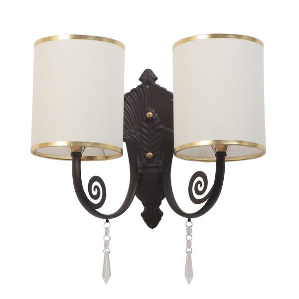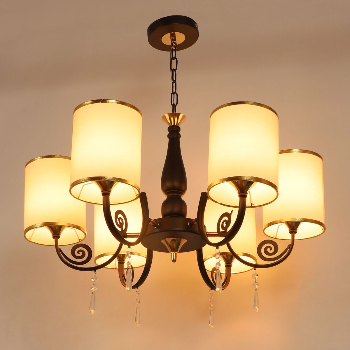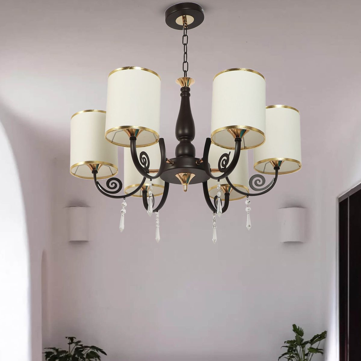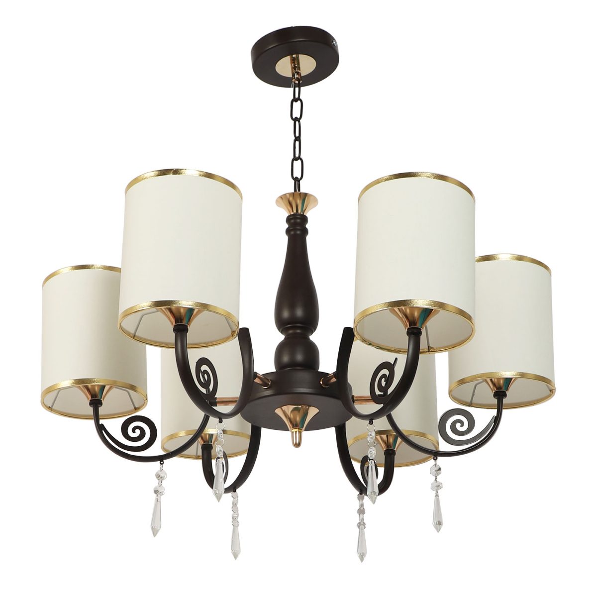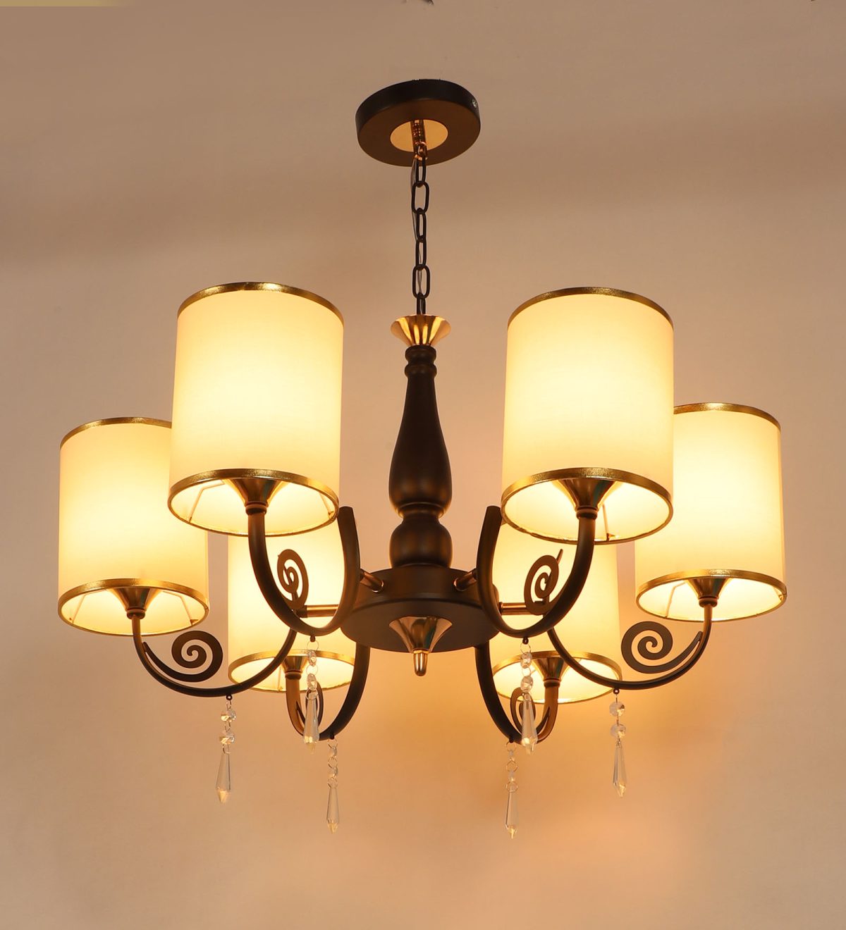 Brown, gold finish fabric shade chandellier having six lights.The suspension can be adjusted at time of installation to the desired height. It is maintenance free, it is easy to remove glasses and wash them. Comes with an E27 holder. Can be customized as per requirement. Other sizes can be made as per requirement. LAMP NOT INCLUDED.