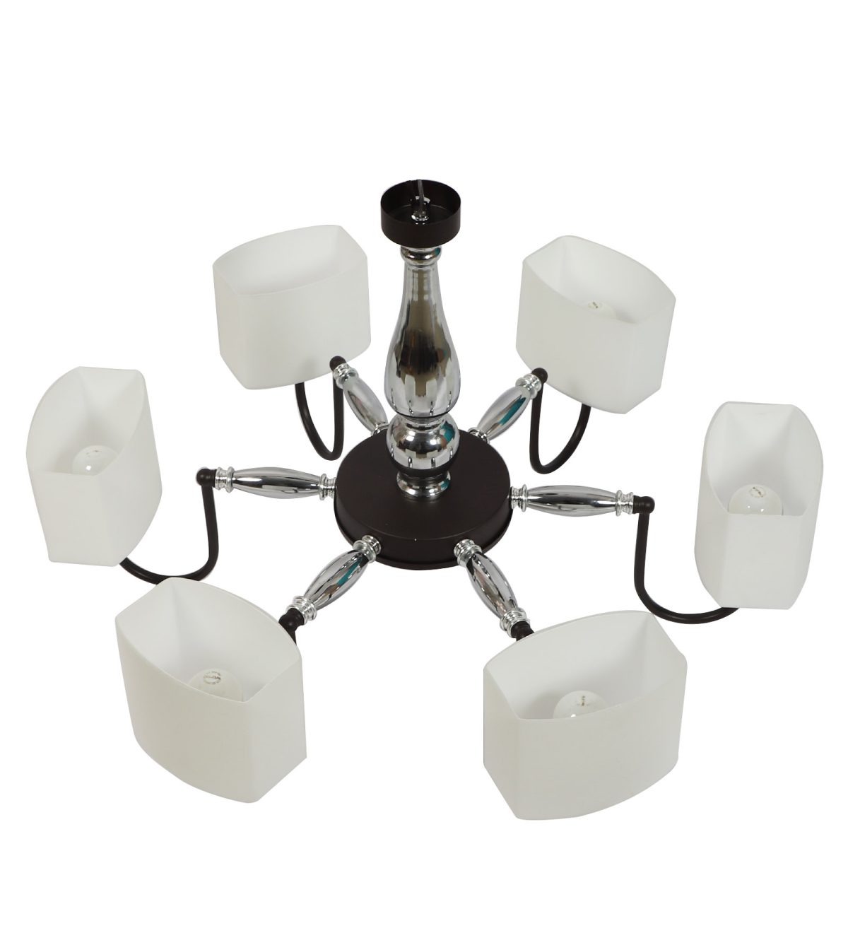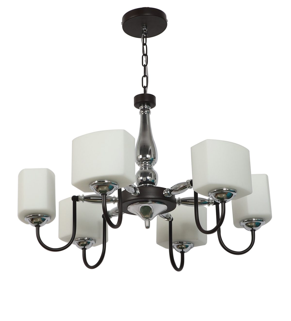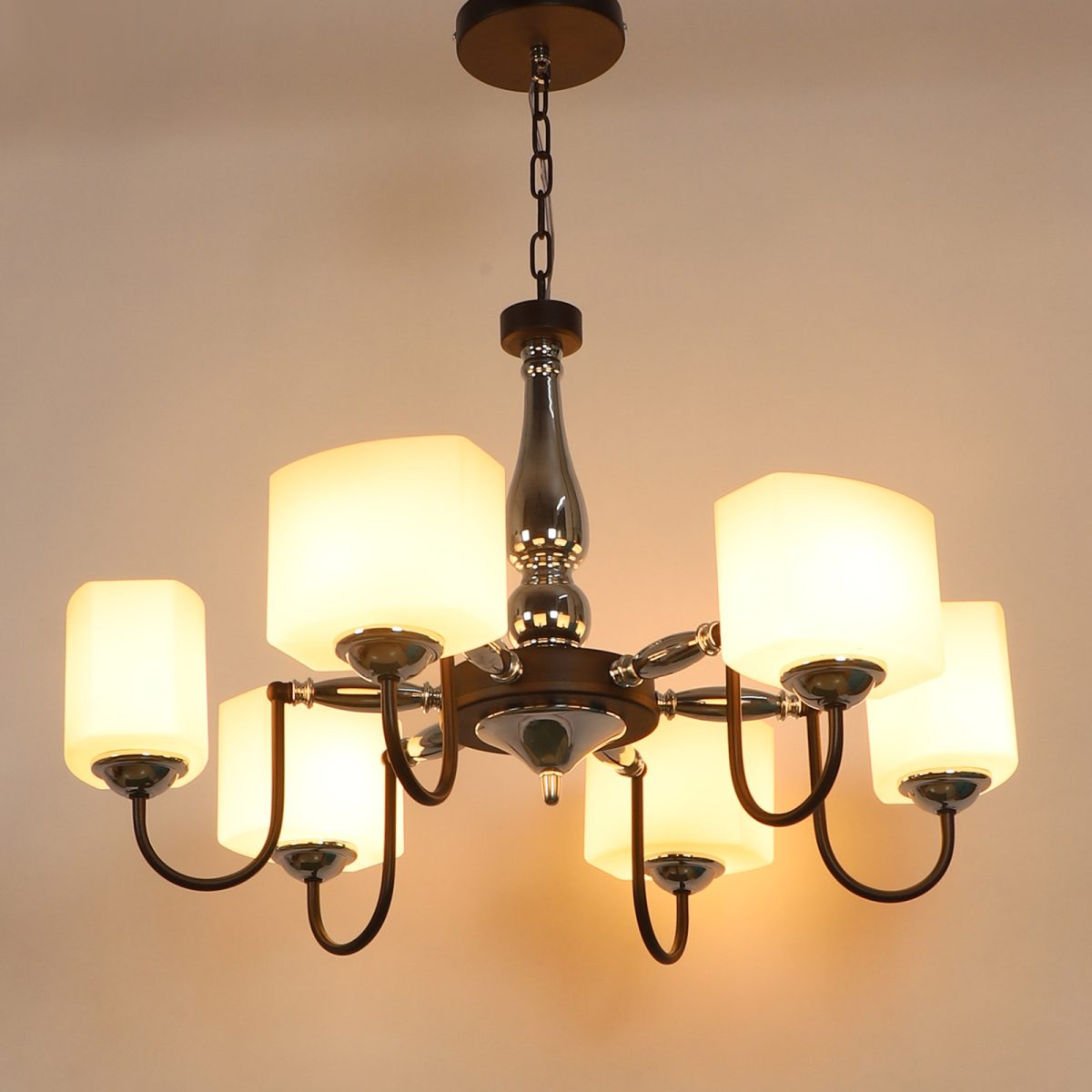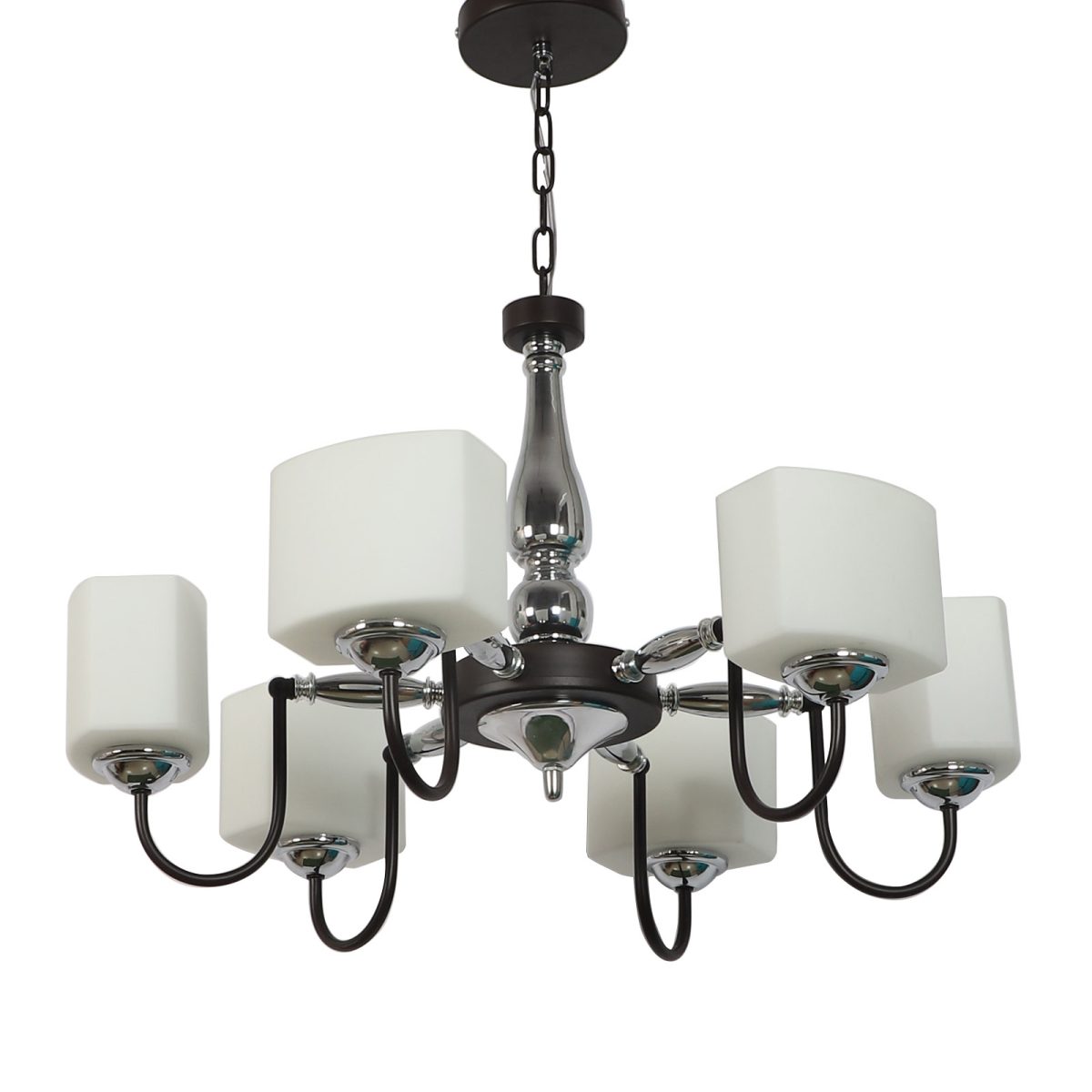 Brown finish chandellier having six lights.The suspension can be adjusted at time of installation to the desired height. It is maintenance free, it is easy to remove glasses and wash them. Comes with an E27 holder. Can be customized as per requirement. Other sizes can be made as per requirement. LAMP NOT INCLUDED.