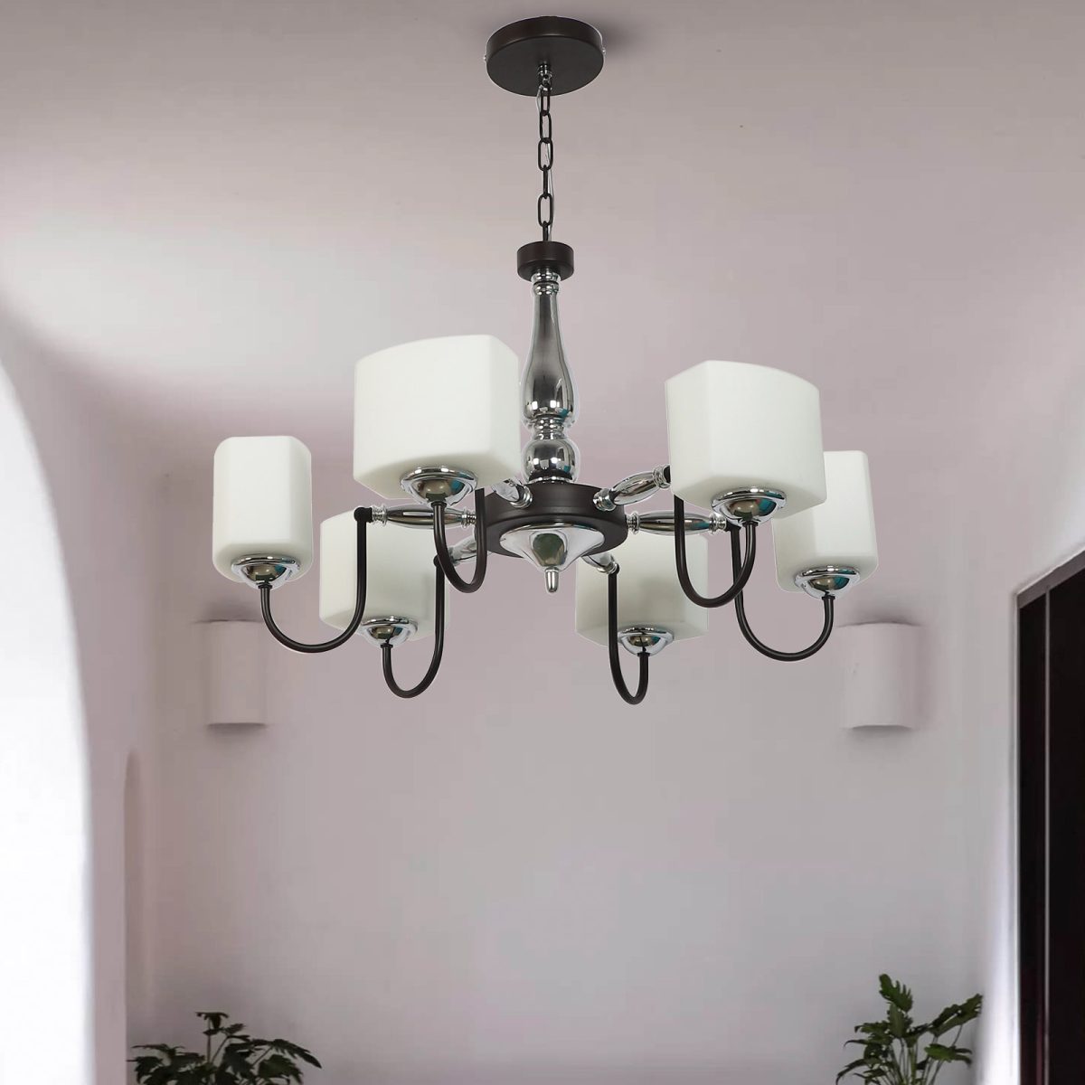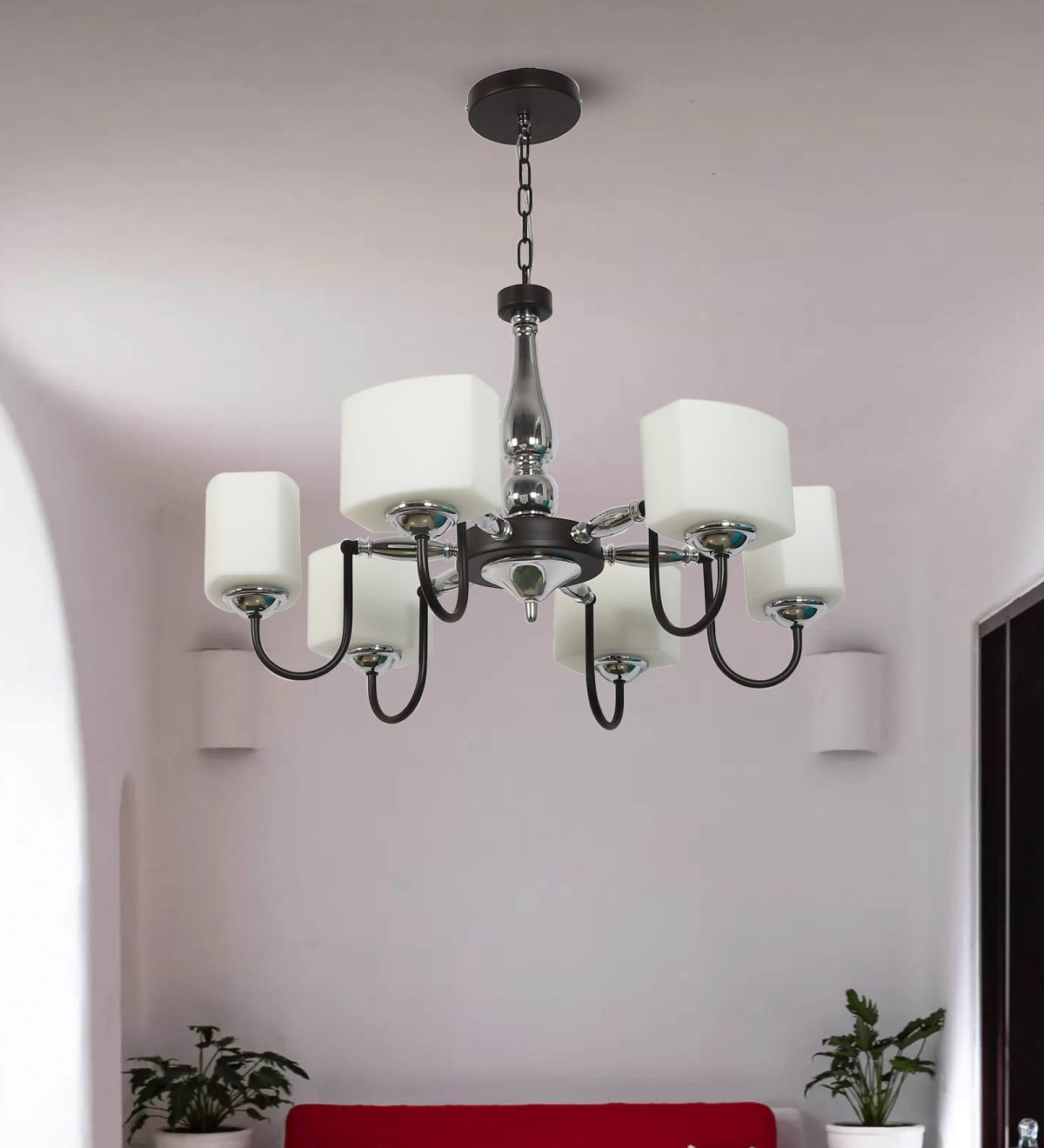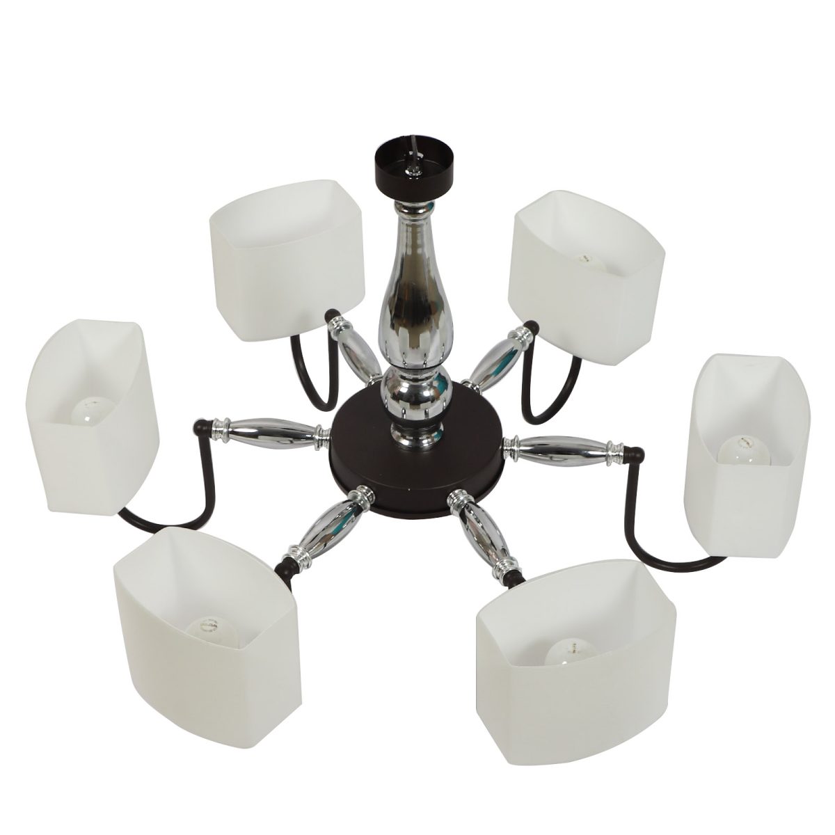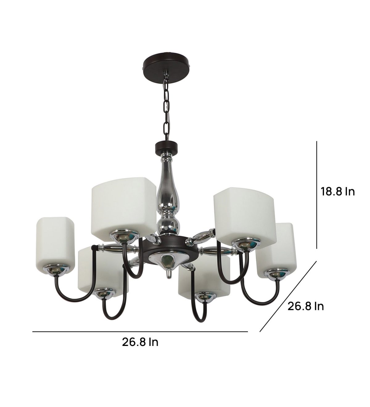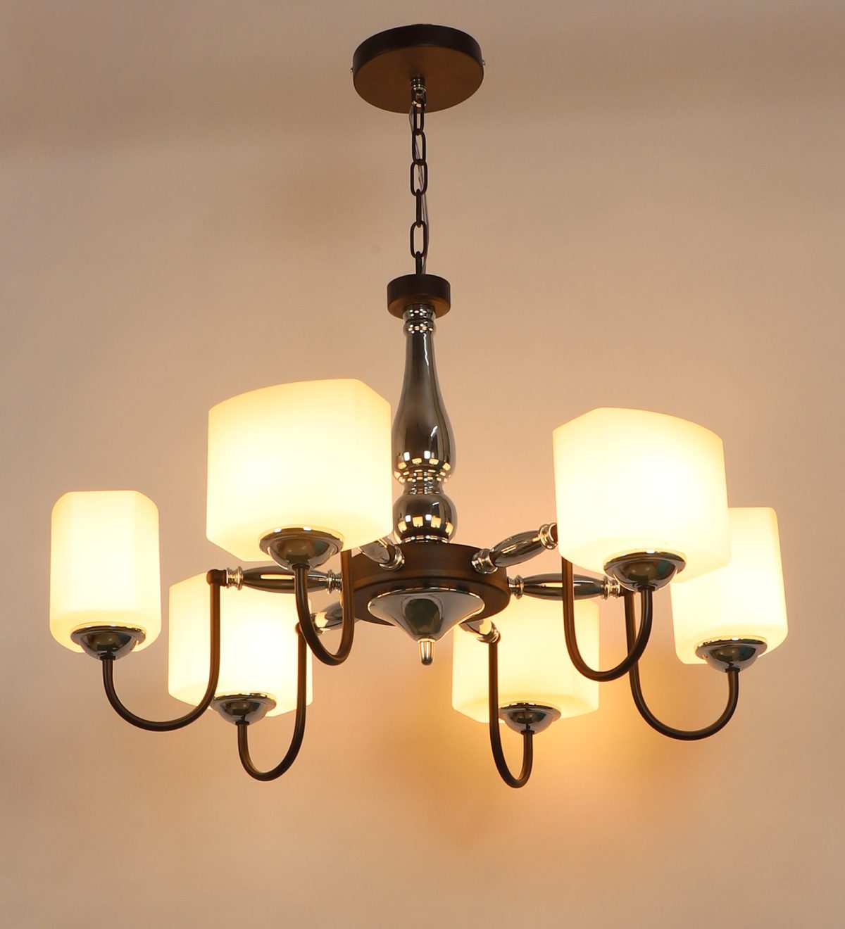 Brown finish chandellier having six lights.The suspension can be adjusted at time of installation to the desired height. It is maintenance free, it is easy to remove glasses and wash them. Comes with an E27 holder. Can be customized as per requirement. Other sizes can be made as per requirement. LAMP NOT INCLUDED.