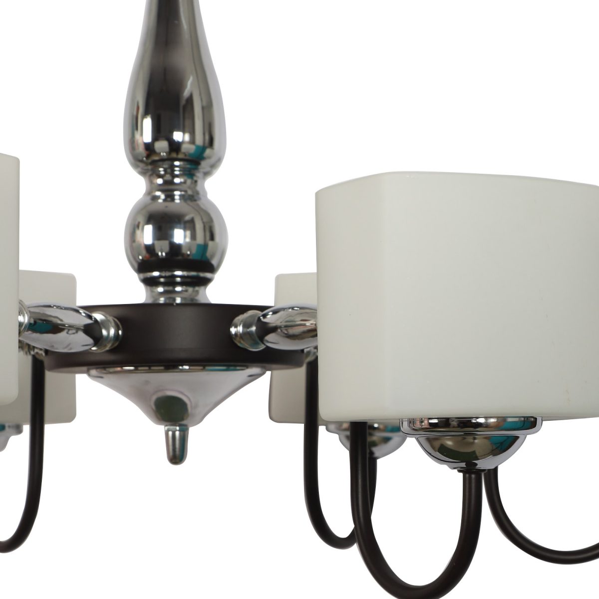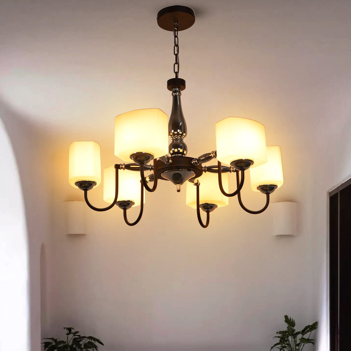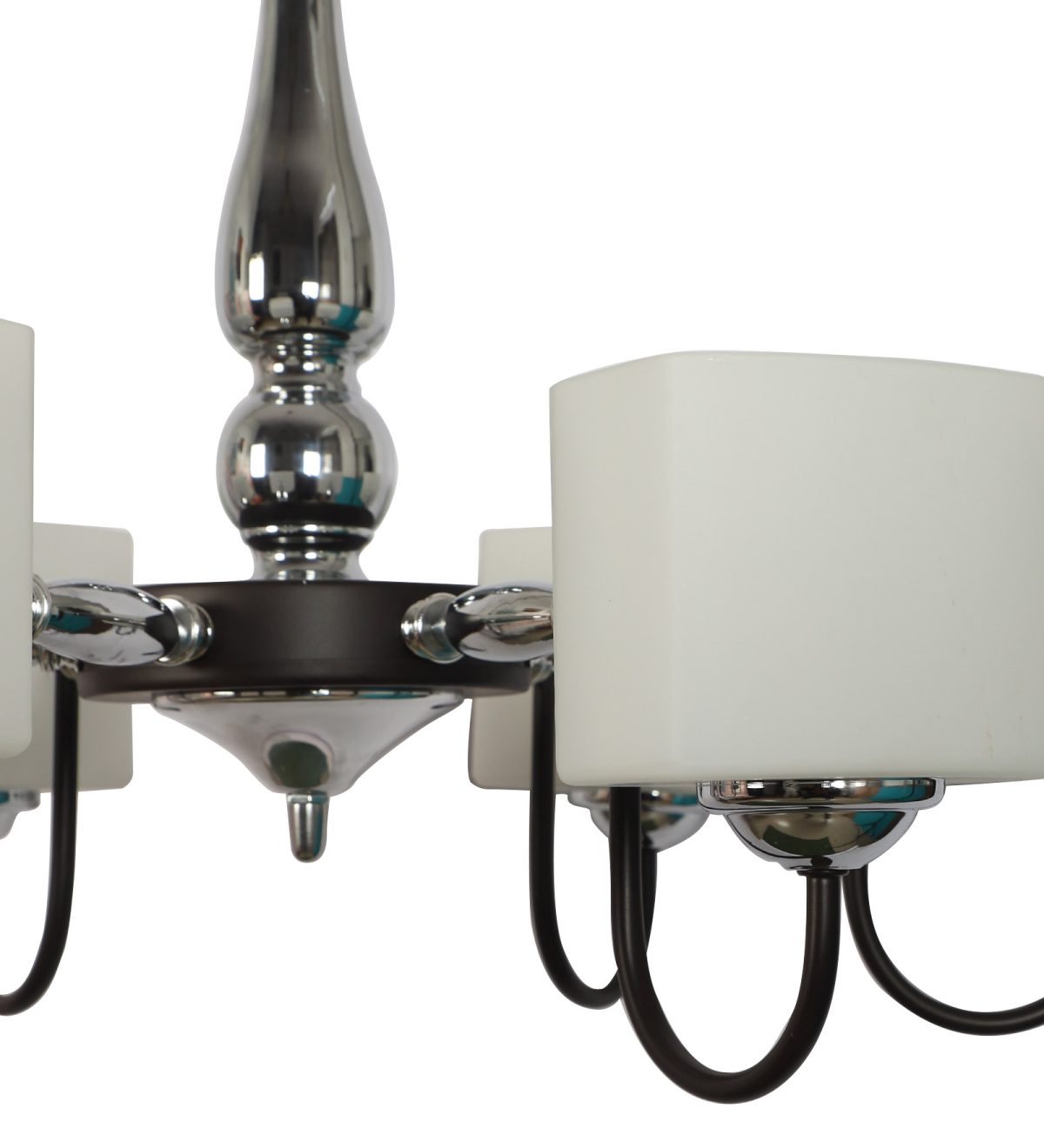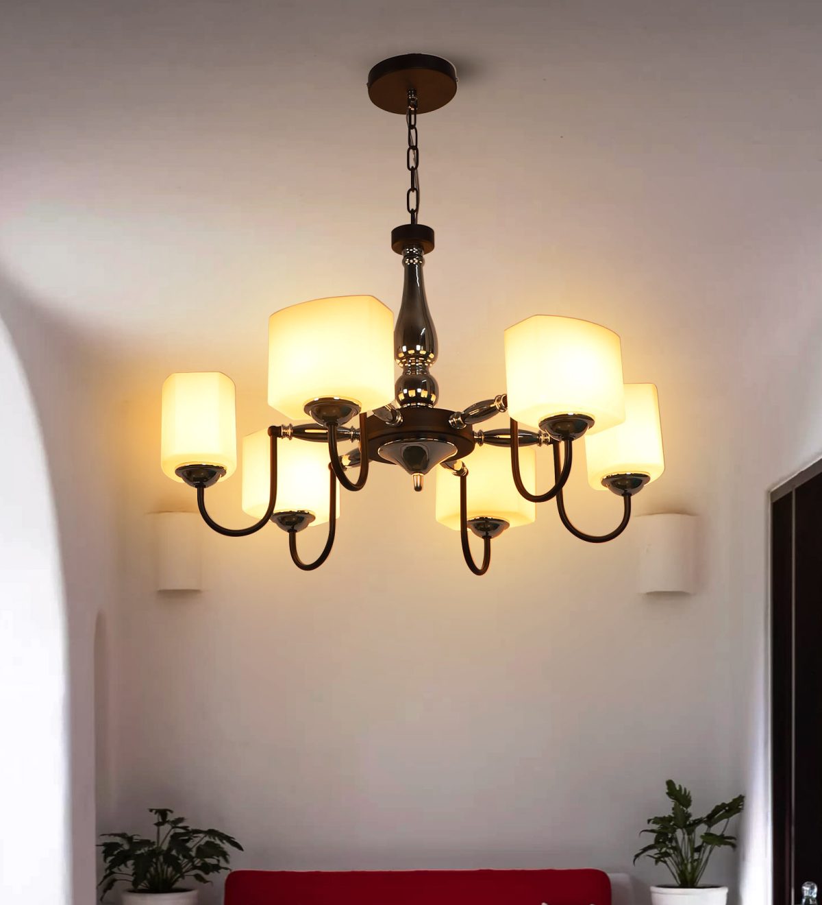 Brown finish chandellier having six lights.The suspension can be adjusted at time of installation to the desired height. It is maintenance free, it is easy to remove glasses and wash them. Comes with an E27 holder. Can be customized as per requirement. Other sizes can be made as per requirement. LAMP NOT INCLUDED.