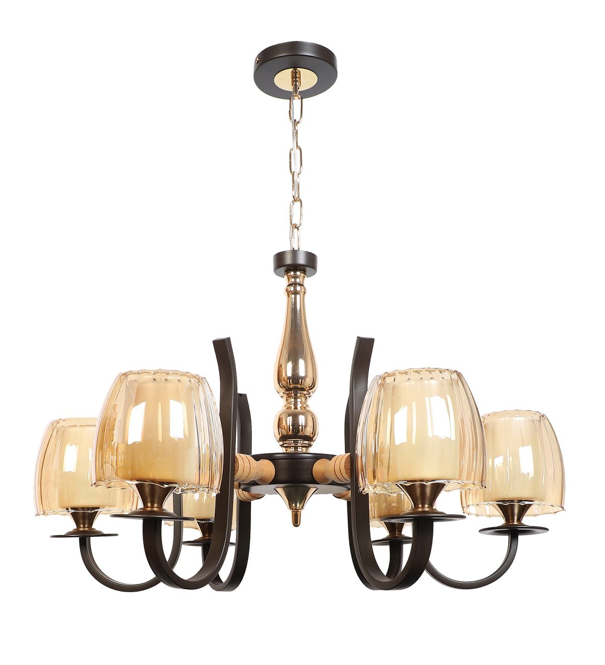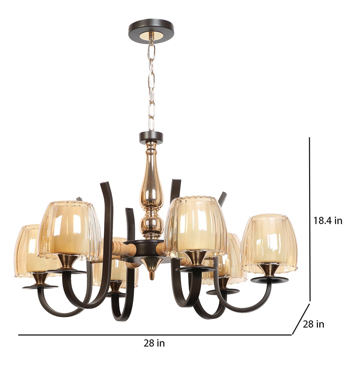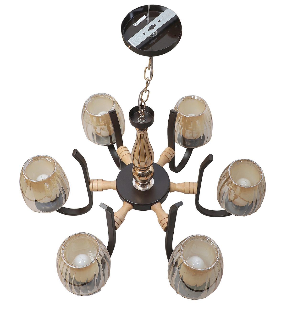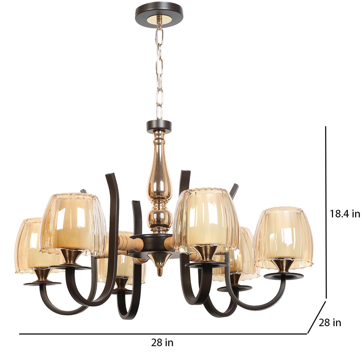 Gold and brown finish chandellier having six lights.The suspension can be adjusted at time of installation to the desired height. It is maintenance free, it is easy to remove glasses and wash them. Comes with an E27 holder.Can be customized as per requirement. Other sizes can be made as per requirement. LAMP NOT INCLUDED.