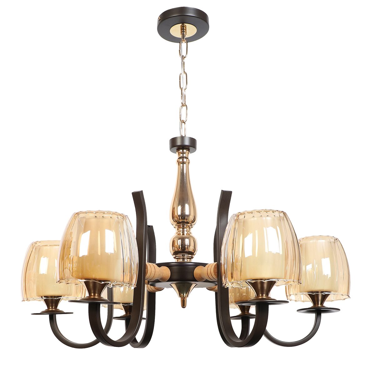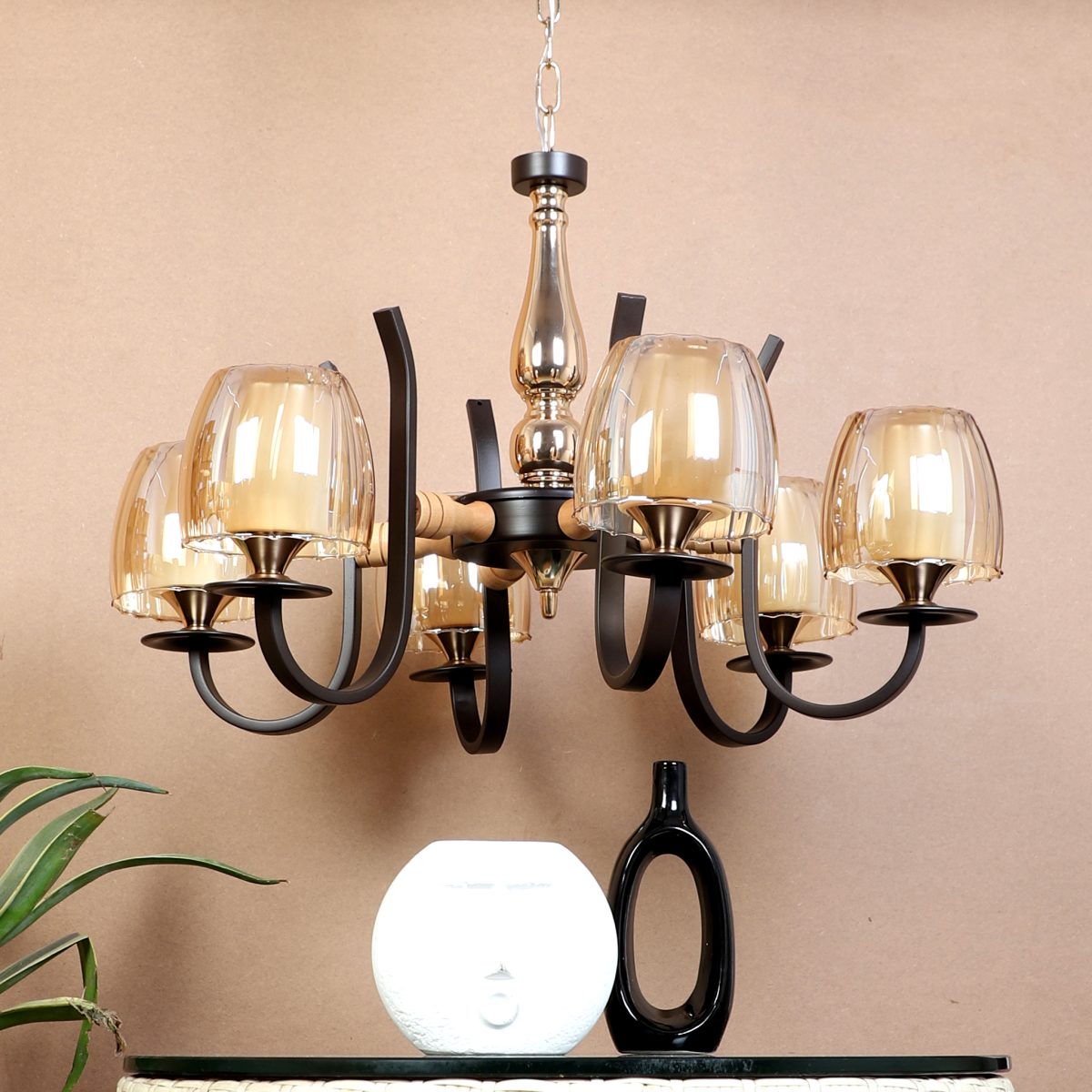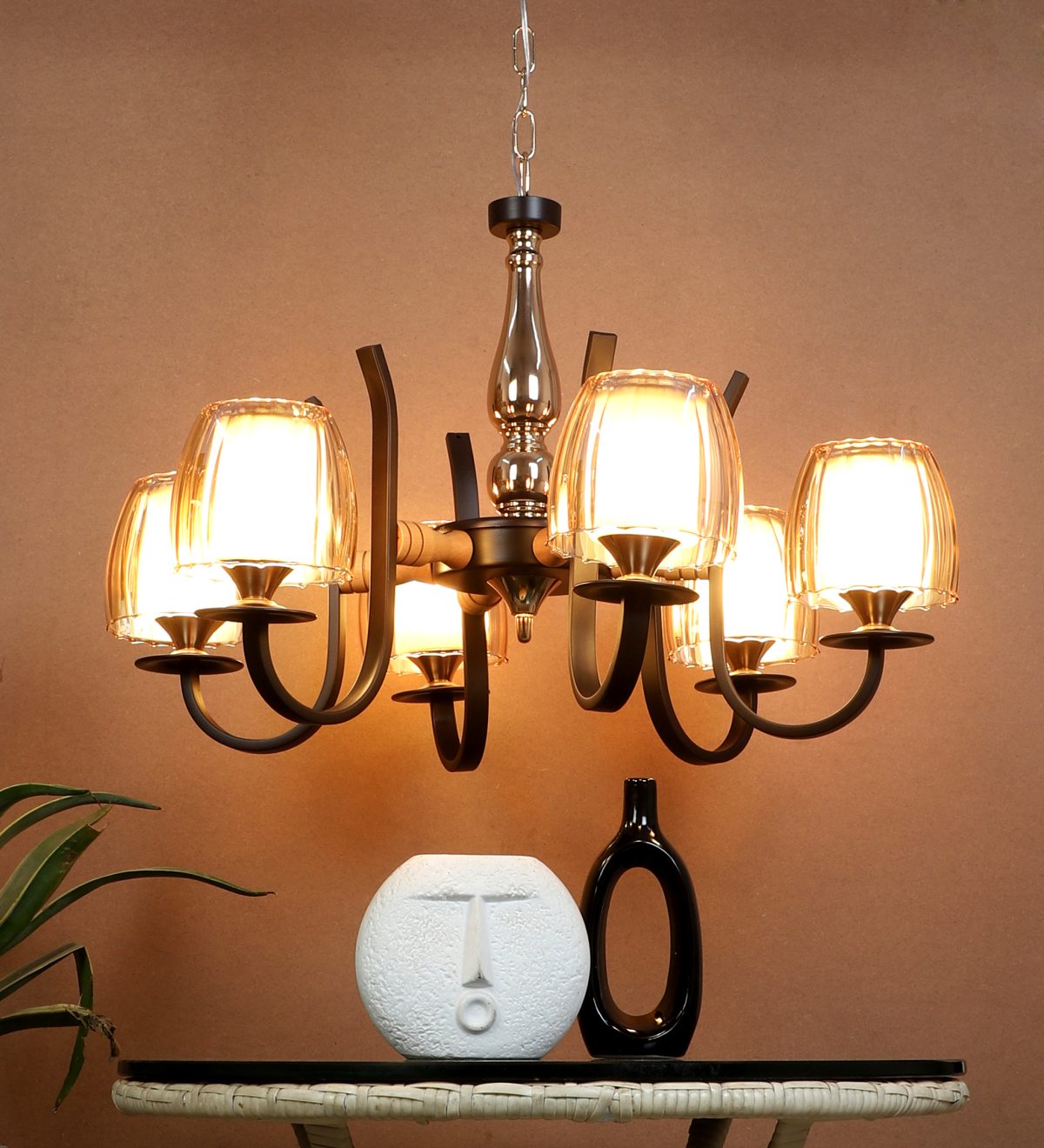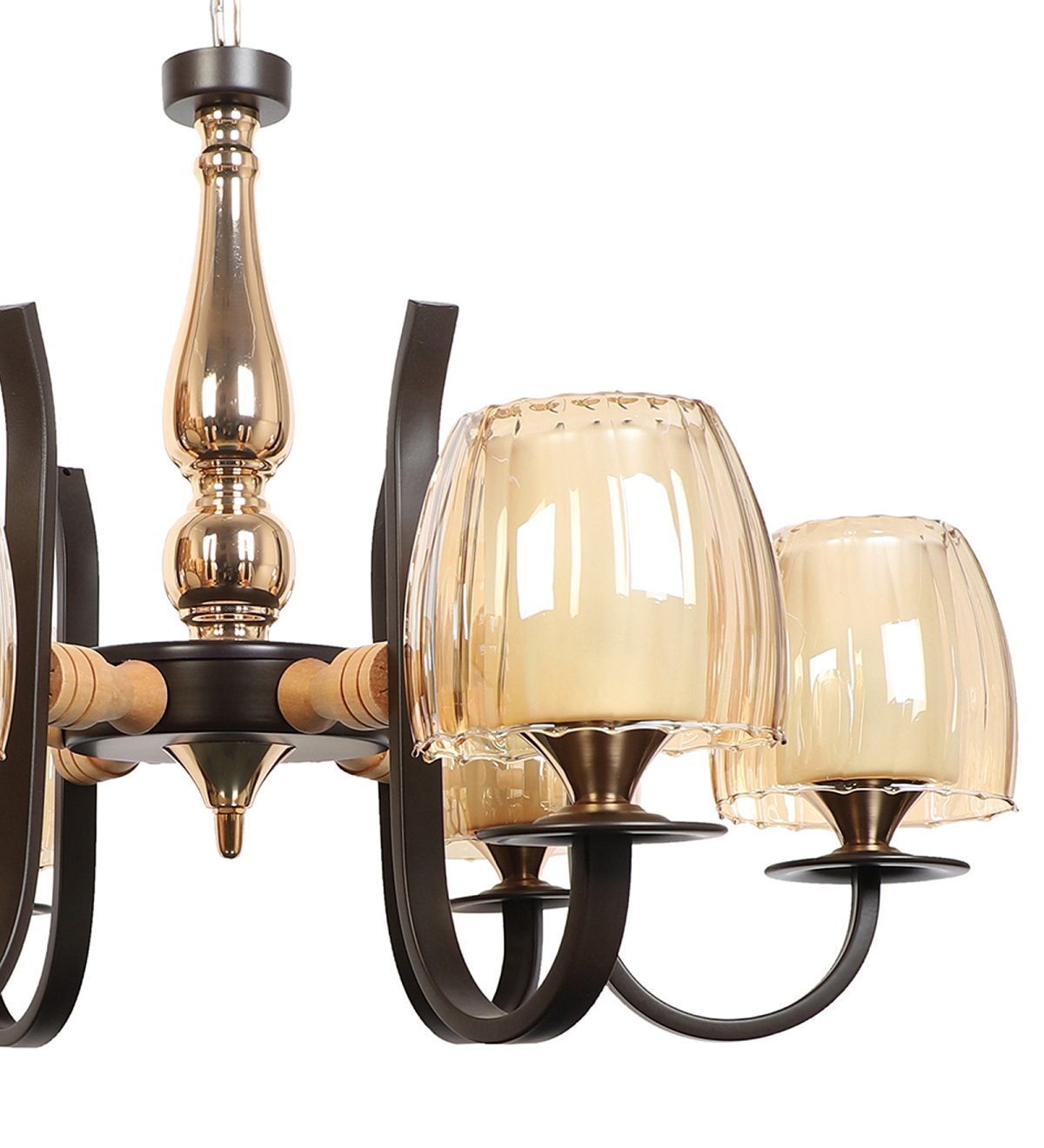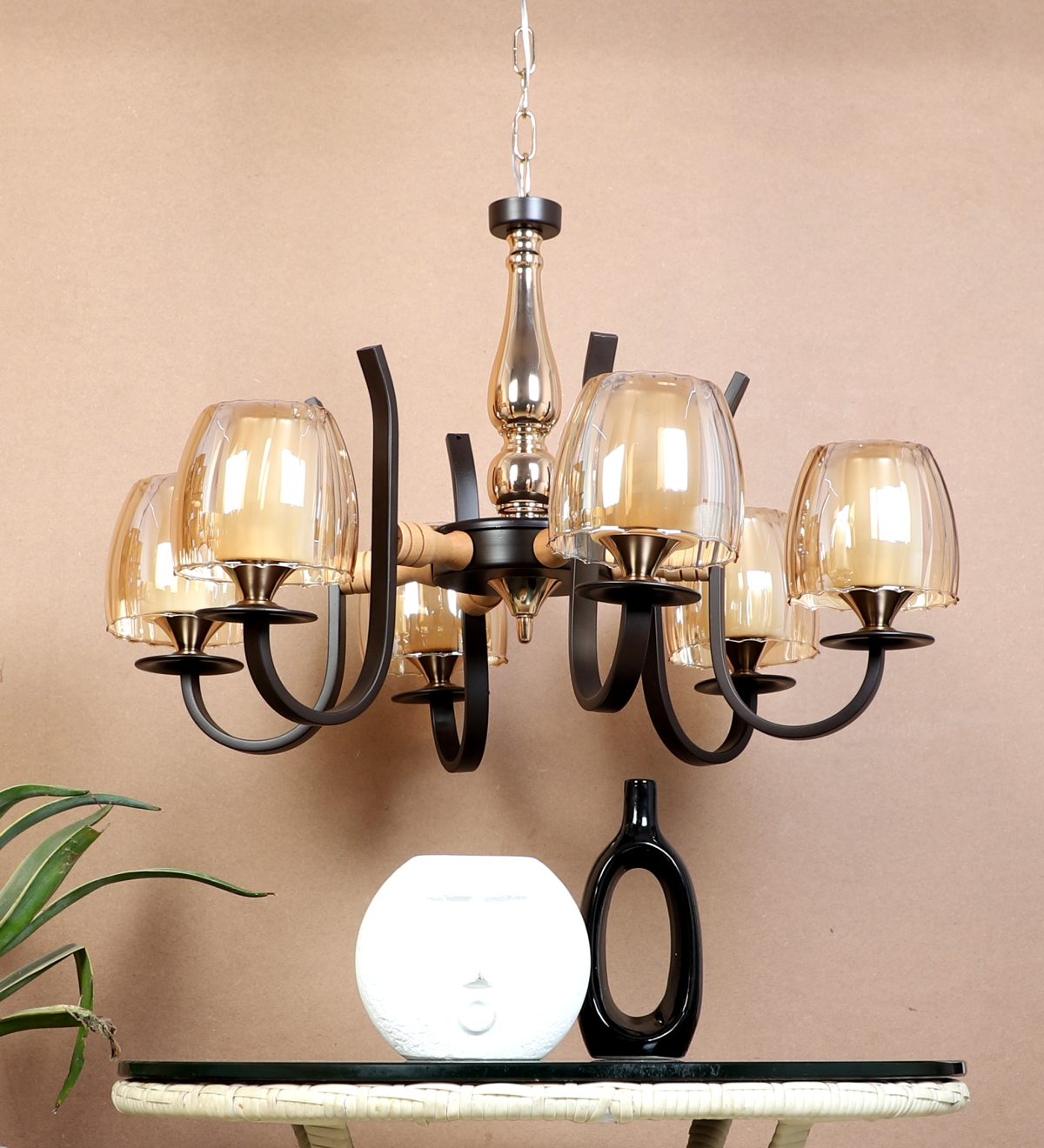 Gold and brown finish chandellier having six lights.The suspension can be adjusted at time of installation to the desired height. It is maintenance free, it is easy to remove glasses and wash them. Comes with an E27 holder.Can be customized as per requirement. Other sizes can be made as per requirement. LAMP NOT INCLUDED.