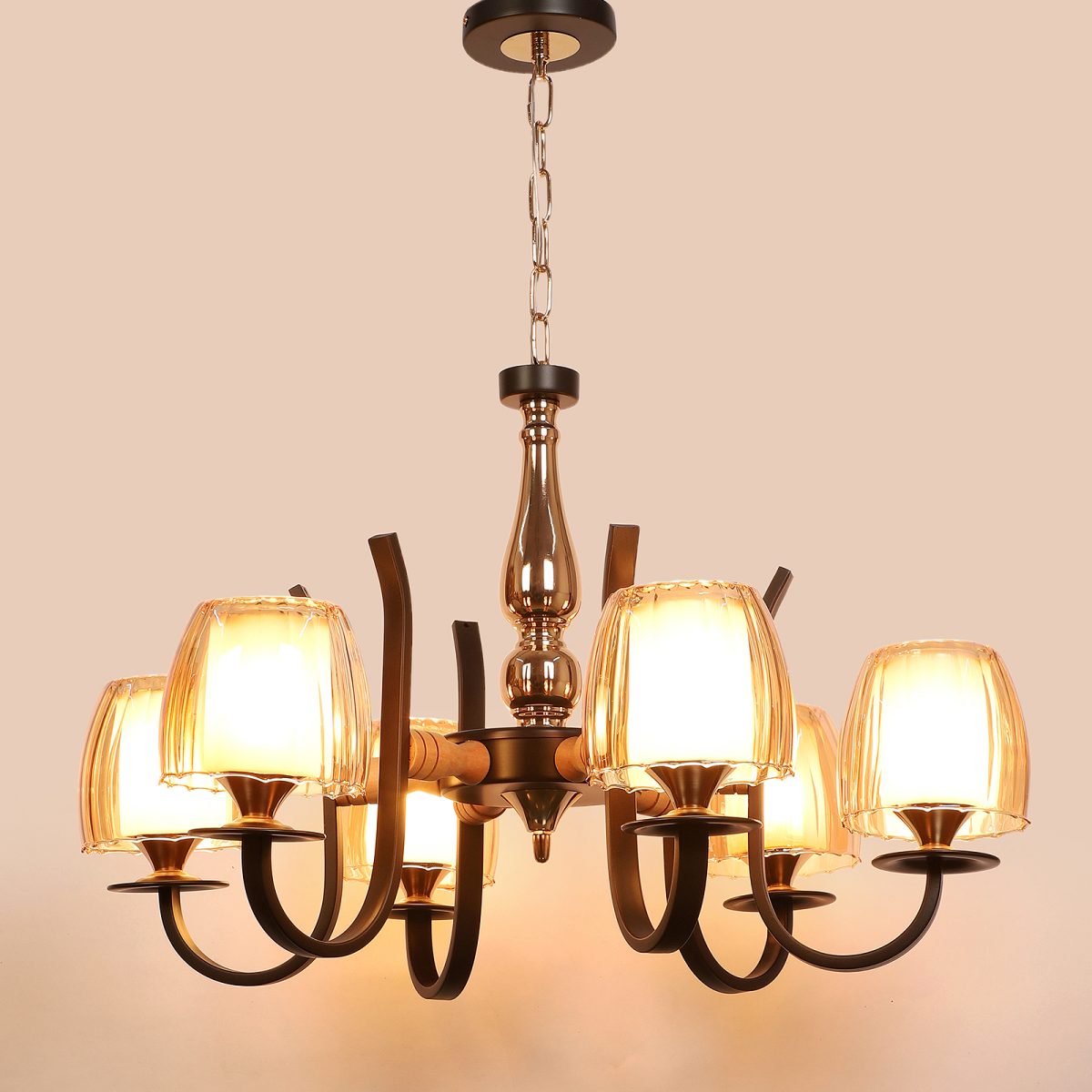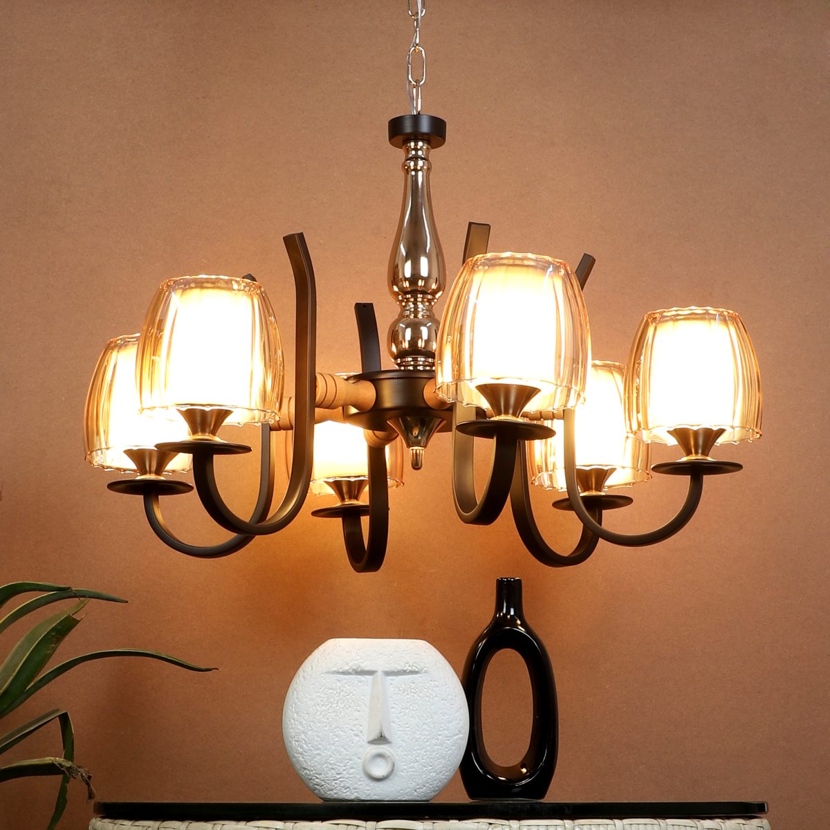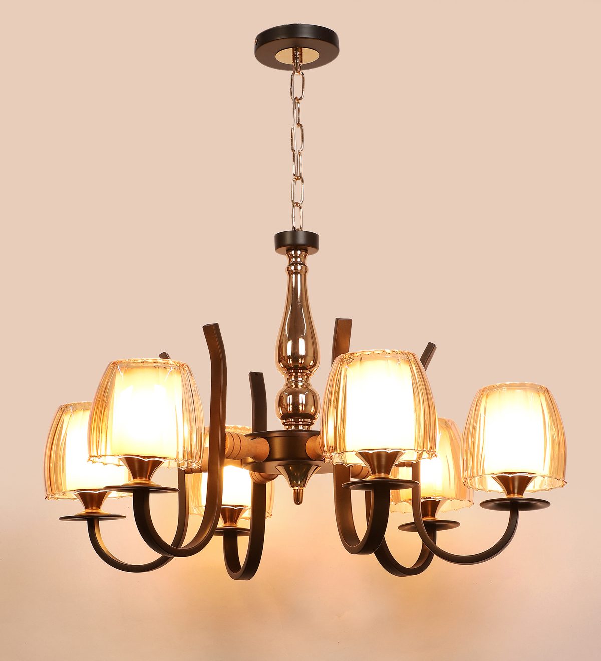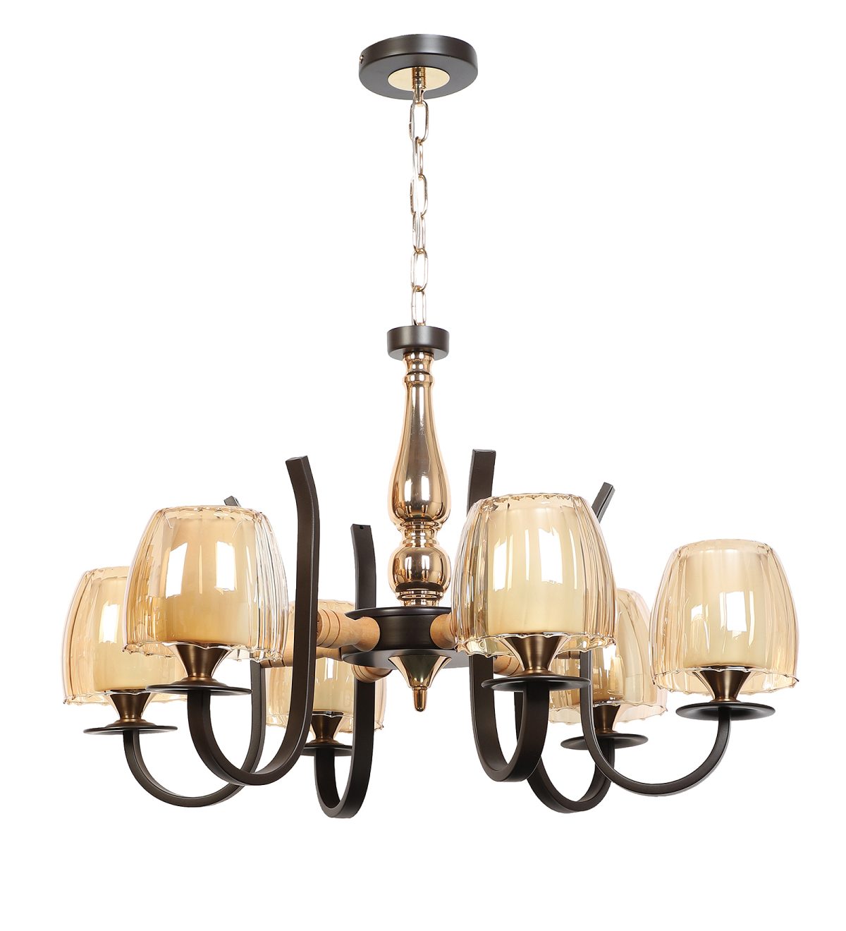 Gold and brown finish chandellier having six lights.The suspension can be adjusted at time of installation to the desired height. It is maintenance free, it is easy to remove glasses and wash them. Comes with an E27 holder.Can be customized as per requirement. Other sizes can be made as per requirement. LAMP NOT INCLUDED.