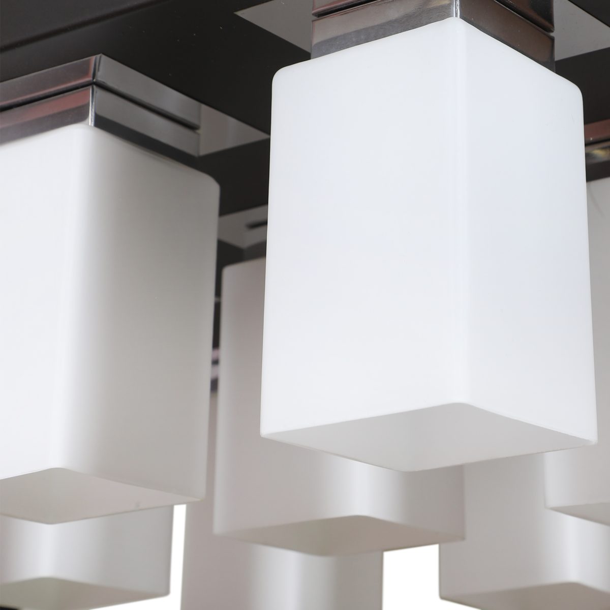 Dark brown(wood – chrome) finish, square long glass mounted on a mild steel plate having nine lamps made of mild steel and glass. It is one of the regular design which is never out of trend and is among one of the best sellers. The suspension can be adjusted at time of installation to the desired height. It is maintenance free, easy to remove glass and wash them, comes with an E27 holder, only the change of lamp is required, which is available locally everywhere. Application includes both residential and commercial premises wherever it matches with your interiors. Other variations (color and size) in hanging light – HL3678, HL3679, HL3651. Related chandeliers – CH188, CH189, CH172, CH173. Matching wall light code -WL1775, WL1776. Lamp not included.