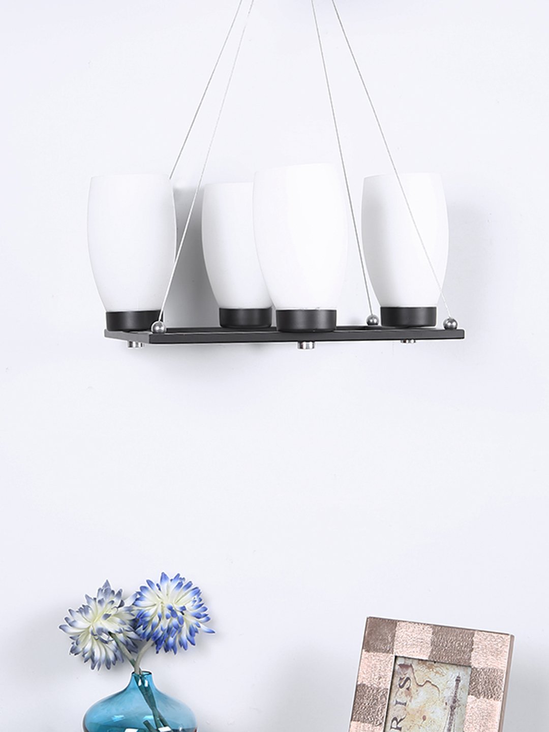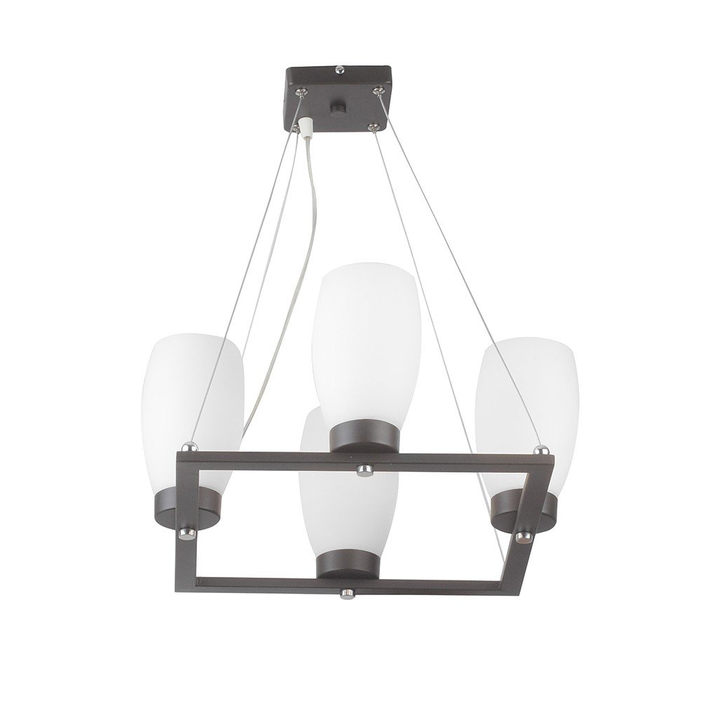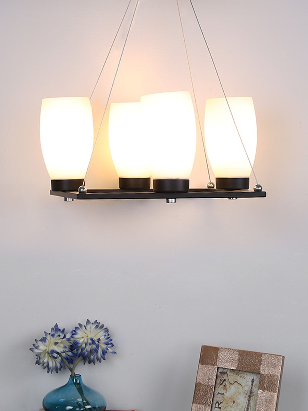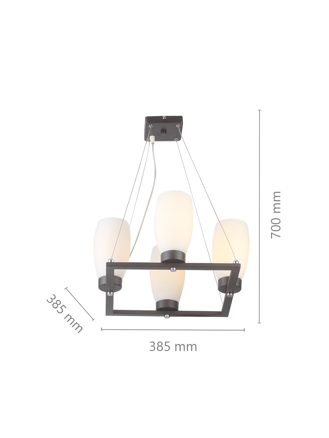 Dark brown (wood) finish modern taper long glass mounted on a mild steel square ring having four lamps made of mild steel and glass. The suspension can be adjusted at time of installation to the desired height. It is maintenance free, easy to remove glass and wash them, comes with an E27 holder, only the change of lamp is required, which is available locally everywhere. Application includes both residential and commercial premises wherever it matches with your interiors. Also available in Silver (satin nickel) finish with code HL4057. Lamp not included.