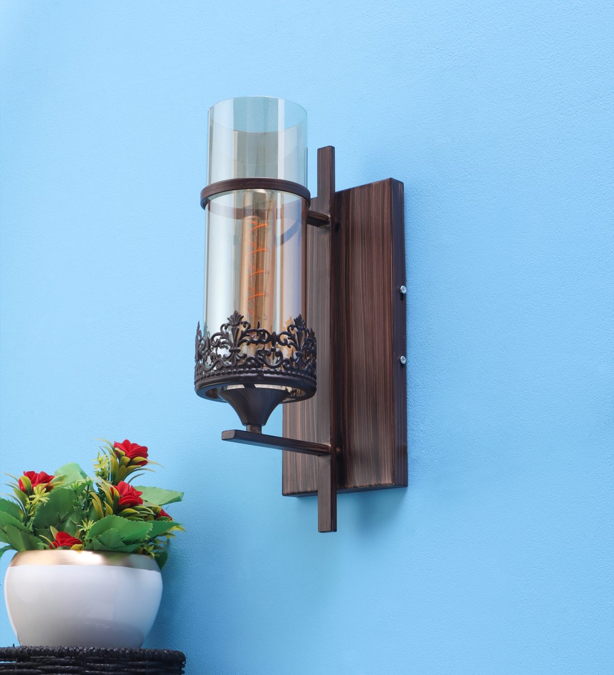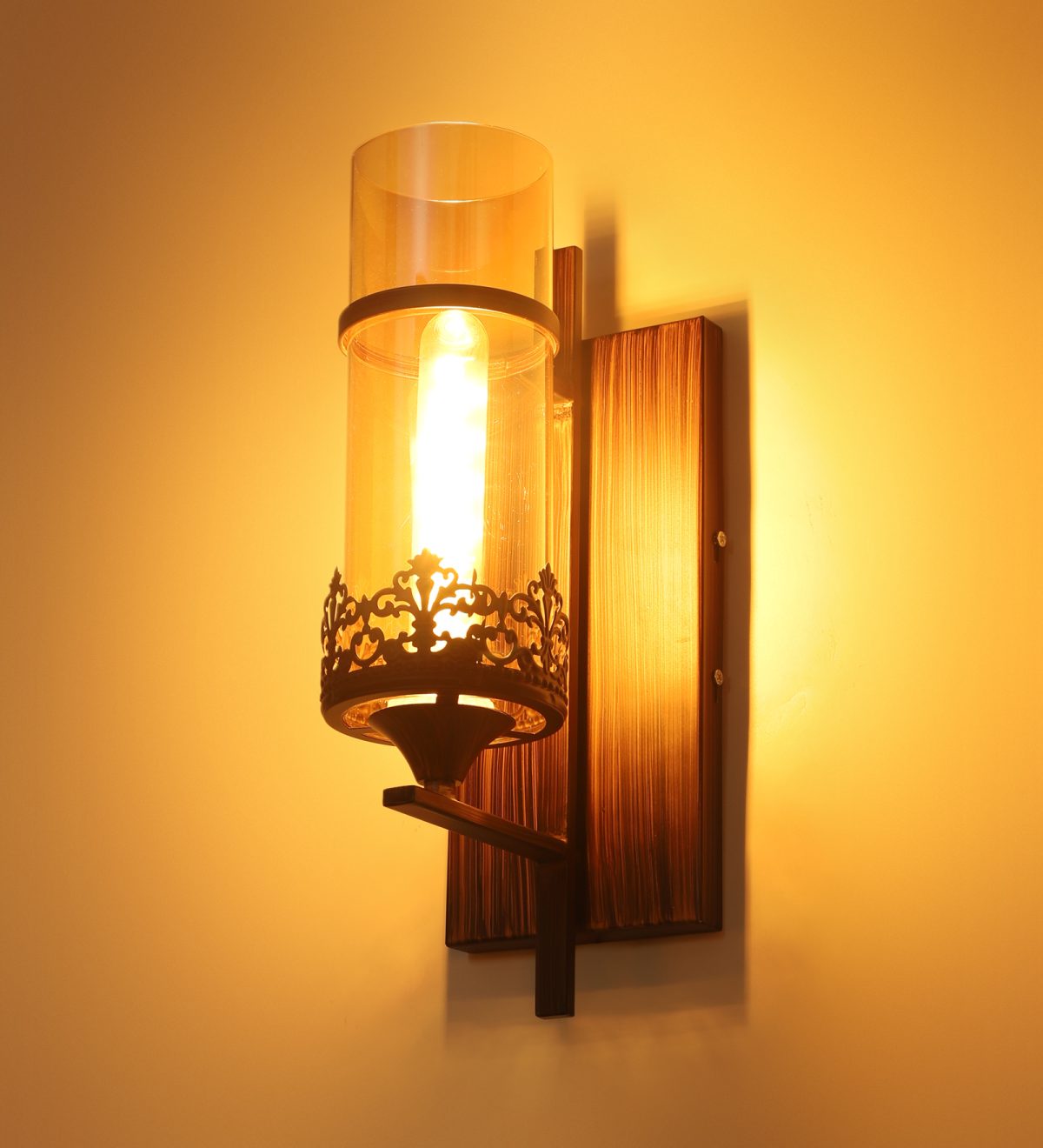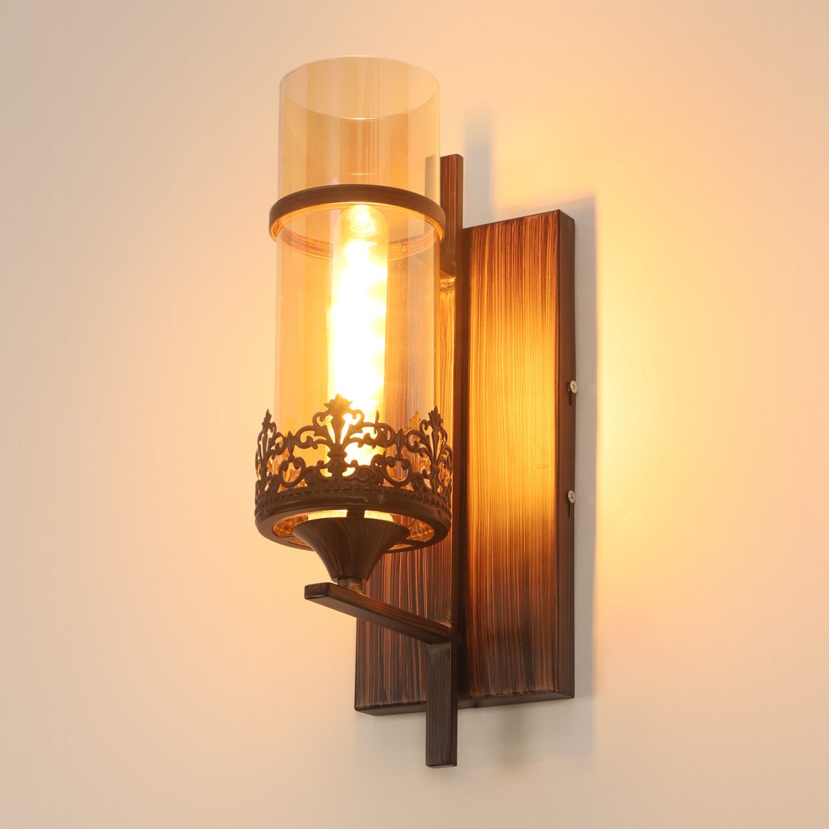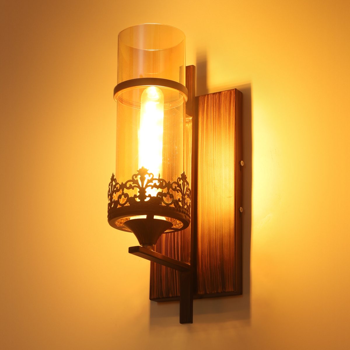 Brown (wood) finish single wall light having round, cylindrical Champaign colored glass mounted on a designer frame made of mild steel . It is maintenance free, it is easy to remove glass and wash it. Comes with an E27 holder, only the change of lamp is required, which is available locally everywhere. Application includes both residential and commercial premises wherever it matches with your interiors. Matching double wall light code – WL2317. Matching hanging light code – HL4083. Matching chandelier code – CH392. Can be customized as per requirement in case of bulk quantities. This along with its variants are the best selling products in our catalogue. Lamp not included.