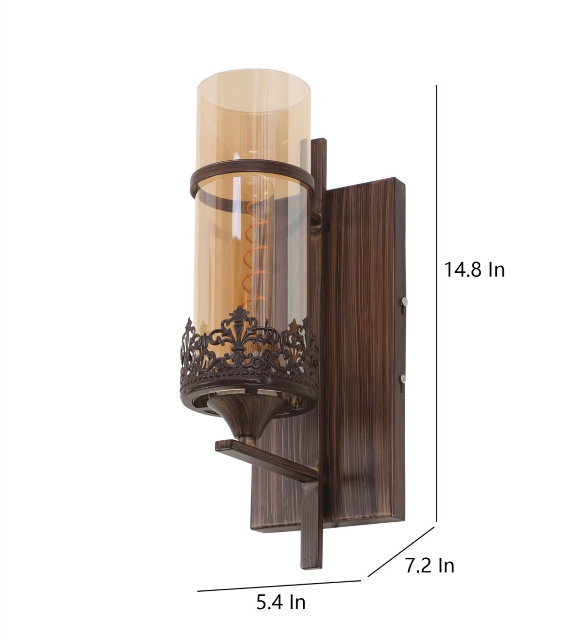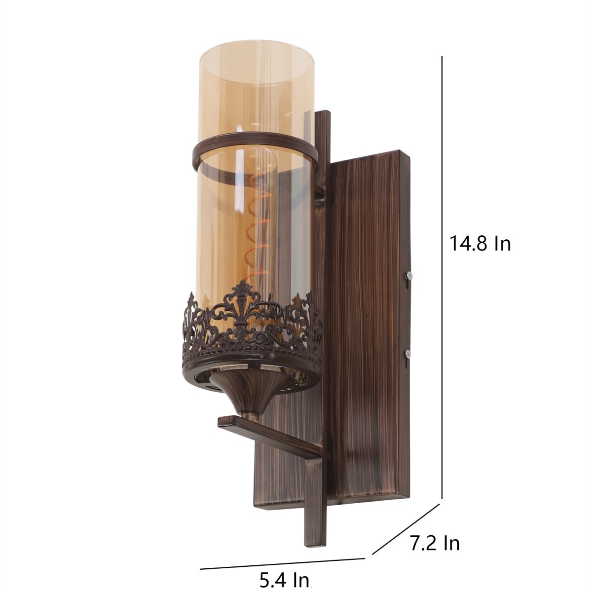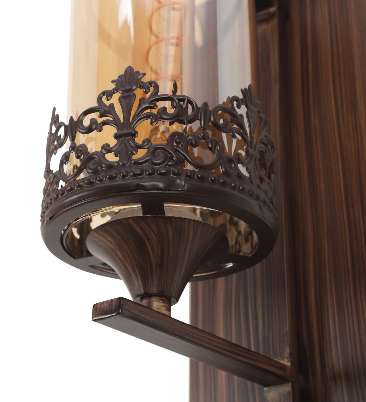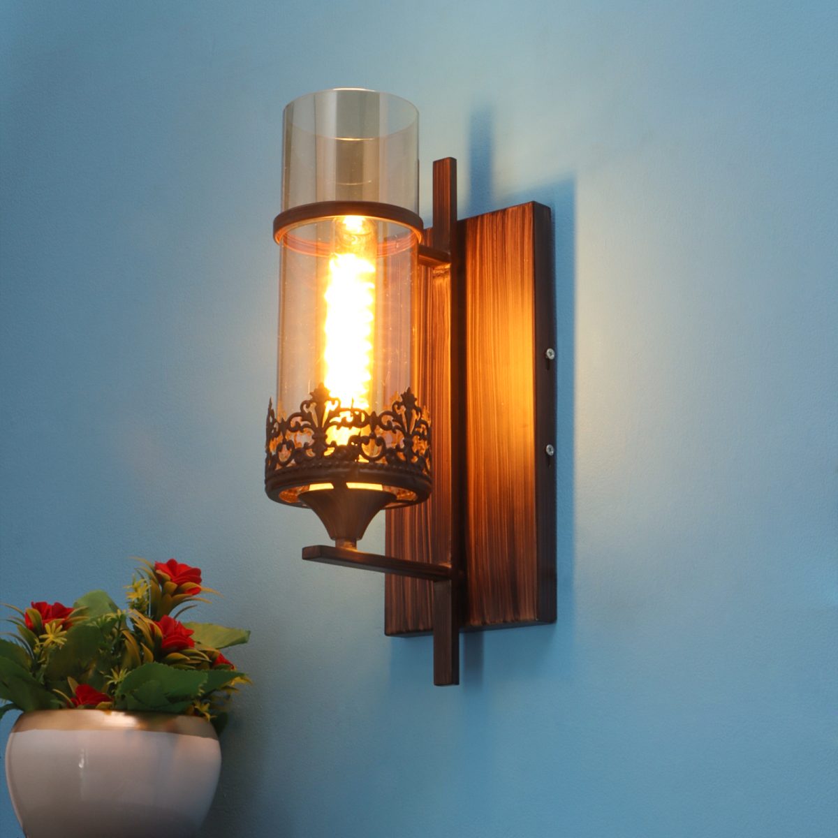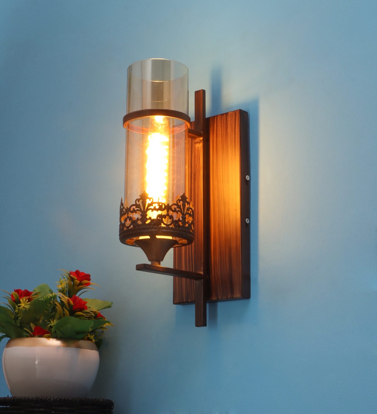 Brown (wood) finish single wall light having round, cylindrical Champaign colored glass mounted on a designer frame made of mild steel . It is maintenance free, it is easy to remove glass and wash it. Comes with an E27 holder, only the change of lamp is required, which is available locally everywhere. Application includes both residential and commercial premises wherever it matches with your interiors. Matching double wall light code – WL2317. Matching hanging light code – HL4083. Matching chandelier code – CH392. Can be customized as per requirement in case of bulk quantities. This along with its variants are the best selling products in our catalogue. Lamp not included.