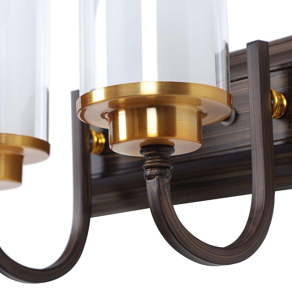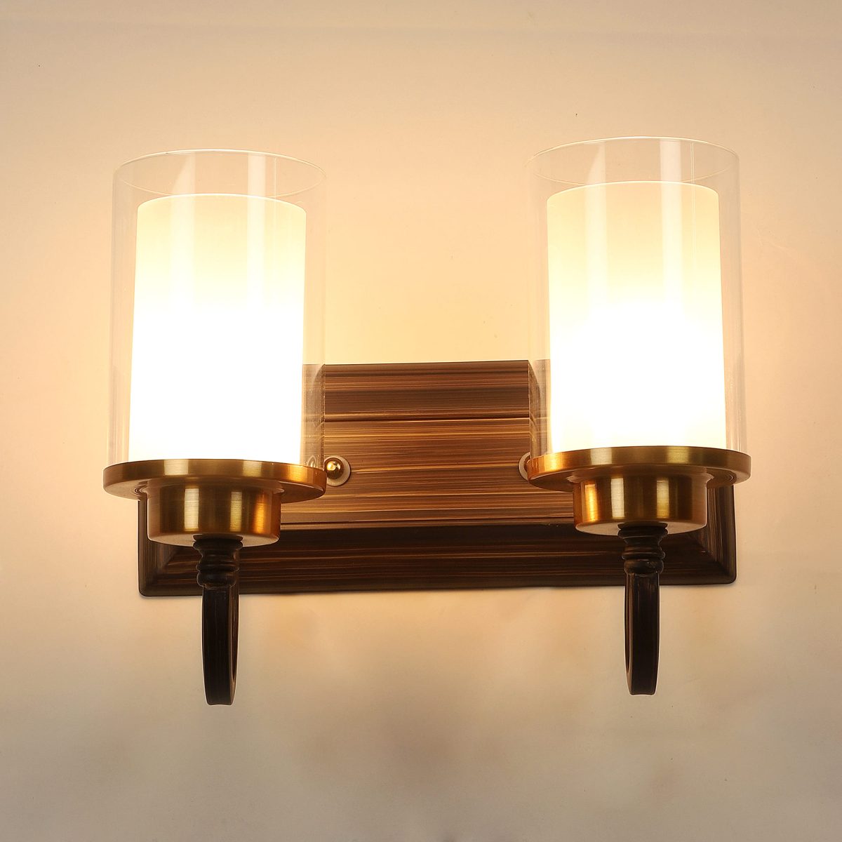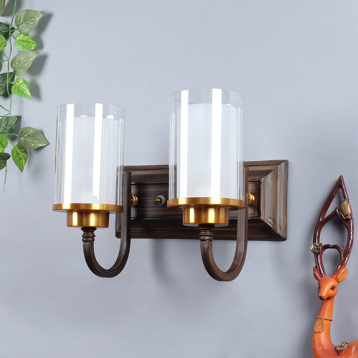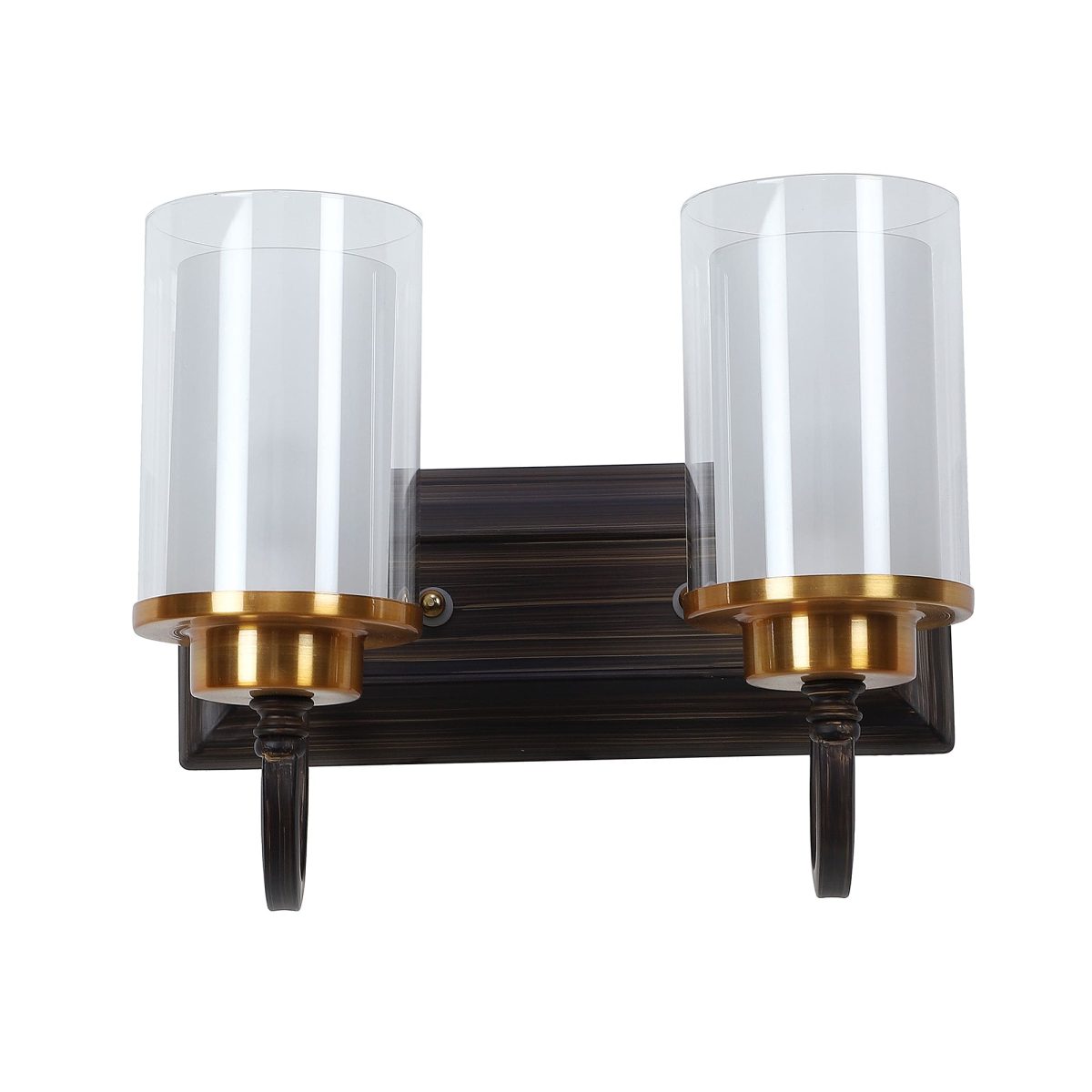 Dark brown (wood), gold finish double wall light made of mild steel, with a round cylindrical long two layered glasses. It is maintenance free, easy to remove glass and wash it, comes with an E27 holder, only the change of lamp is required, which is available locally everywhere. You can of course swap out the bulb for one that is dimmable, has a higher light output or a different color temperature. Application includes both residential and commercial premises wherever it matches with your interiors. Matching single wall light code – WL2405. Can be customized as per requirement in case of bulk quantities. Lamp not included.
