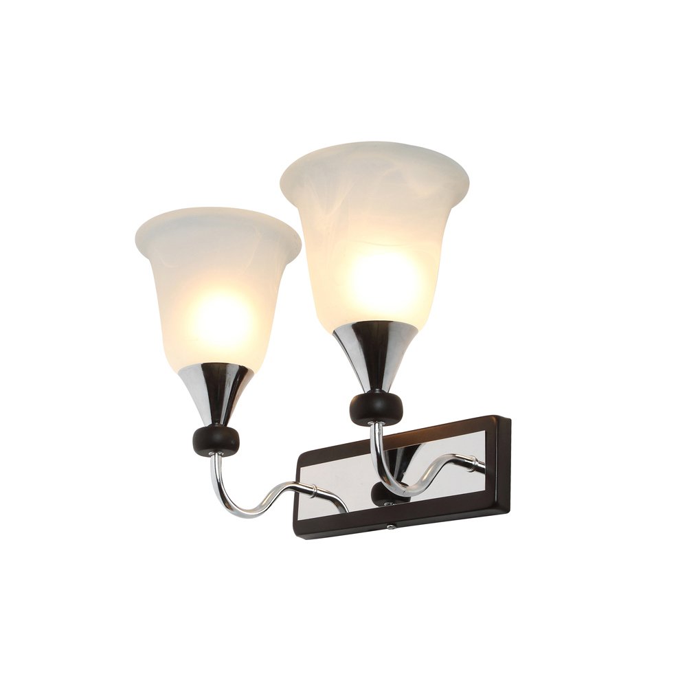 Dark brown silver (wood chrome) finish double wall light made of mild steel, with a bell shaped long white textured glass. Looks amazing when lit. It is maintenance free, easy to remove glass and wash it, comes with an E27 holder, only the change of lamp is required, which is available locally everywhere. You can of course swap out the bulb for one that is dimmable, has a higher light output or a different color temperature. Application includes both residential and commercial premises wherever it matches with your interiors. Matching single wall light code – WL2453. Can be customized as per requirement in case of bulk quantities. Lamp not included.