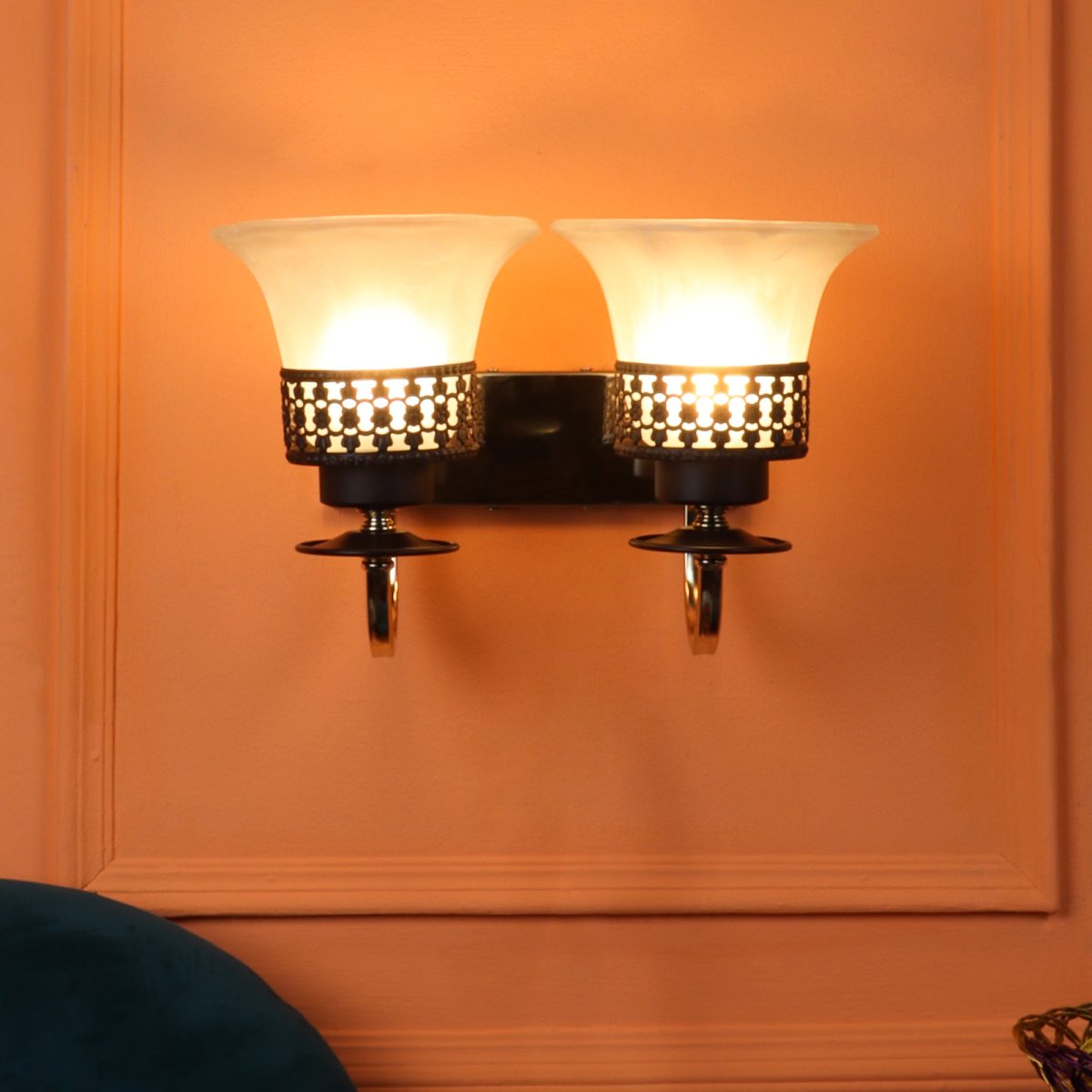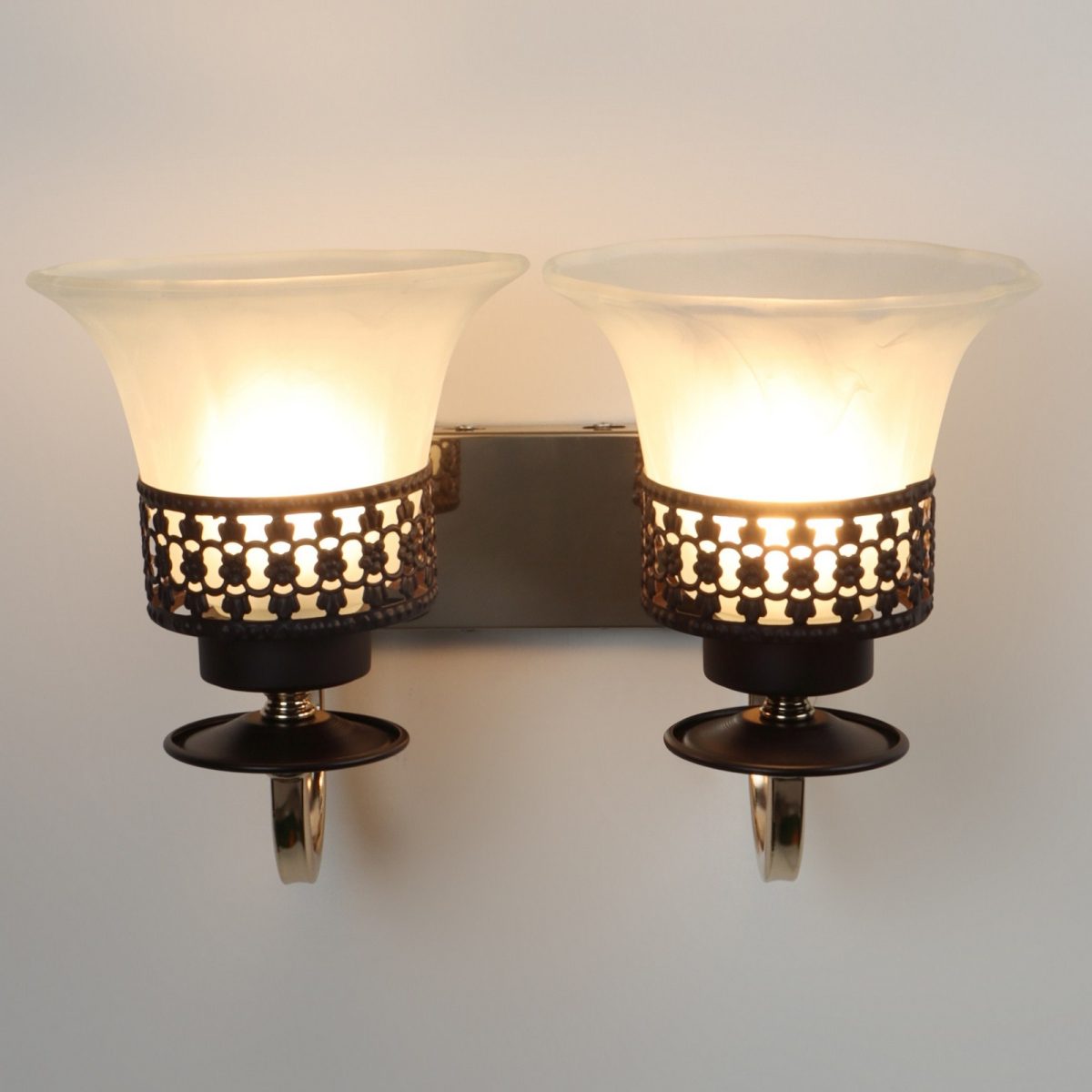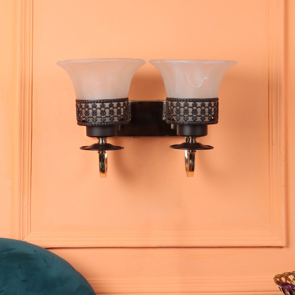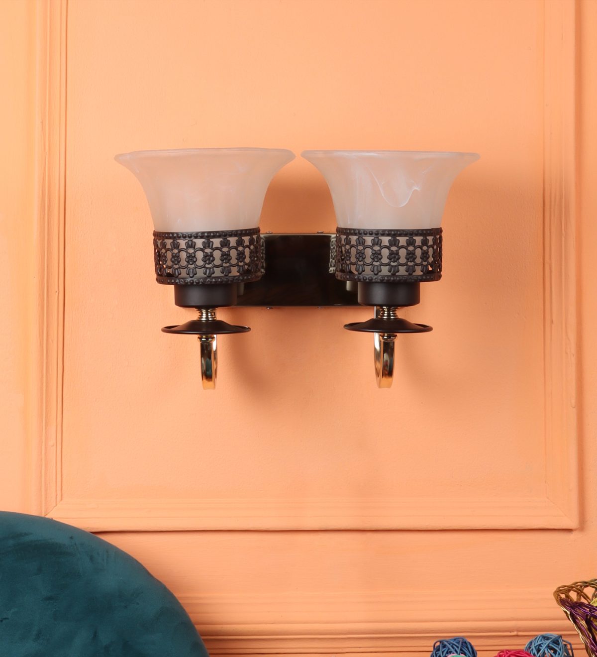 Brown, gold finish double wall light having round, cylindrical two layered champaign coloured glass. It is maintenance free, easy to remove glasses and wash them, comes with an E27 holder, only the change of lamp is required, which is available locally everywhere. Application includes both residential and commercial premises wherever it matches with your interiors. Matching single wall light code – WL2699. Can be customized as per requirement in case of bulk quantity, LAMP NOT INCLUDED.